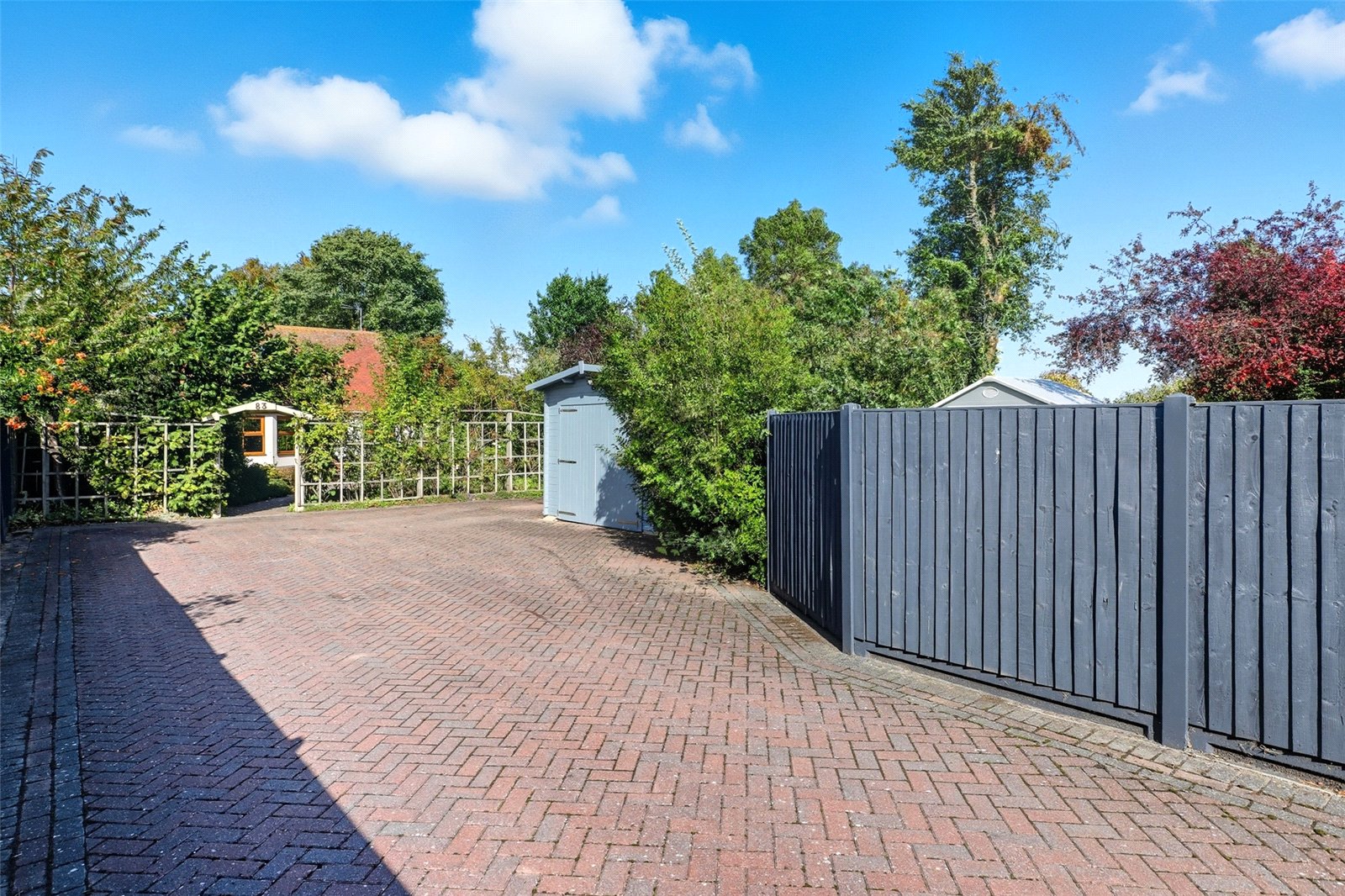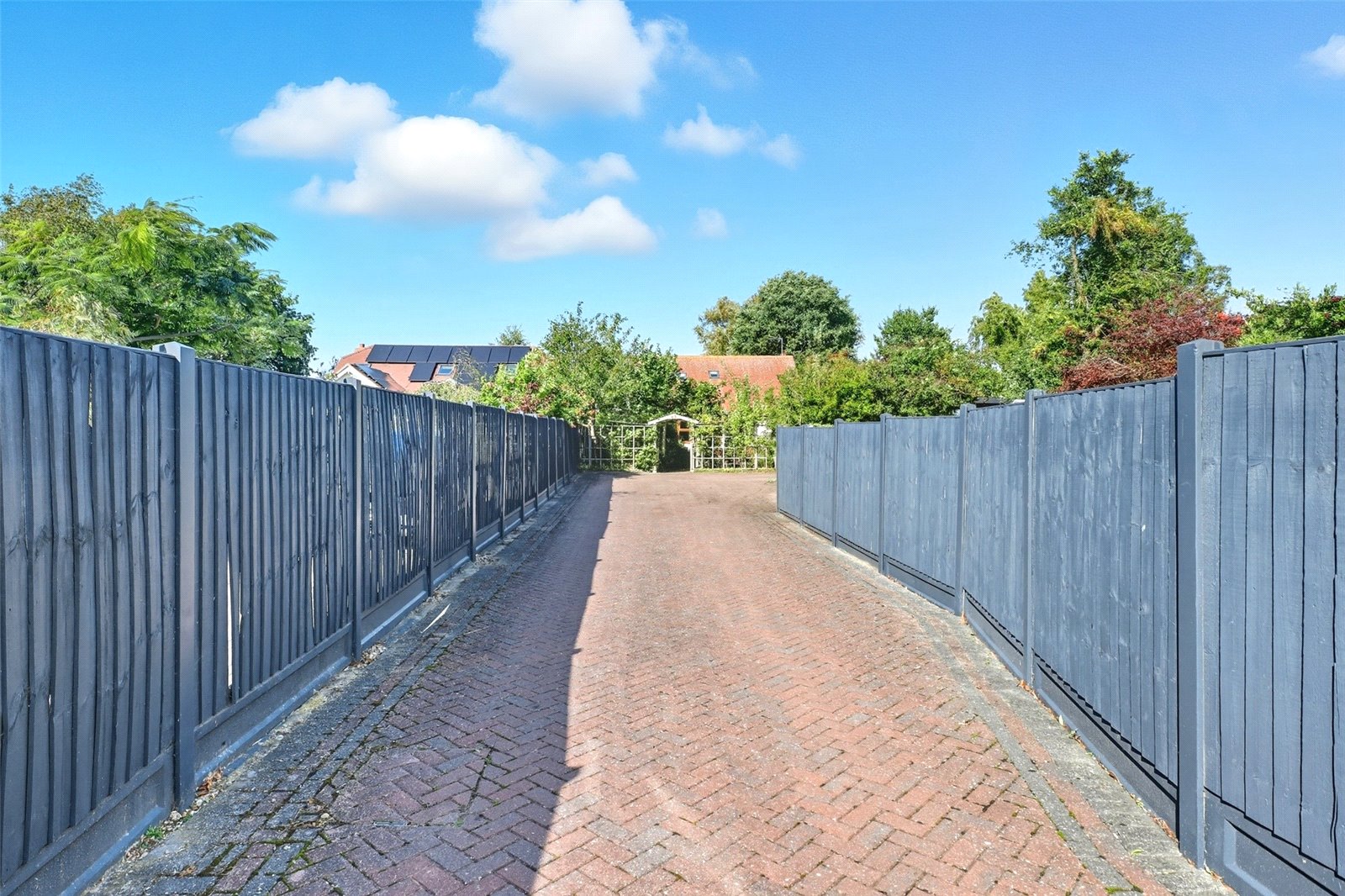 The property is approached by a lengthy herringbone brick block paviour bordered edge driveway with full height fencing to both sides. A wide driveway that in turn has ample space for parking several vehicles, and access to: