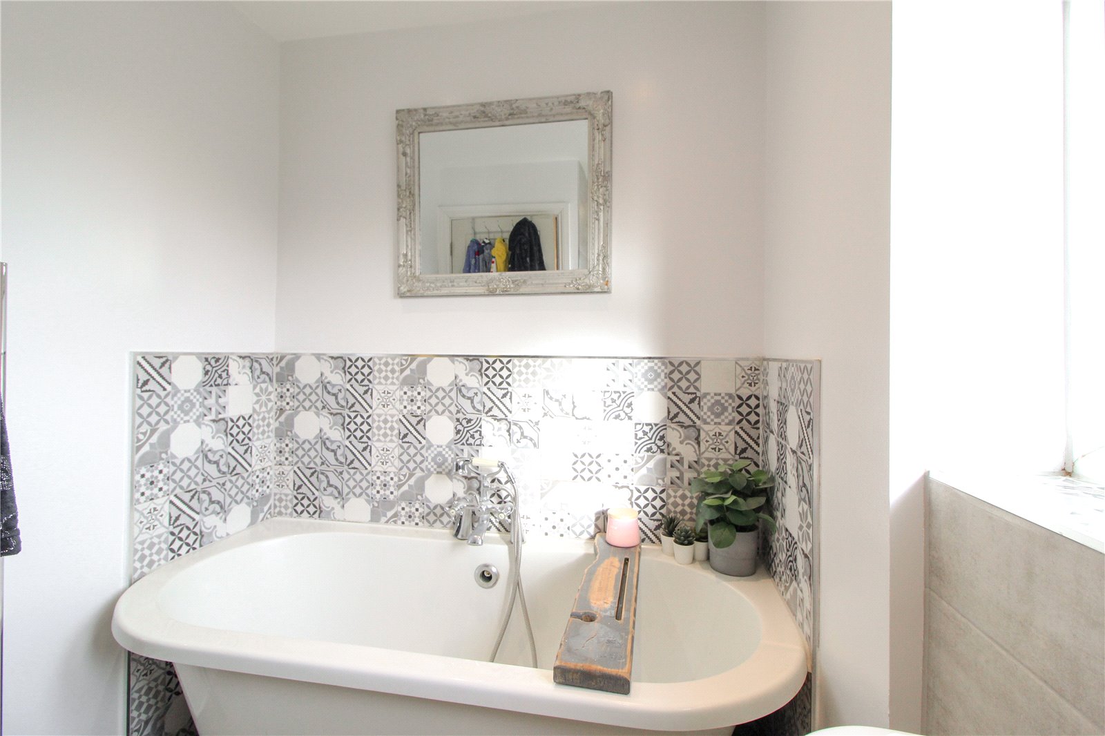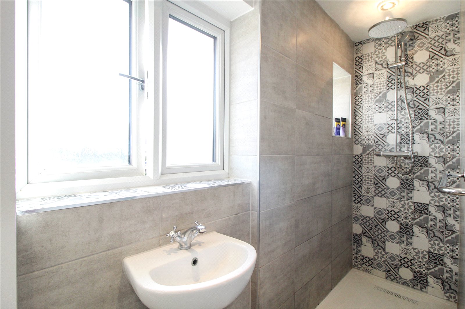 L shaped bathroom, with tiled flooring, bath, sink, walk in shower, 2 x obscure double glazed windows to front aspect.