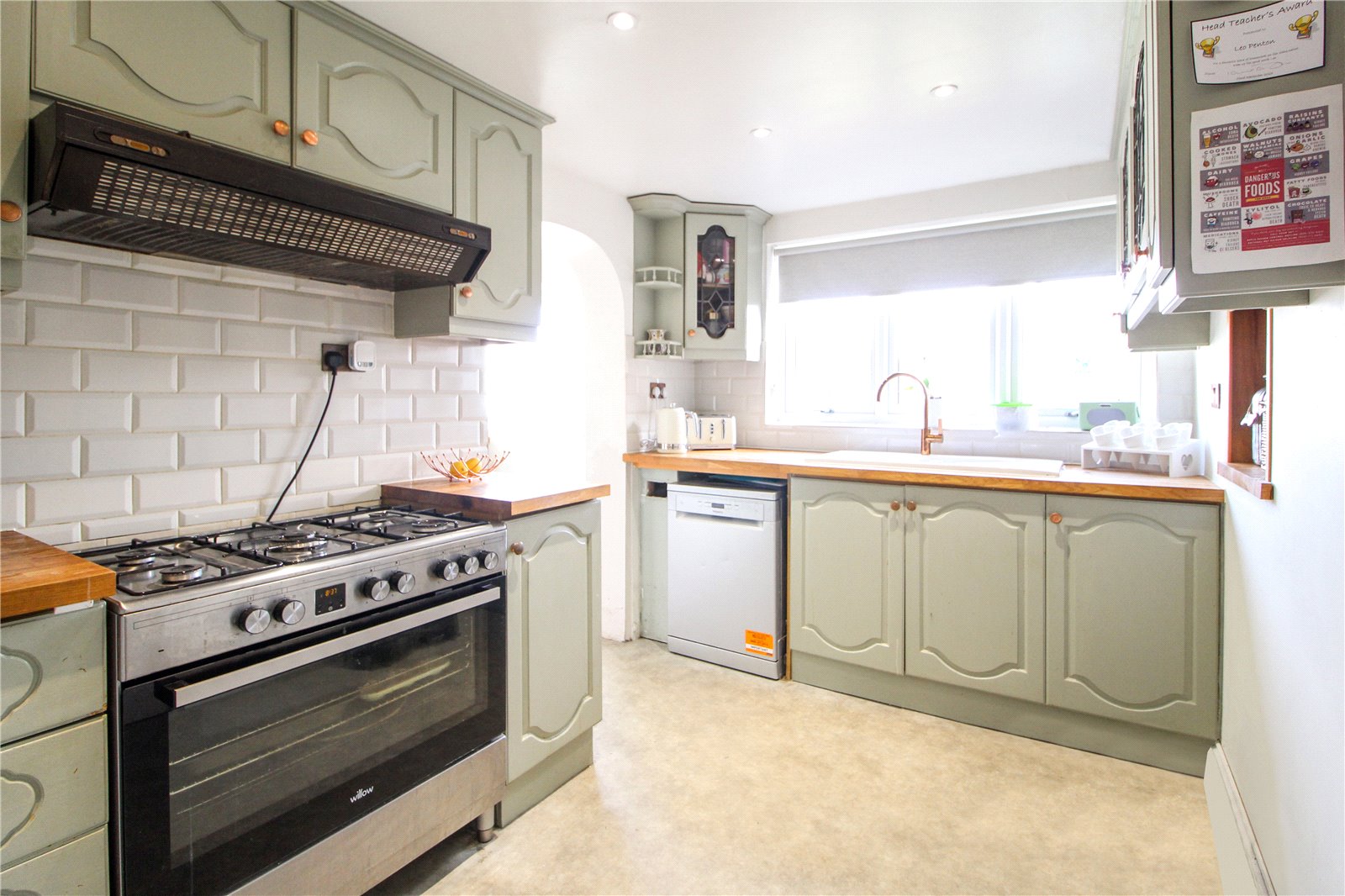 Eye and base level units, tiled splashback, sink and drainer unit, range cooker, space for washing machine, dishwasher and fridge/freezer, lino to floor, double glazed window to rear aspect, lino to floor, large storage cupboard, smooth ceilings, spotlights to ceiling, archway to:
