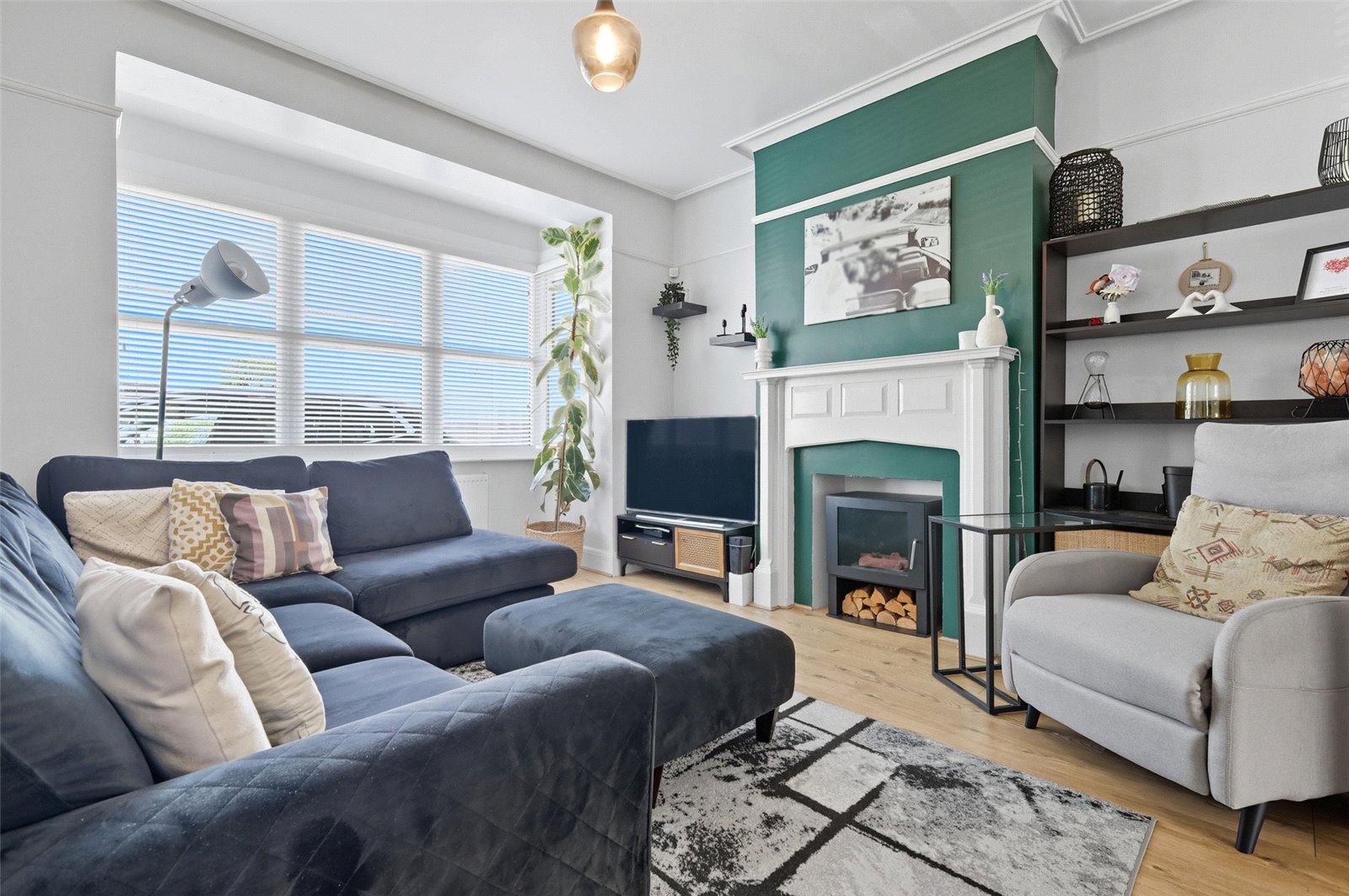 Door to side leading to entrance hall. Wide opening to rear leading to kitchen/family room. Wall mounted radiator. Feature fireplace with wooden mantle. Wood effect laminate flooring throughout. High level skirting. Feature picture rail. Coved cornice to smooth plastered ceiling with feature ceiling rose.