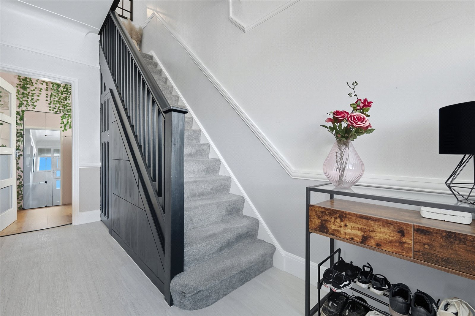 Approached via hardwood front door with inset obscured glazed leaded light window. Double obscured glazed panels adjacent. Door lead off to ground floor rooms. Stairs rising to first floor accommodation. Wall mounted radiator. Wood effect laminate flooring. High level skirting. Feature dado rail. Feature picture rail. Ornate coving to smooth plastered ceiling with feature ceiling rose. Understairs storage cupboard housing utilities. Fitted storage shelving solution to staircase.