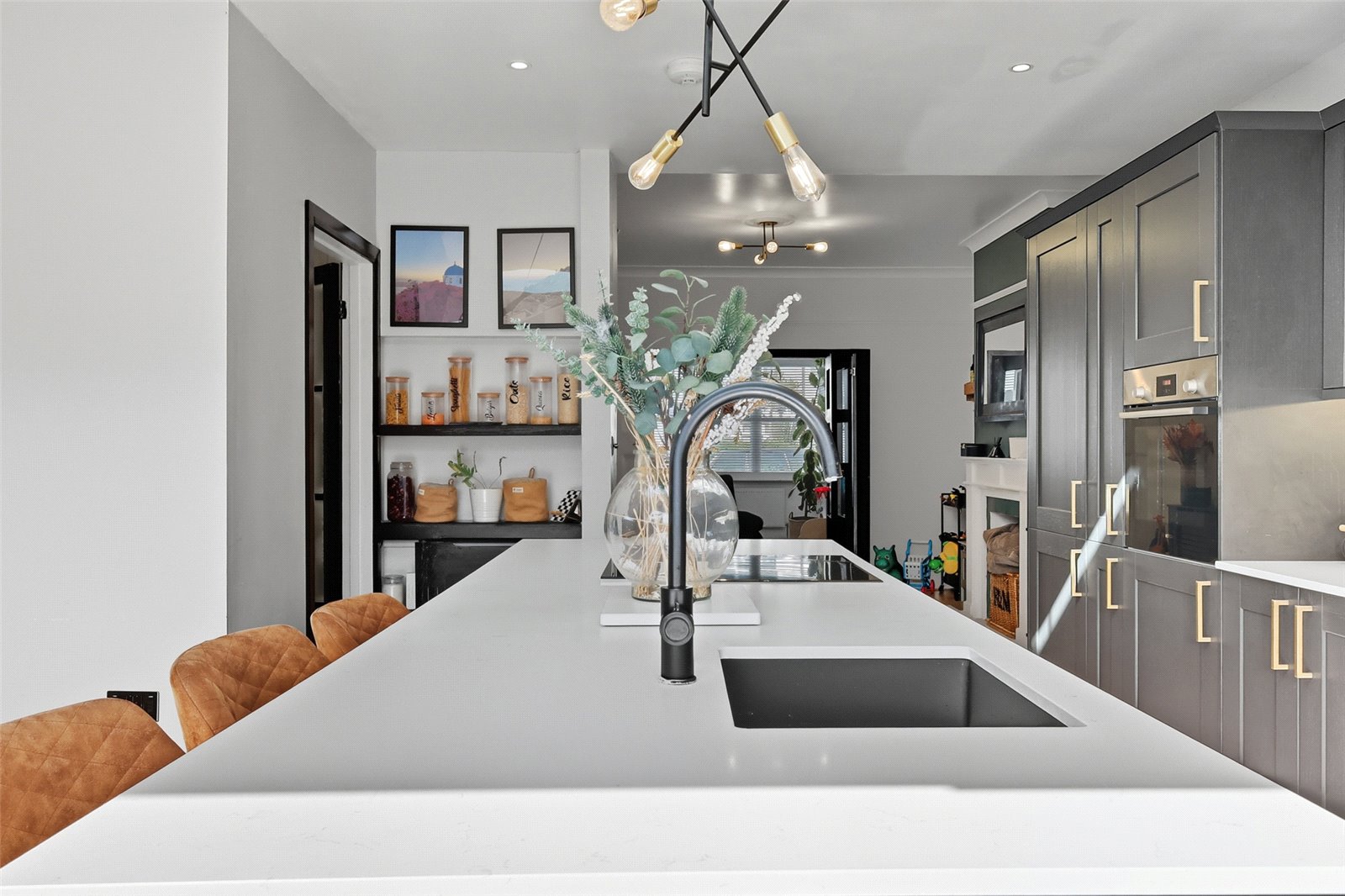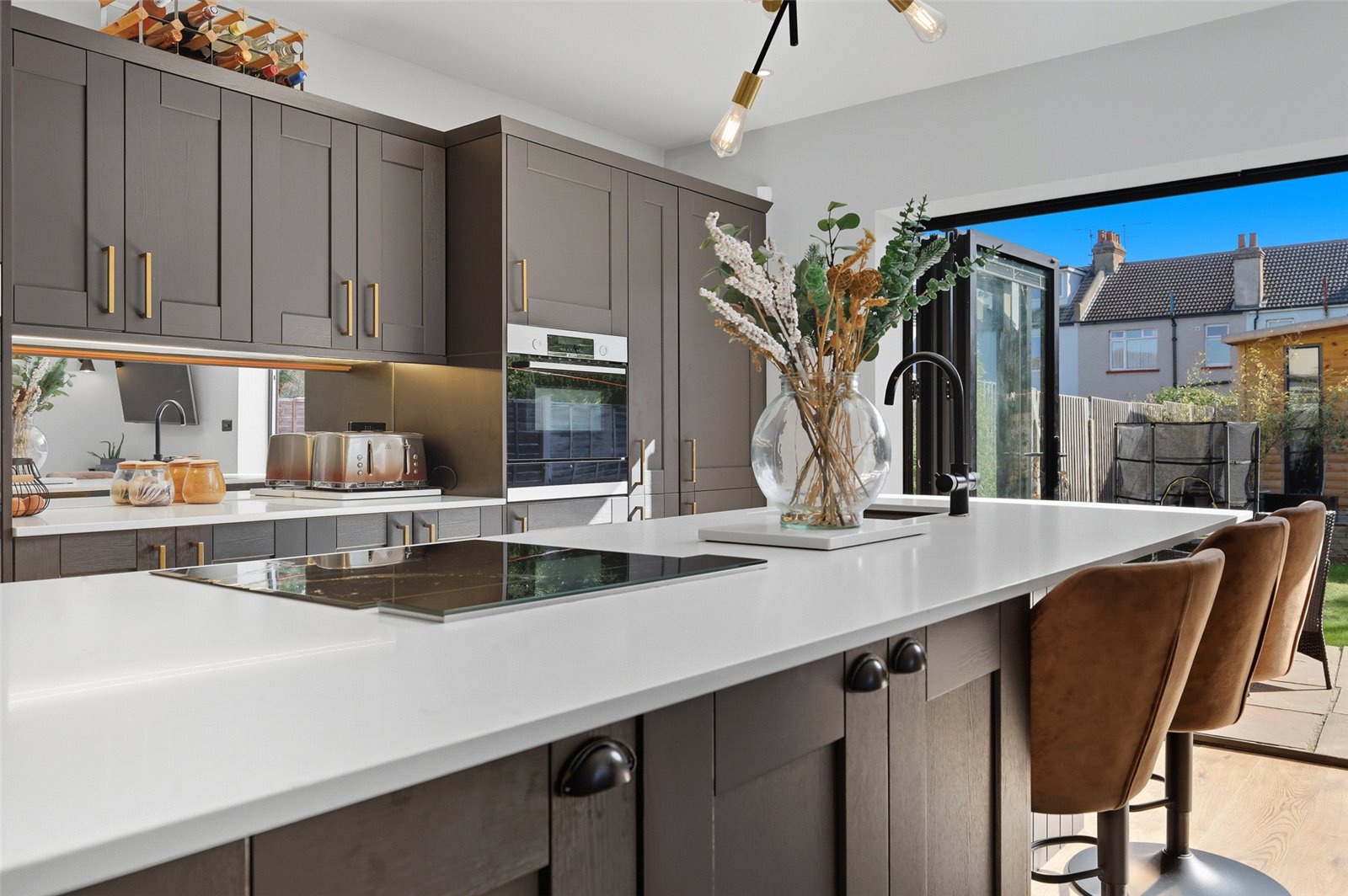 overall size. Large double glazed bi-folding doors to rear leading to the sunny South backing rear garden with in pane black out blinds. Double glazed window to side. Georgian roof lantern. Kitchen is fitted a range of base and eye level shaker style cabinets incorporating a slimline quartz working surface. Large central island unit with matching quartz working surface. Inset AEG four burner induction hob with retractable extractor hood behind. Undermount composite sink with instant hot water mixer tap. Fitted breakfast bar. Kitchen benefits from a range of integrated appliances incorporating Bosch electric fan assist oven, matching microwave/convector oven with warming drawer beneath. Integrated fridge/freezer. Mirrored splashback. Wood effect laminate flooring throughout with underfloor heating. High level skirting. Smooth plastered ceiling with recessed LED lighting. Obscured glazed door to side provides access to the: