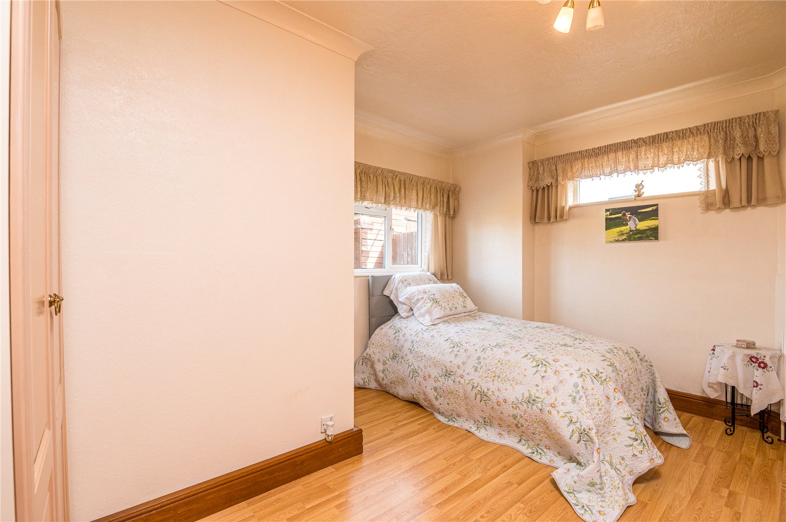 maximum. UPVC double glazed window to rear overlooking rear garden. Further double glazed window to side. Wall mounted radiator. Wood effect laminate flooring. High level skirting. Coved cornice to ceiling with feature ceiling rose.