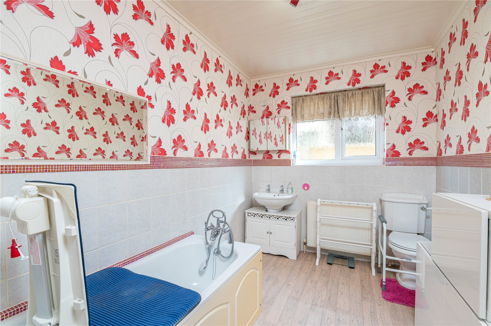 UPVC double obscure glazed window to side. Fitted with a modern three piece suite comprising low flush WC, pedestal wash hand basin and panelled bath with mixer tap, separate detachable showerhead. Wall mounted radiator. Wood effect vinyl flooring. Part tiled walls. Panelled ceiling.
