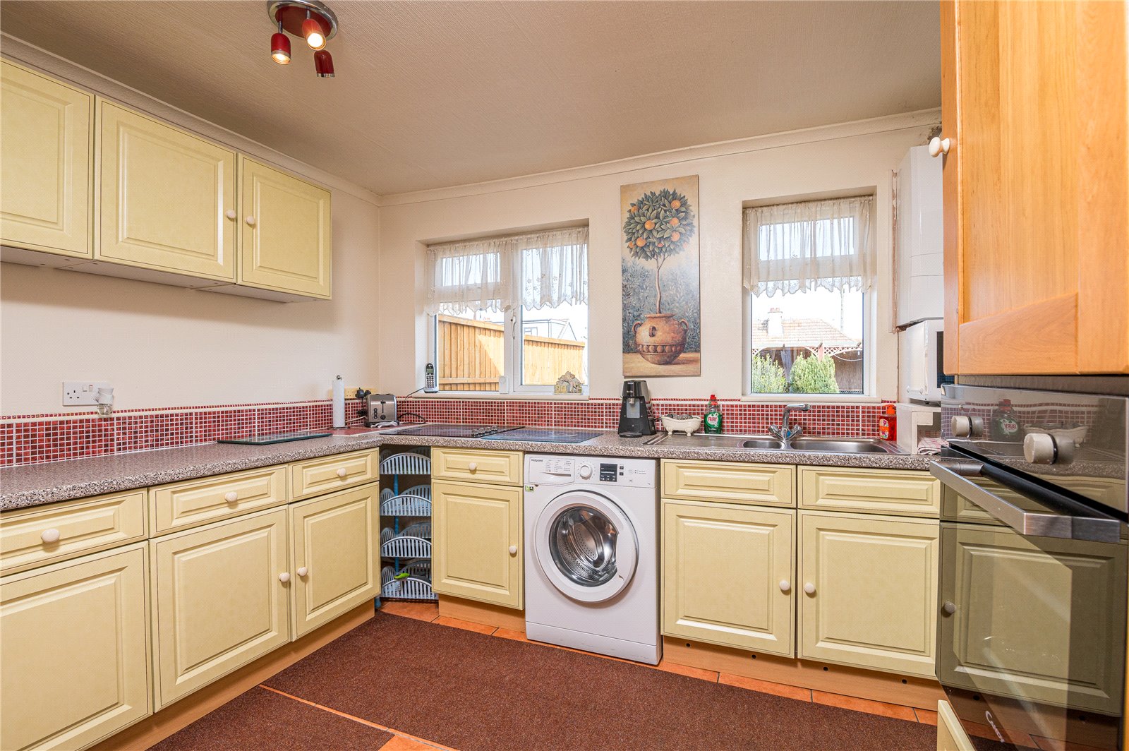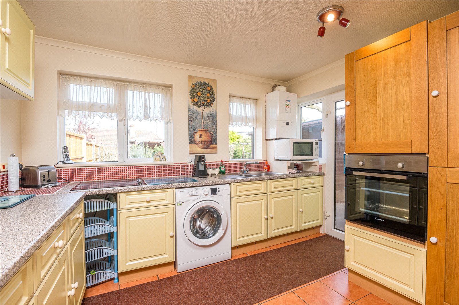 UPVC double obscured glazed door to side leading on to rear garden. UPVC double glazed window to side and rear. Kitchen is fitted with a range of base and eye level cabinets. Rolled edge working surface with stainless steel sink with mixer tap and drainer unit. Inset four burner ceramic hob. Integrated electric fan assist oven. Space and plumbing for washing machine. Space for free standing fridge/freezer. Wall mounted Ideal combination gas fired boiler. Tiled splash backs. Fully tiled floors. Coved cornice to ceiling.