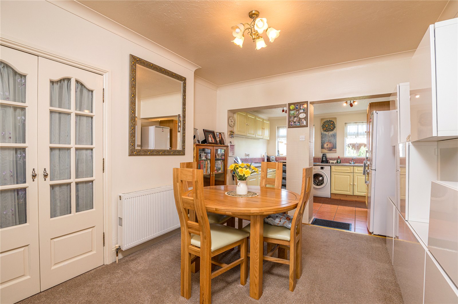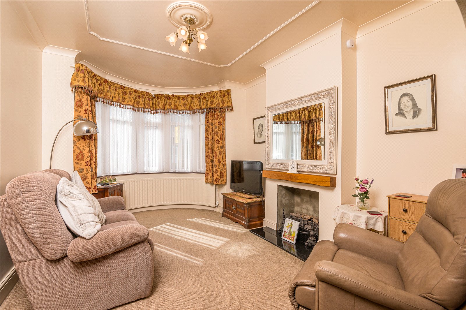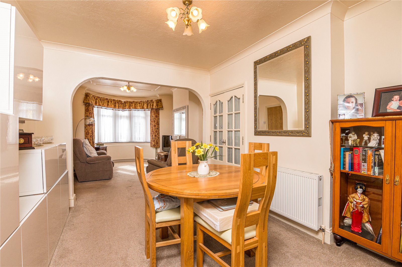 into bay. Large UPVC double glazed bay window unit to front. Two wall mounted radiators. Feature fireplace with wooden mantle. Stone hearth. Inset gas burner. Fitted storage cupboard housing utility. High level skirting. Coved cornice to smooth plastered ceiling with feature ceiling rose. Open archway to rear provides access to the: