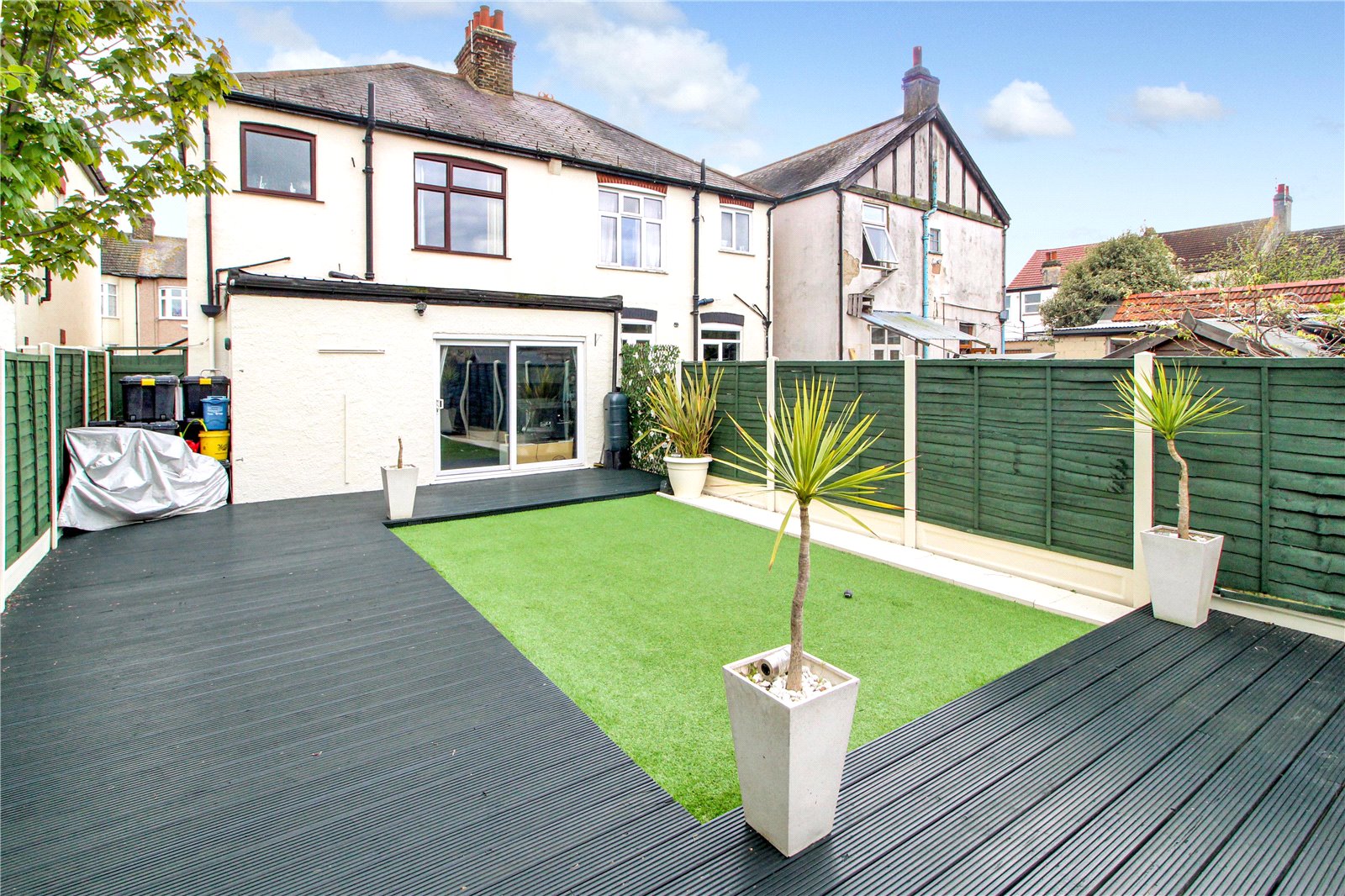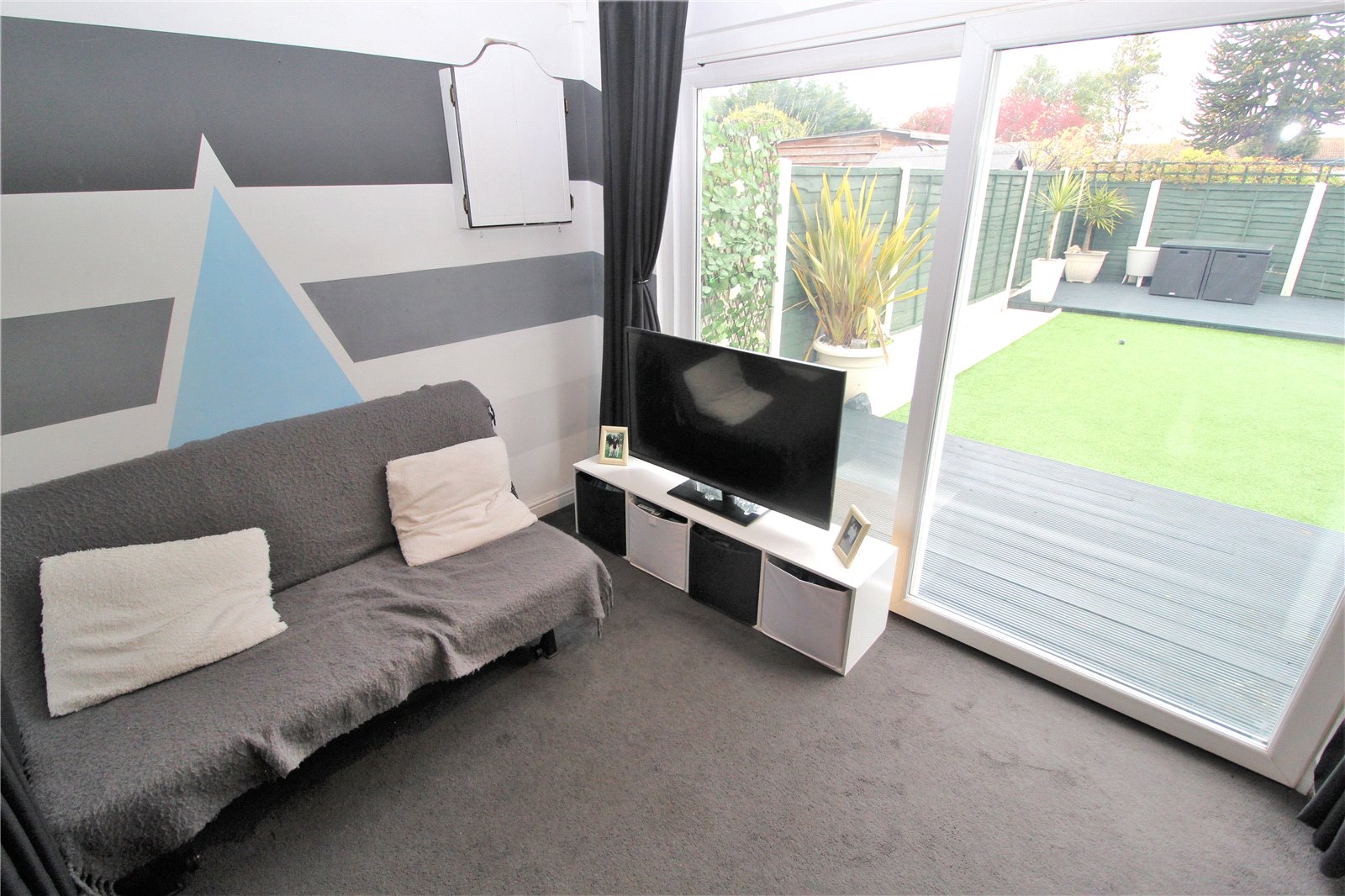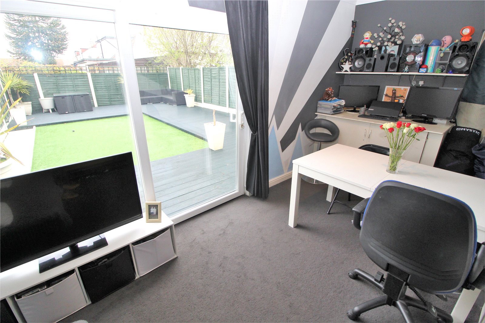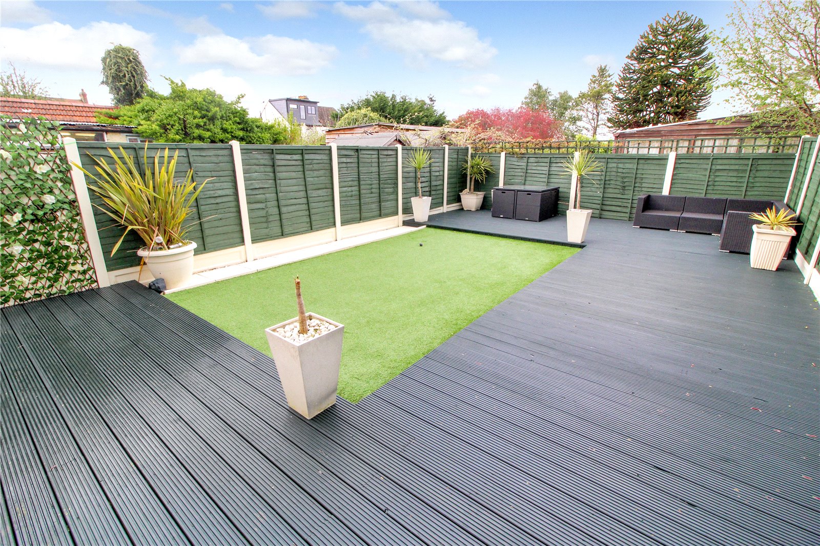 The rear garden enjoys a southerly aspect and features a large wrap around decked patio which leads onto a low maintenance lawn. Fencing to boundaries, side access.