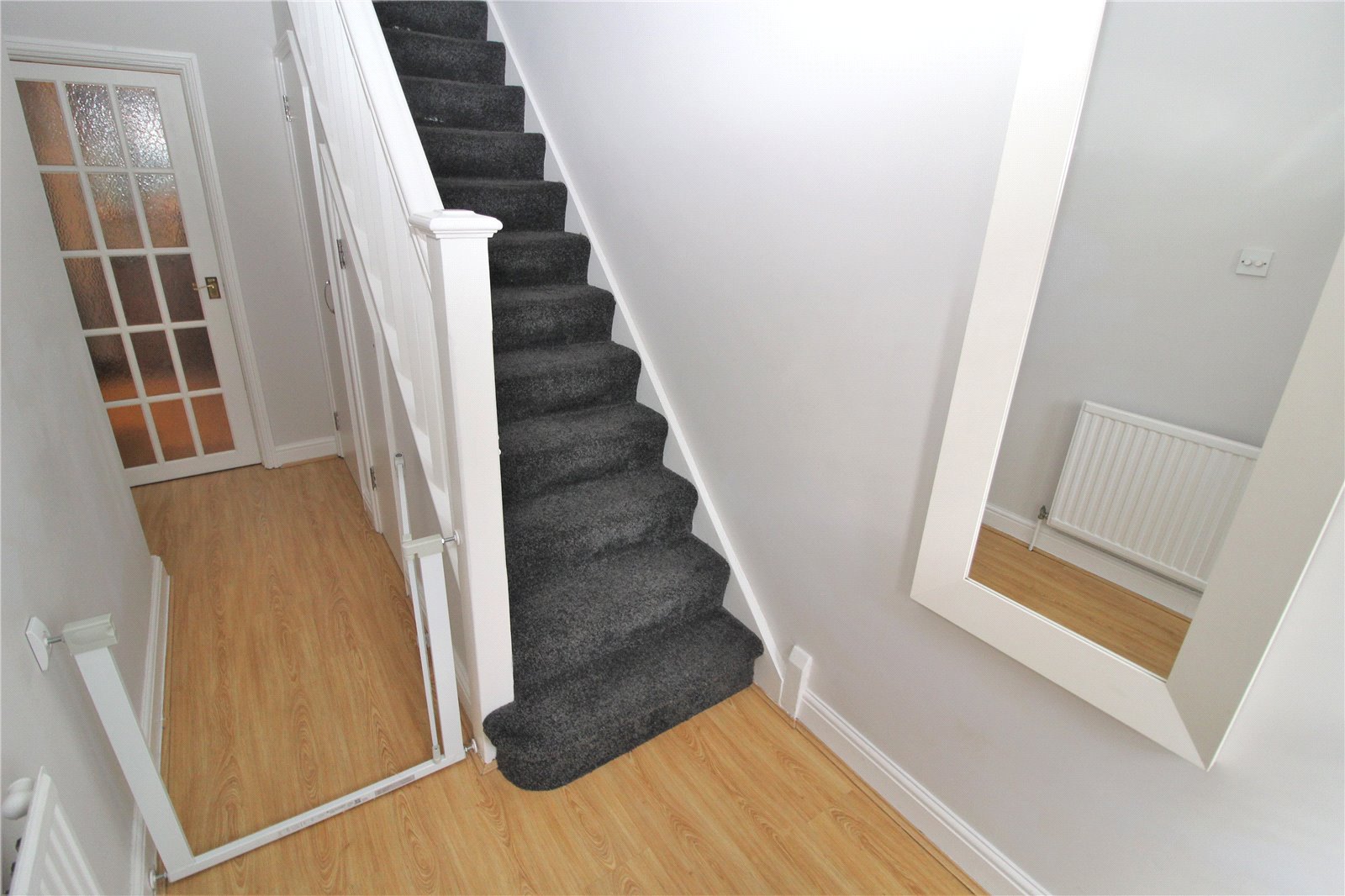 Upvc double glazed door to the front. Stairs with spindle ballustrade rising to first floor with storage cupboard beneath, wood effect flooring, doors to rooms: