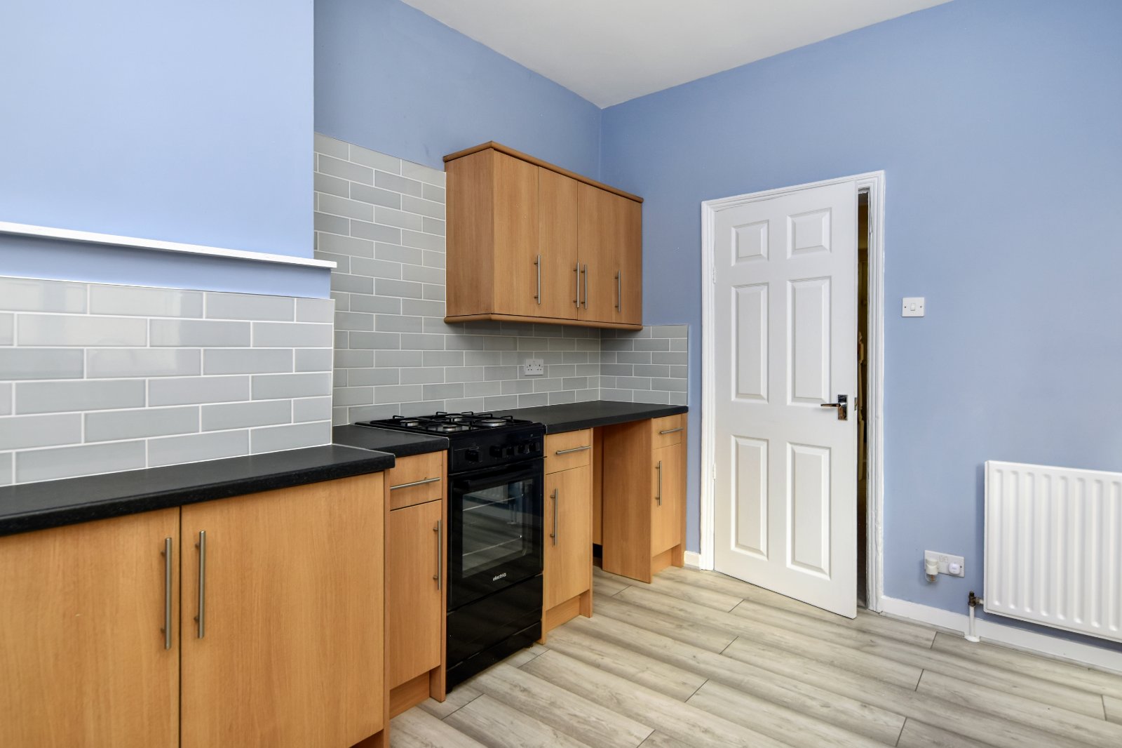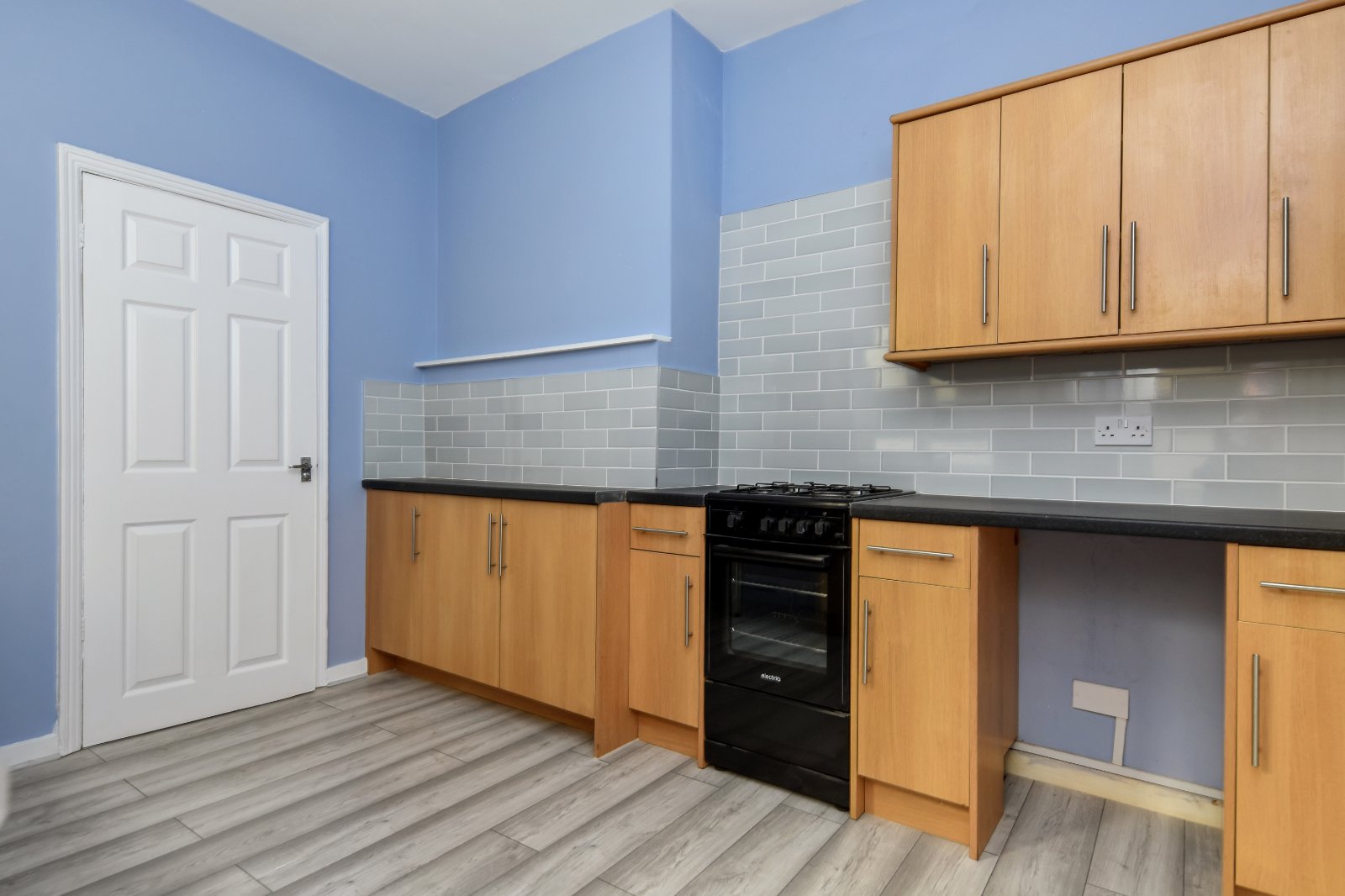 uPVC double glazed window to side aspect with additional uPVC half-glazed door providing access to the garden. The Kitchen is fitted with a range of wood effect base and wall mounted units with rolled edge working tops over inset with stainless steel single drainer sink unit and mixer tap over. Attractive tiled splashbacks. Freestanding oven. Under counter recess for appliances. Wall-mounted 'i-mini' boiler. Radiator. Wood-effect vinyl flooring. Smooth plastered ceiling. Panelled door to;