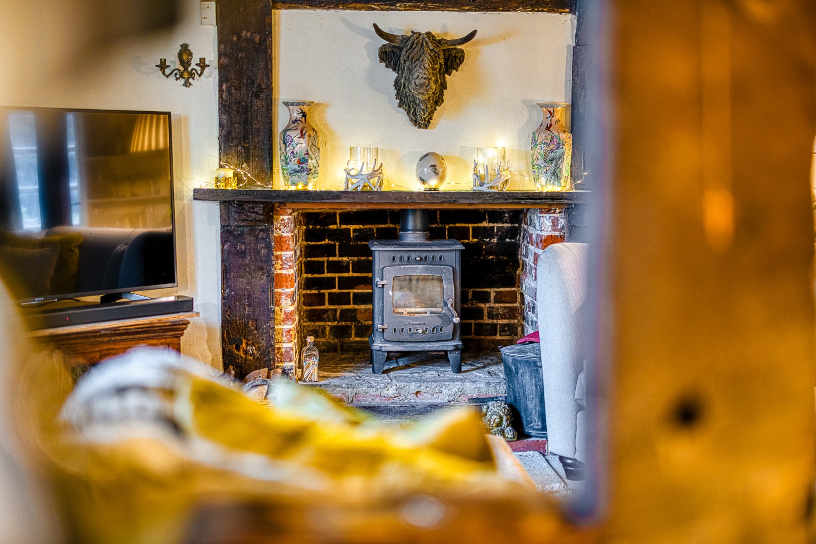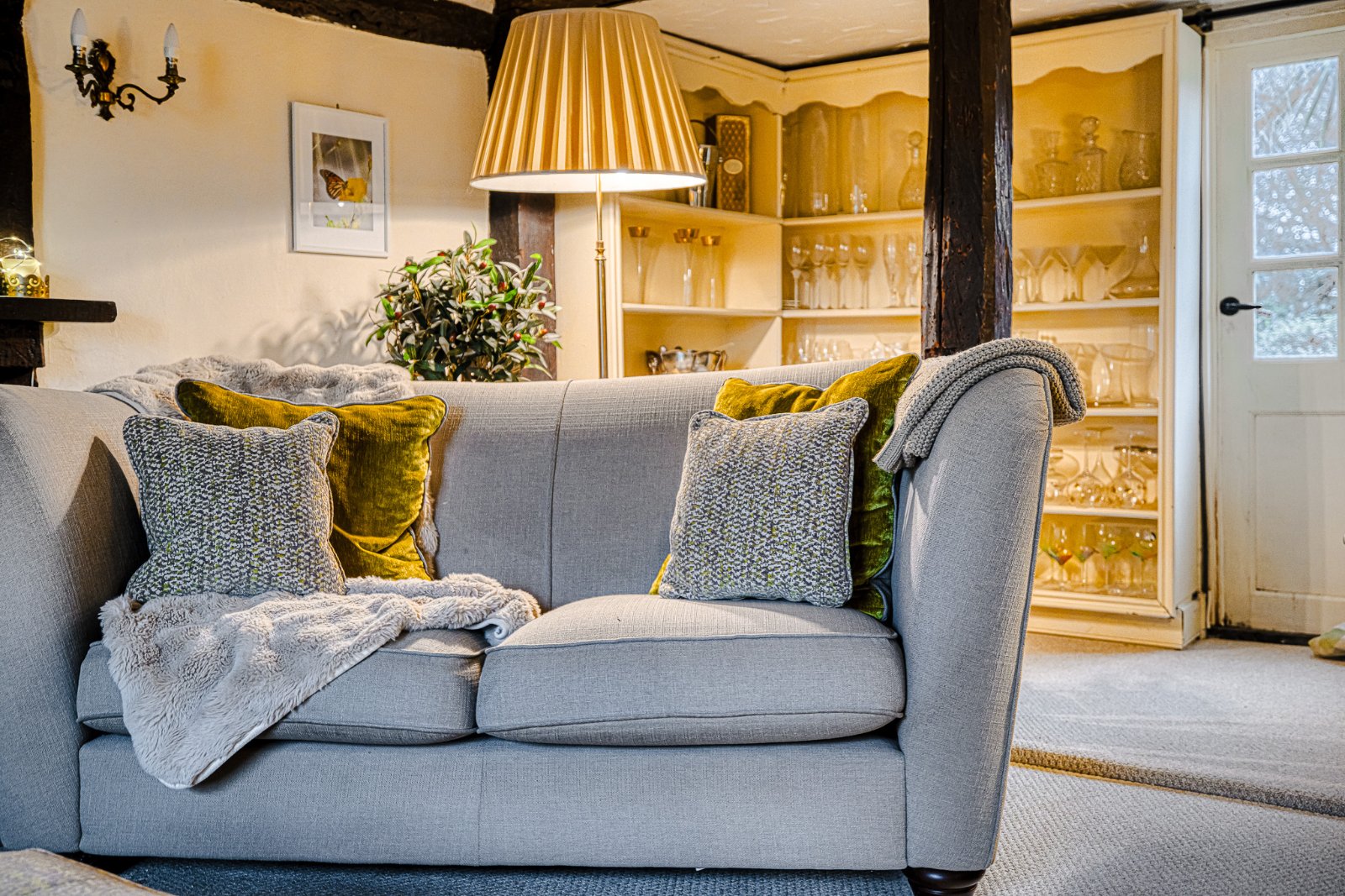 Multi-pane sash window to the front aspect fitted with secondary glazing. Impressive exposed brick inglenook fireplace featuring a brick hearth and inset dual fuel burning stove. Timber door to recessed cupboard, ideal for wardrobe space or log storage. Additional understairs feature recess incorporating part of the original staircase structure. Characterful exposed structural timbers throughout. Wall light points. Radiator. Flooring laid to carpet. Beamed ceiling with reduced head height in part, adding to the room’s period charm. Low level original style timber latch door opening through to the Kitchen. (Please note there is restricted head height to this doorway).