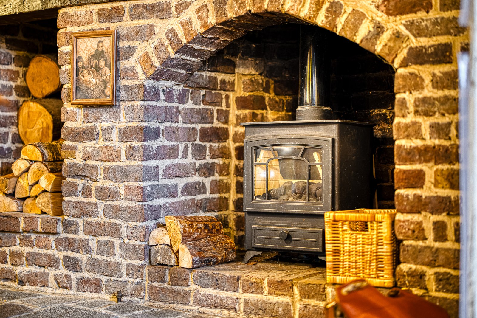The principal living areas are arranged around the central spine of the home, with exposed brick chimney breasts and feature fireplaces forming focal points to multiple rooms. A semi open-plan arrangement between the dining and living spaces is defined by original timber framing and rafters, with concealed staircase access to the first floor, retaining the authentic historic layout typical of period farmhouses of this era.