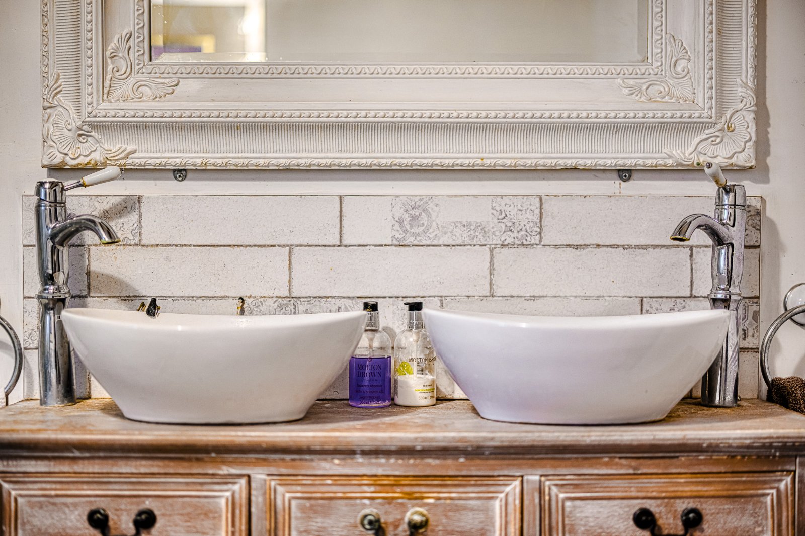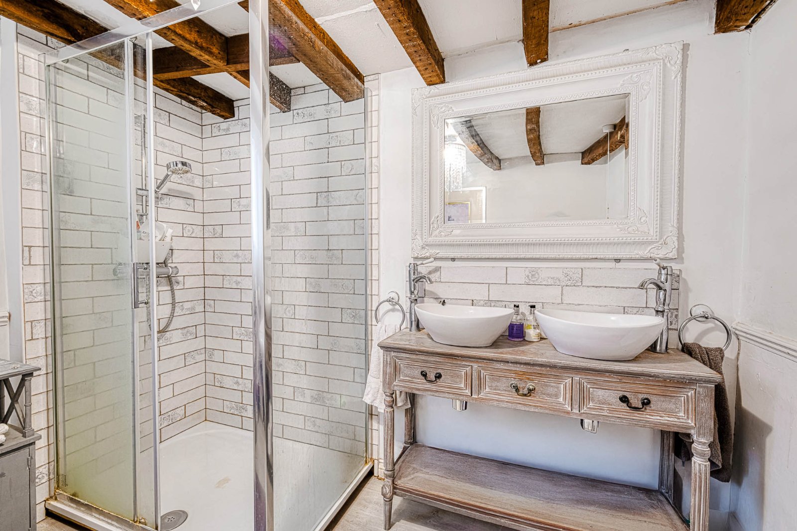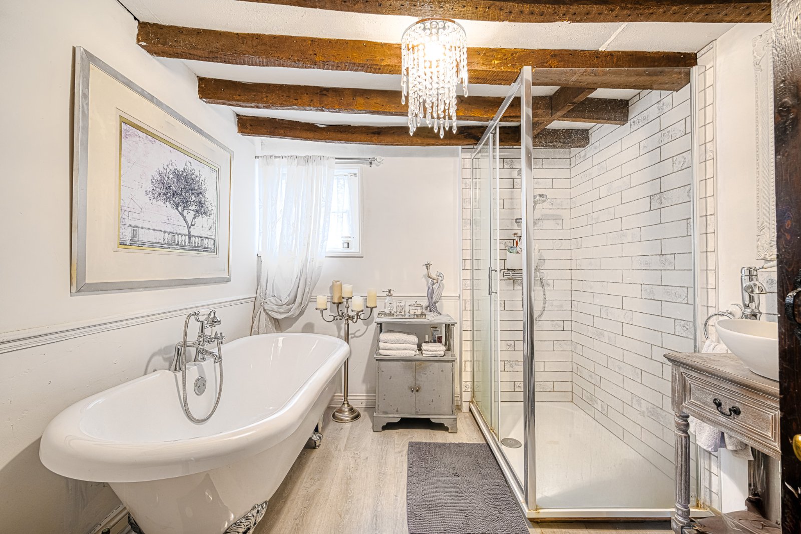 Obscure glazed window to side aspect. The Bathroom is beautifully appointed with a traditional style suite comprising freestanding claw-foot bath with mixer tap and shower attachment, pair of circular countertop porcelain wash hand basins with matching counter top mixer taps set into a dresser style vanity unit with drawers and open storage beneath, low level WC, and a separate double width fully tiled shower enclosure with integrated shower unit. Traditional column radiator with heated towel rail over. Dado rail. Flooring laid to laminate. Feature exposed beams to textured ceiling.
