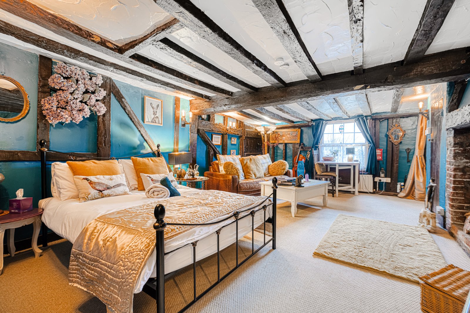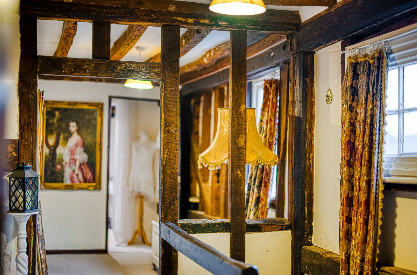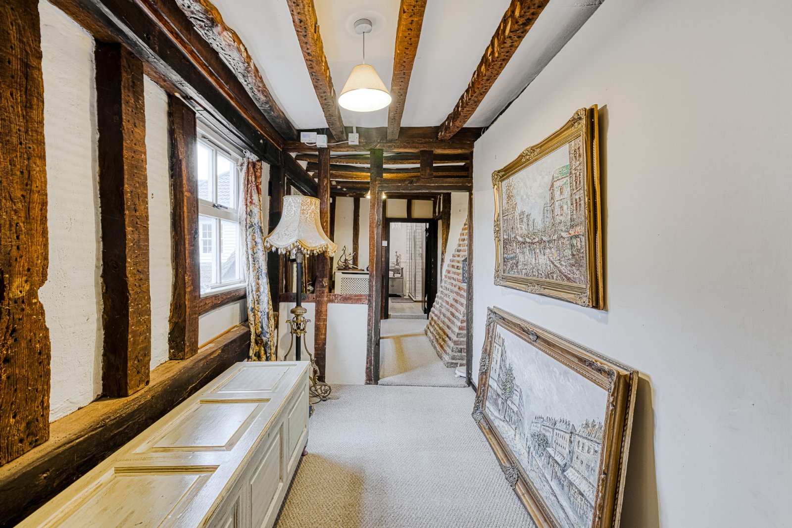 Landing featuring extensive exposed structural timbers and studwork with additional exposed brickwork detailing, enhancing the property’s period character. Pair of multi-pane windows to rear aspect. Timber balustrade overlooking stairwell. Carpeted flooring. Radiator with decorative cover. Farmhouse style timber latch doors to Bedrooms and Bathroom. Characterful variation in ceiling height and beam depth consistent with the property’s heritage origins.