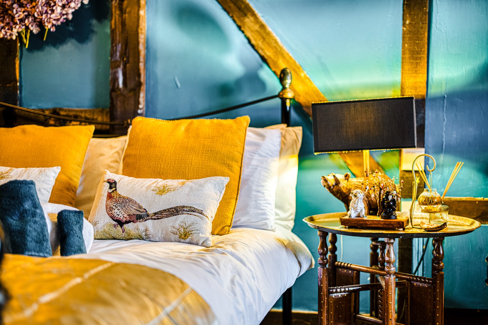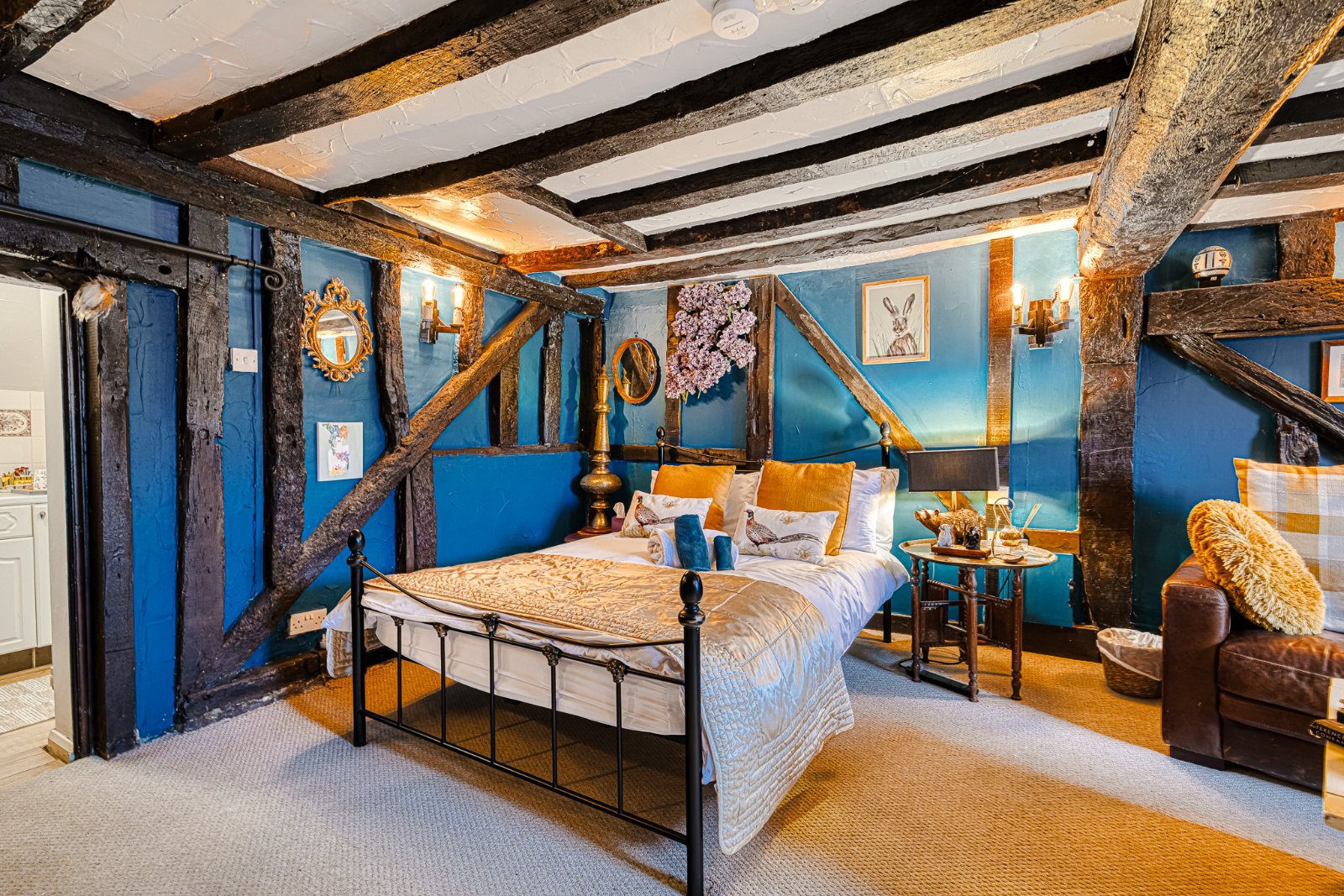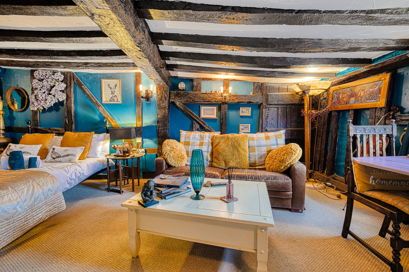Landing featuring extensive exposed structural timbers and studwork with additional exposed brickwork detailing, enhancing the property’s period character. Pair of multi-pane windows to rear aspect. Timber balustrade overlooking stairwell. Carpeted flooring. Radiator with decorative cover. Farmhouse style timber latch doors to Bedrooms and Bathroom. Characterful variation in ceiling height and beam depth consistent with the property’s heritage origins.