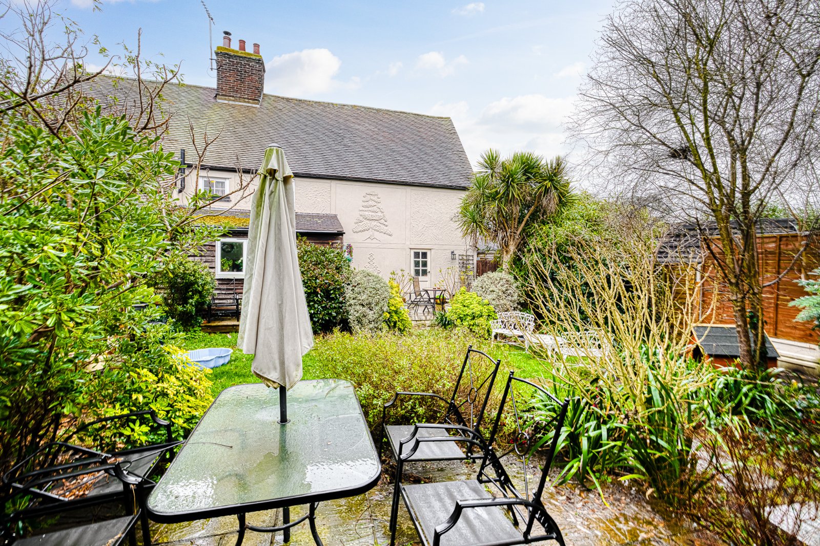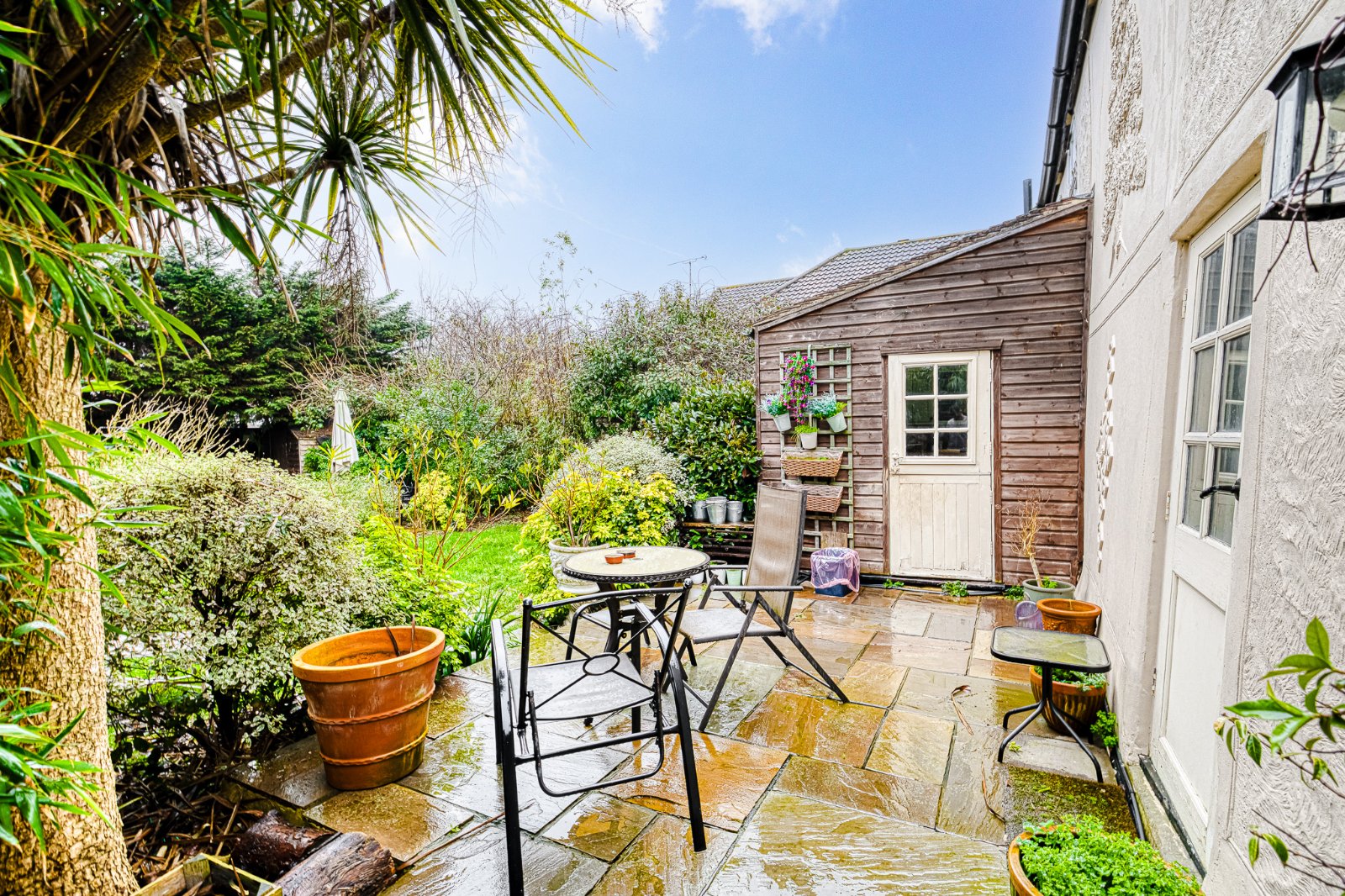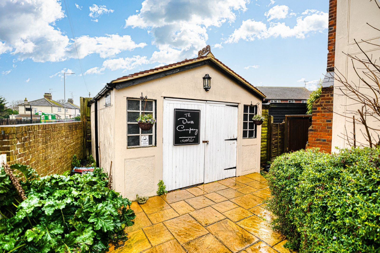 The rear garden is arranged in a cottage style with established planting, paved seating areas and pathways. A substantial detached outbuilding, formerly garaging and now adapted for workspace / studio use, provides power and lighting and offers flexible ancillary accommodation.