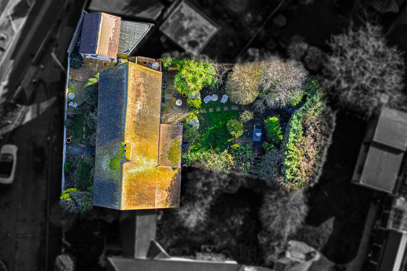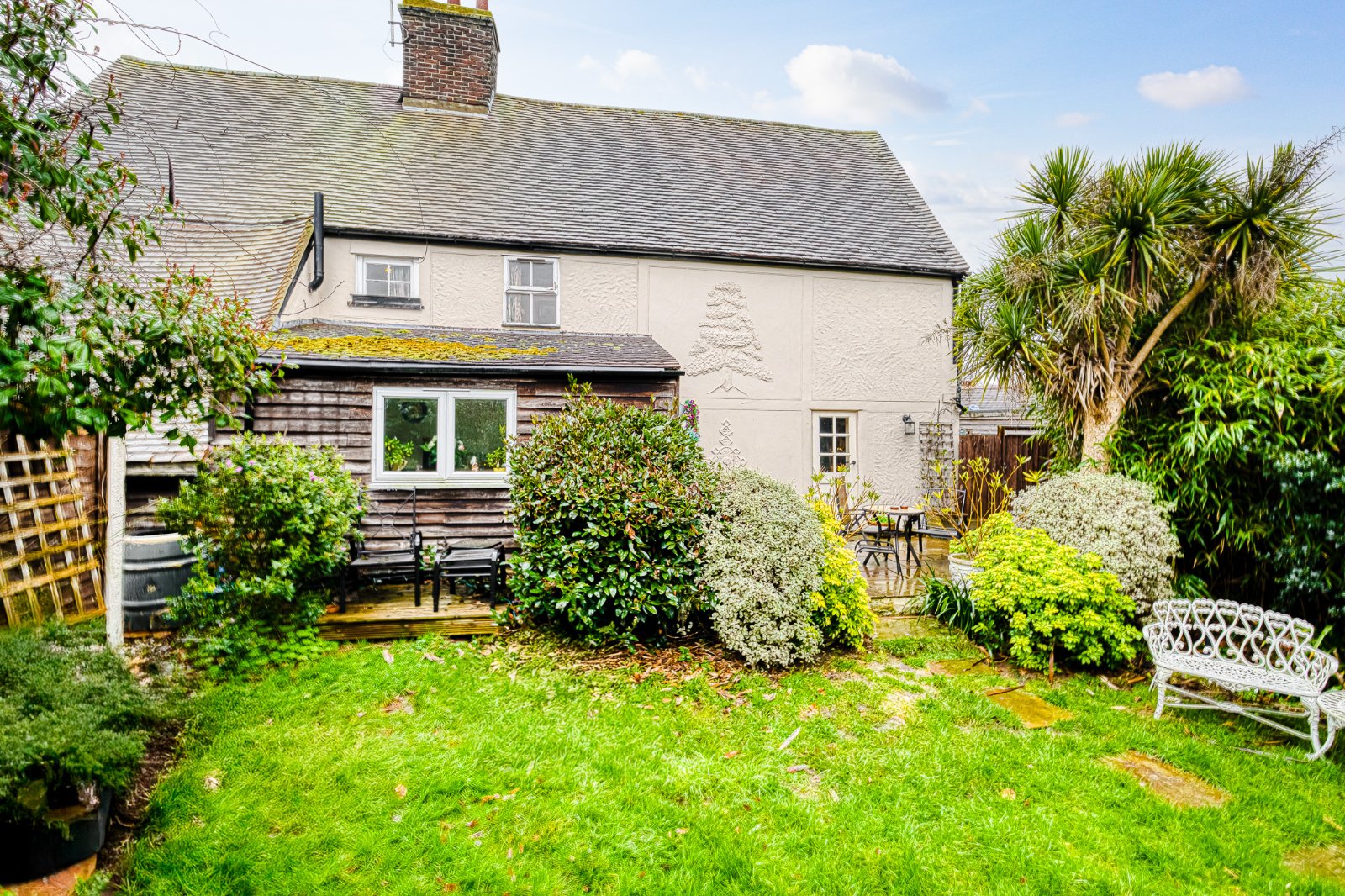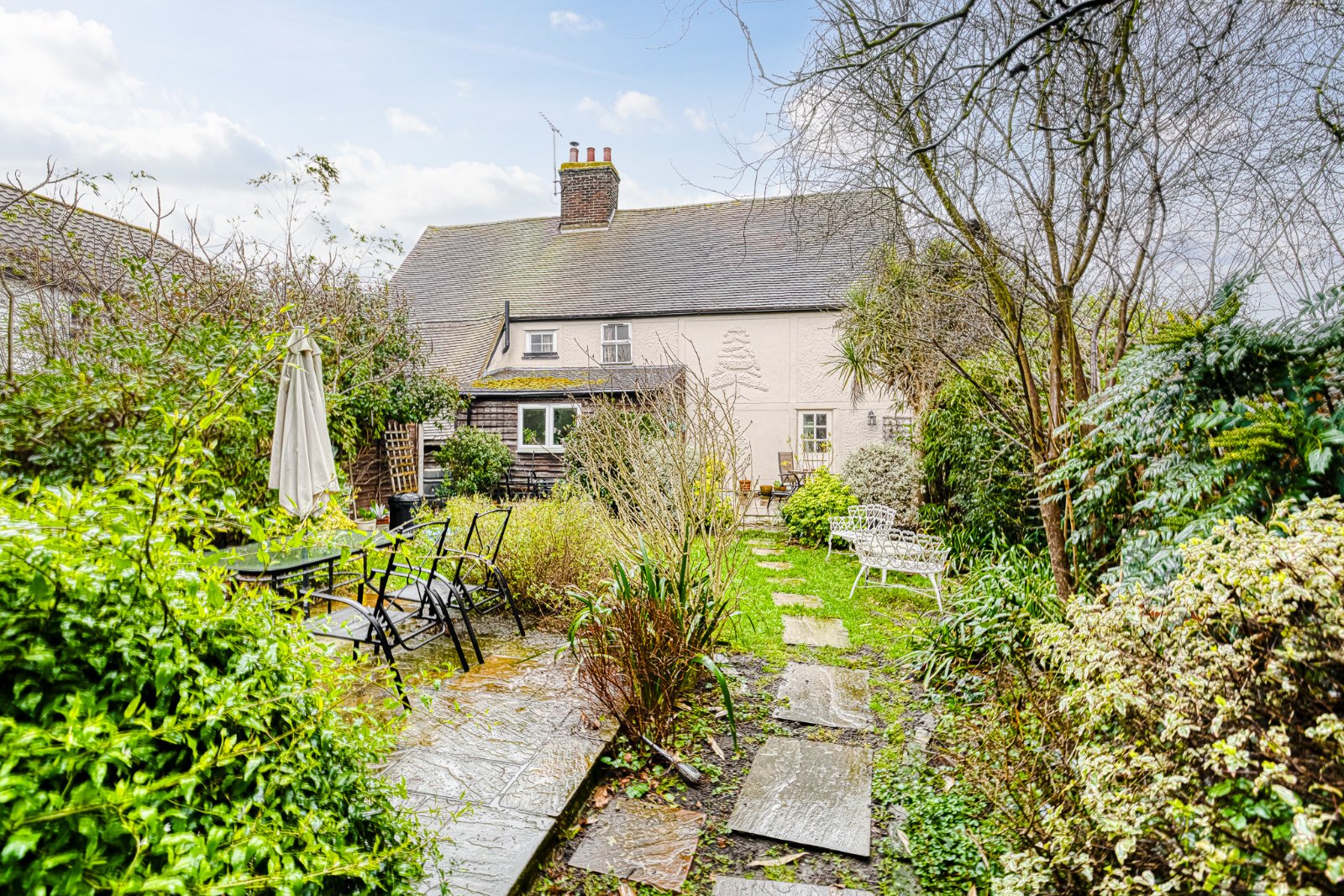 The rear garden is arranged in a cottage style with established planting, paved seating areas and pathways. A substantial detached outbuilding, formerly garaging and now adapted for workspace / studio use, provides power and lighting and offers flexible ancillary accommodation.