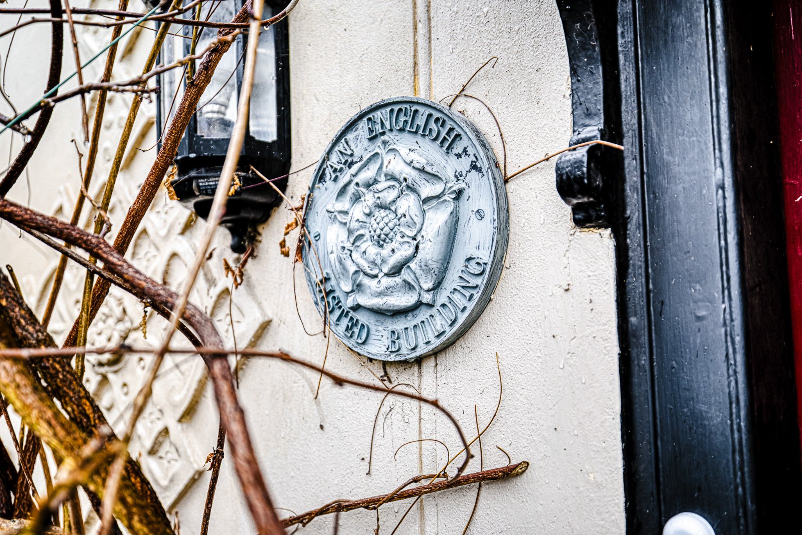 A characterful cottage-style frontage with picket-style fencing and gate leading to a pathway, with mature climbing foliage framing an original-style cottage panelled entrance door. The entrance is complemented by an external wall light and a decorative name plaque. An English Heritage Listed Building plaque is displayed at the property, alongside heritage-style external detailing.