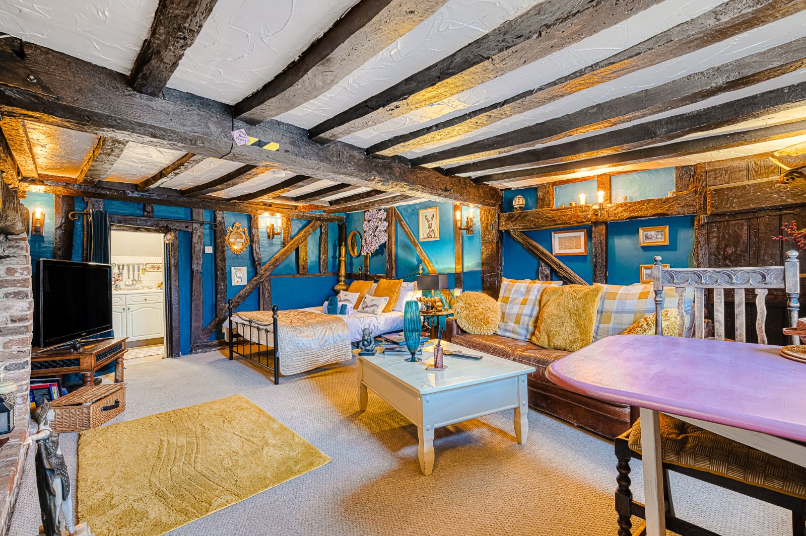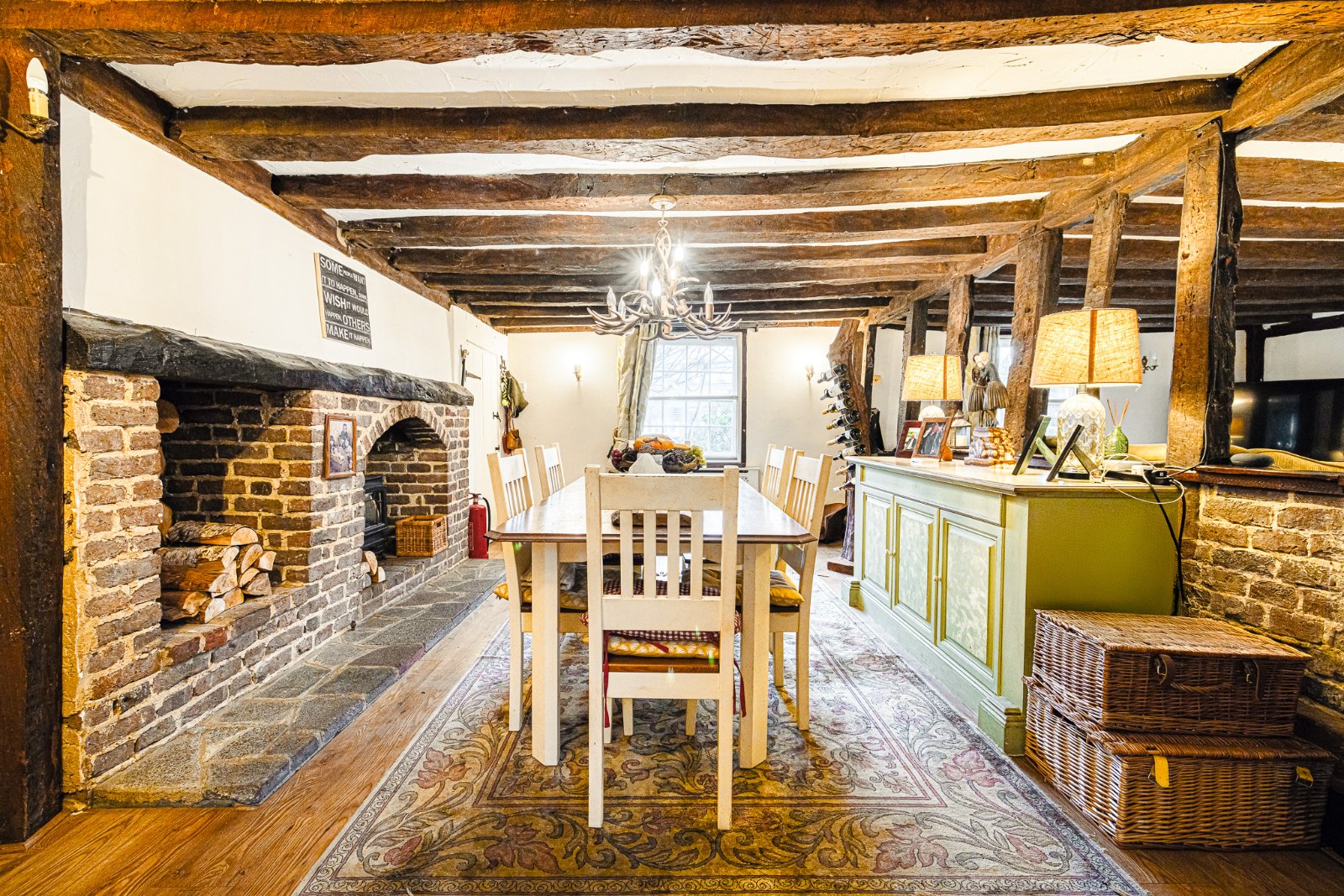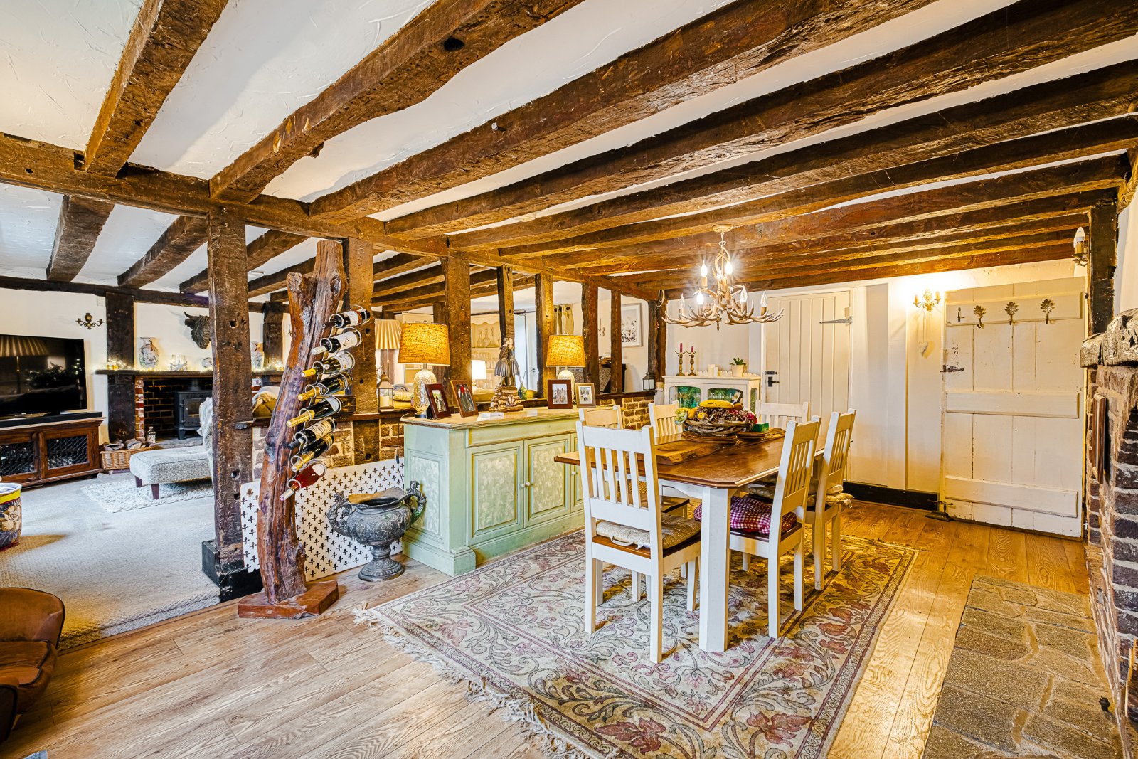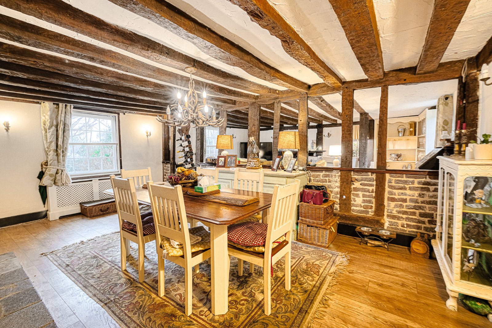A characterful and spacious Semi Open Plan Living Room / Dining Room forming the heart of the home, arranged in clearly defined yet flowing zones ideal for both day-to-day family living and entertaining. The space showcases an abundance of original period features including substantial exposed structural timbers, low level beamed ceilings and feature brick fireplaces, creating a warm and inviting cottage atmosphere throughout.