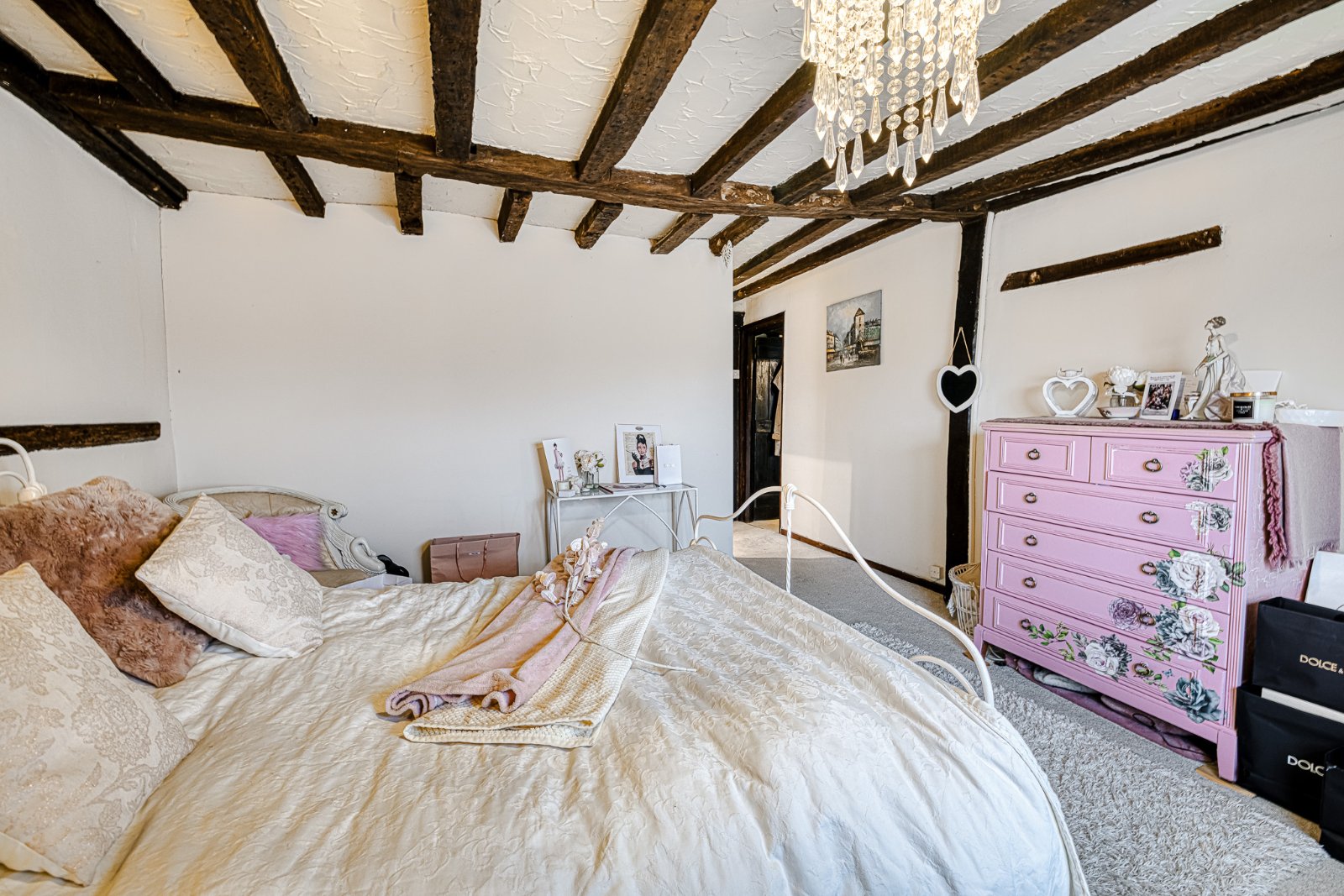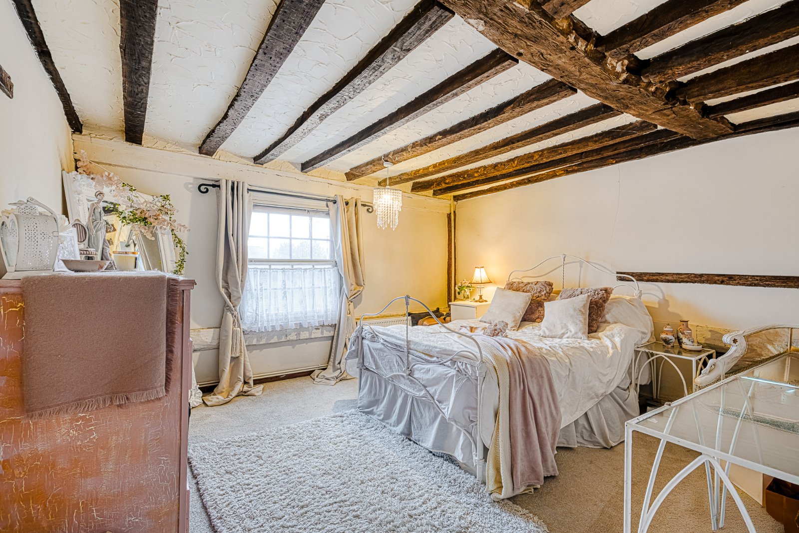 Pair of multi-pane sash windows to front aspect with secondary glazing providing good natural light. Feature exposed brick chimney breast with recessed fireplace forming a strong focal point to the room. Split-level layout with raised dressing / display area enhancing character and zoning. Exposed beams and structural timbers throughout reinforcing the period cottage feel. Radiator. Flooring laid to carpet. Beamed ceiling.