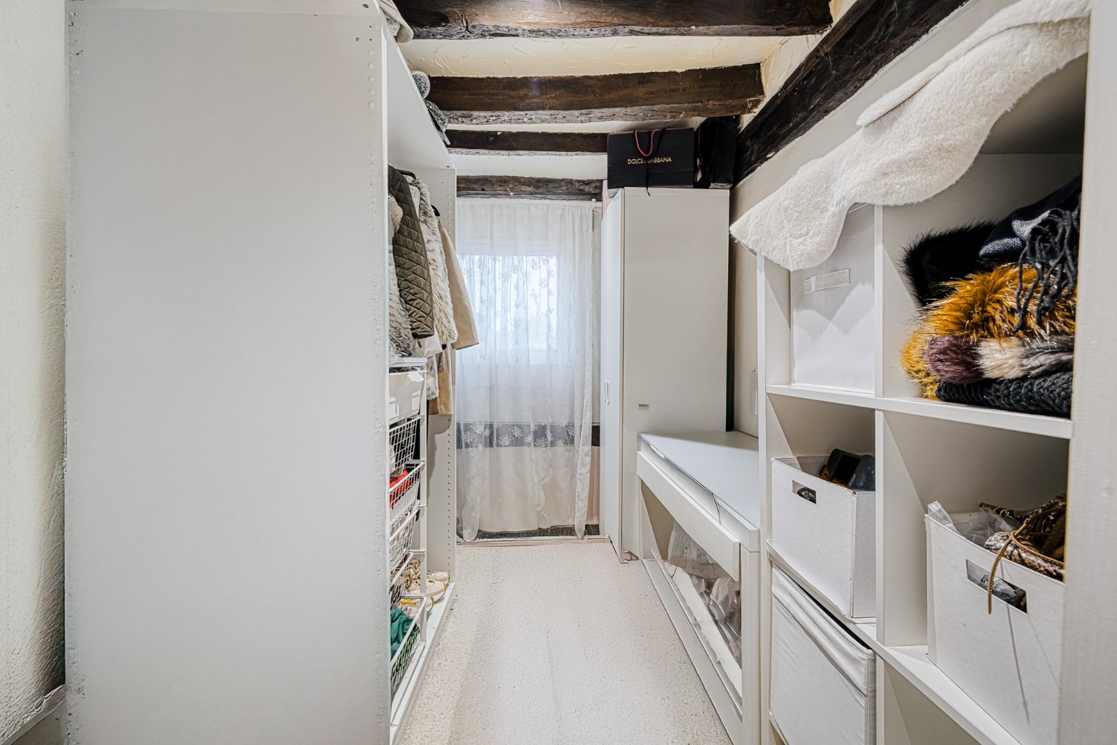 Window to side aspect. Fitted hanging rails and shelving providing useful storage. Flooring laid to carpet. Smooth ceiling with exposed beams and inset lighting.