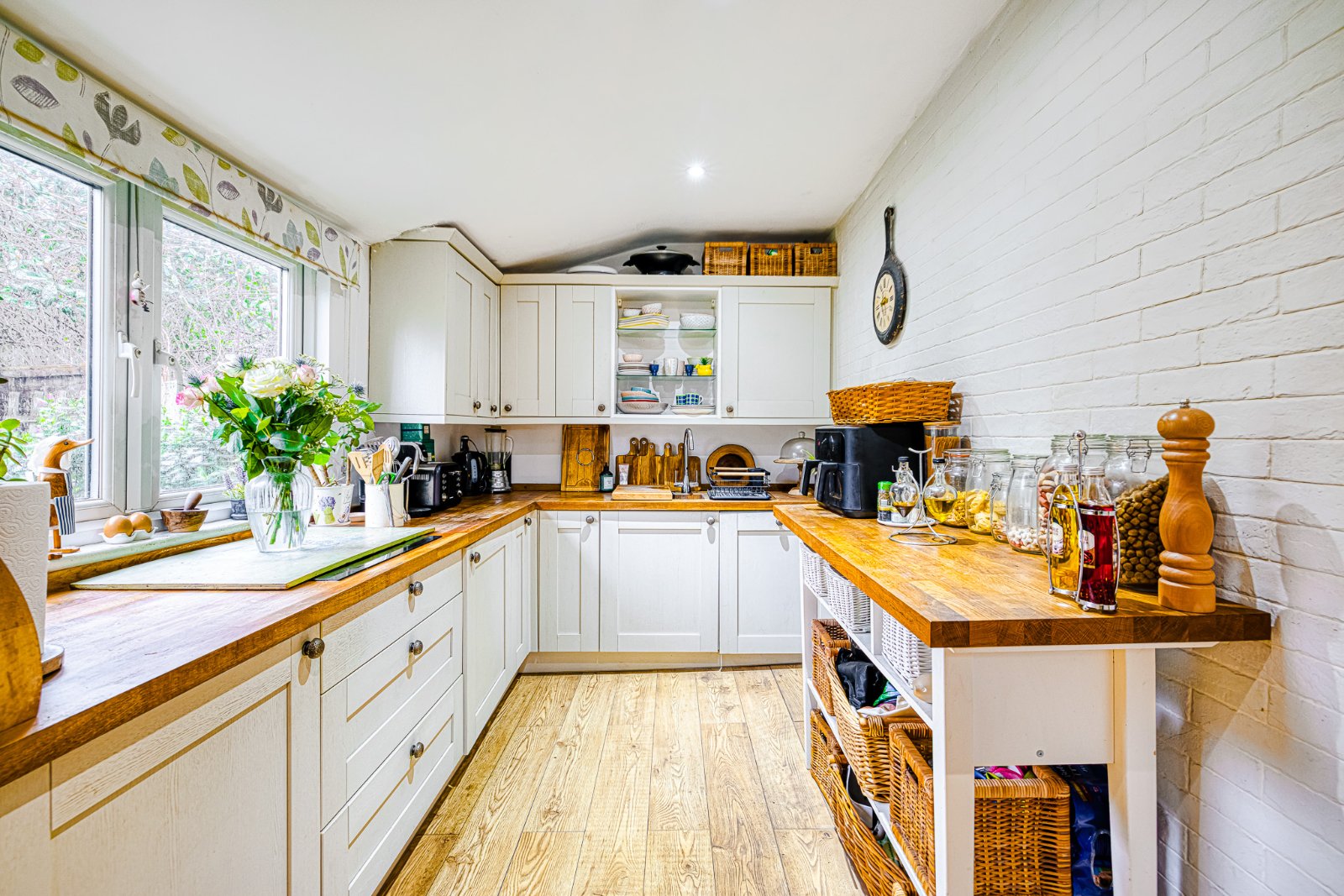 The kitchen combines traditional styling with modern fittings including oak work surfaces, butler sink and integrated appliances, with stable-door access to the garden. Planning permission has been approved for a kitchen extension, presenting a valuable opportunity for further enhancement (details available).