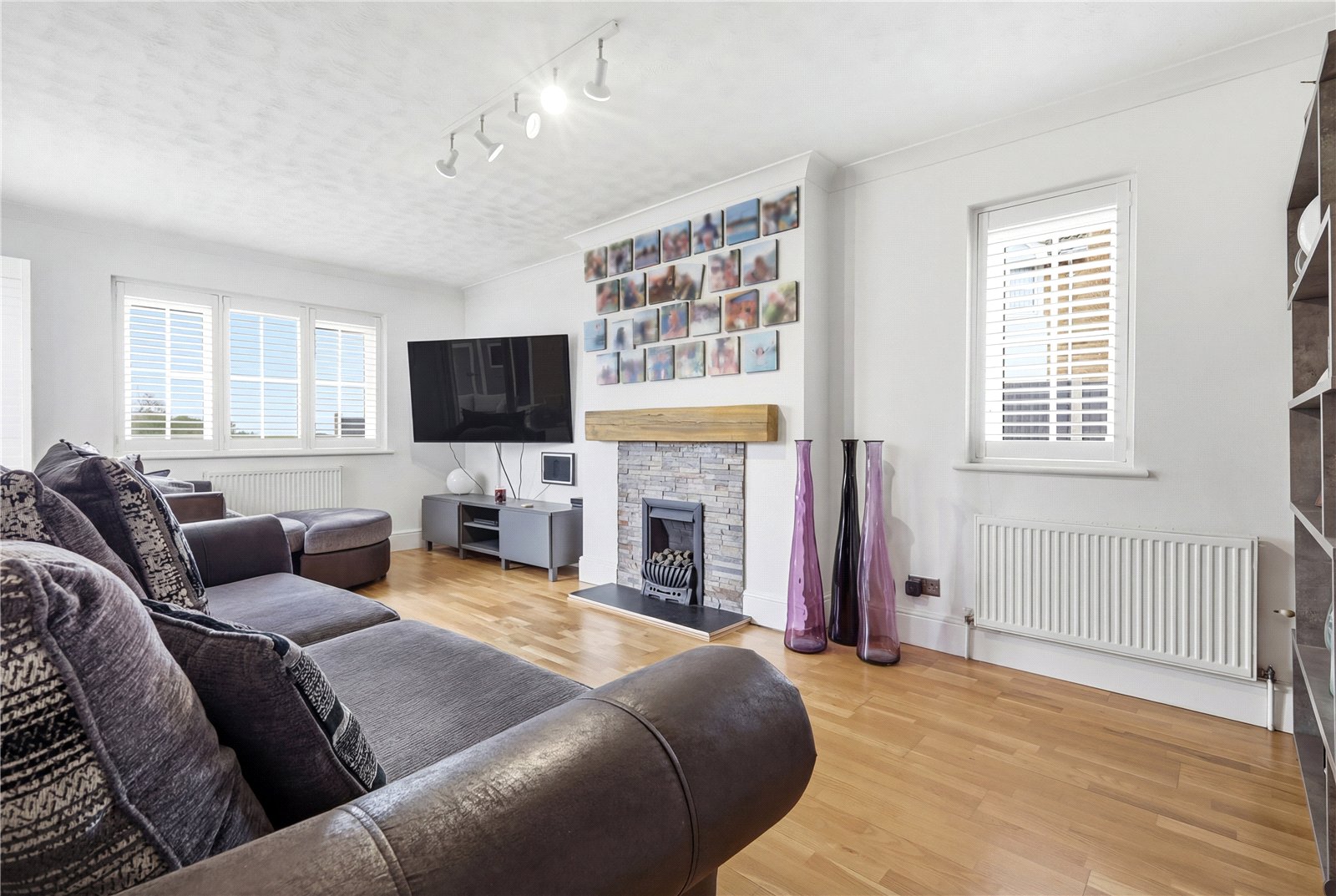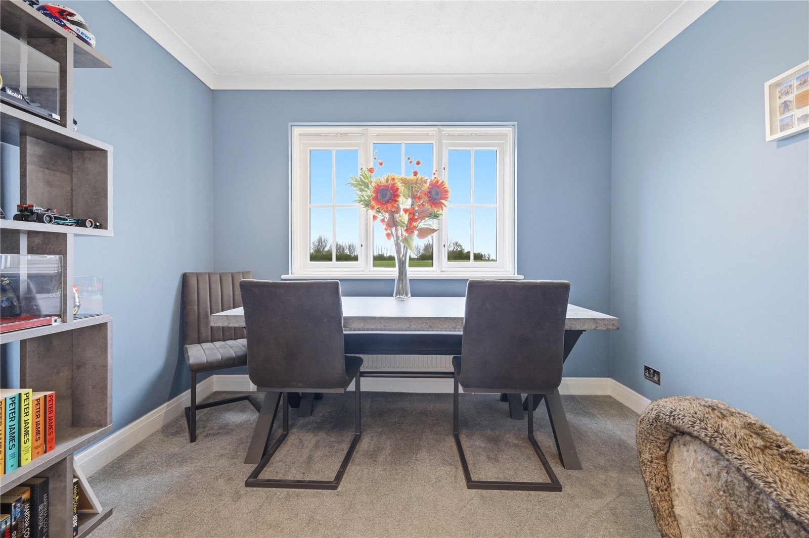 A triple aspect room with double glazed multi-pane style window to rear (with far-reaching views across open farmland), double glazed patio doors giving side access to the sun terrace and double glazed multi-pane window to side, all with bespoke fitted Plantation Shutters. Feature coal effect 'living flame' fire with split-faced slate backdrop, polished hearth and contemporary oak mantel. Two radiators. High level skirting. Oak flooring. Television aerial point. Coved cornice to ceiling.