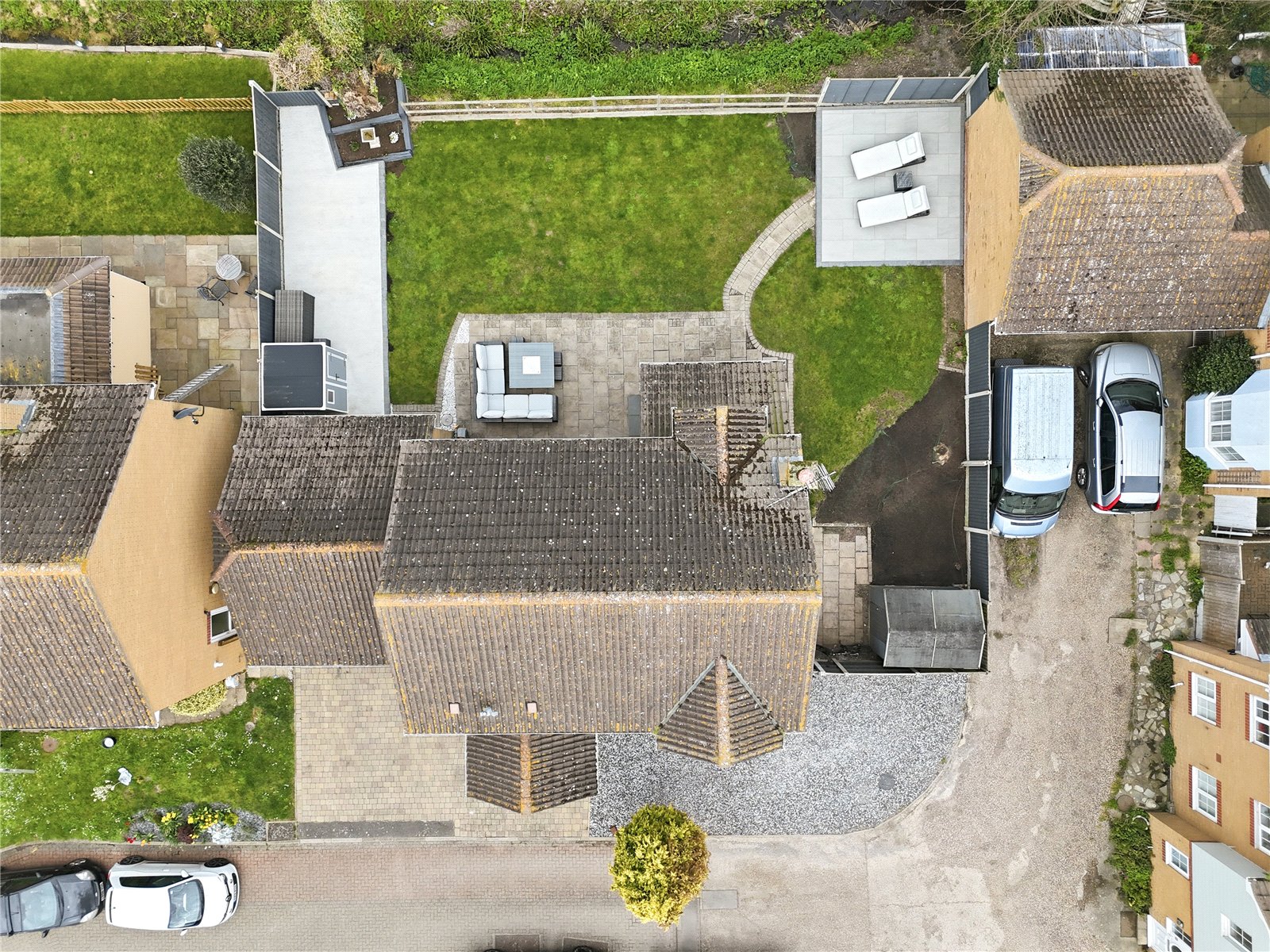 The large wrap-around rear garden commences from the sitting room with a rumbled stone terrace and brick paviour surround that extends as a footpath to a large porcelain tiled suntrap patio terrace with side screening at the end of the garden. The garden then extends to the side of the property with hardstanding for timber garden shed and an additional east facing garden area with secure timber gated side access to the front of the property. There is a large hardstanding area, perfect for locating a garden lodge/cabin. Open fencing to the rear taking full advantage of the panoramic farmland views. Personal door to:
