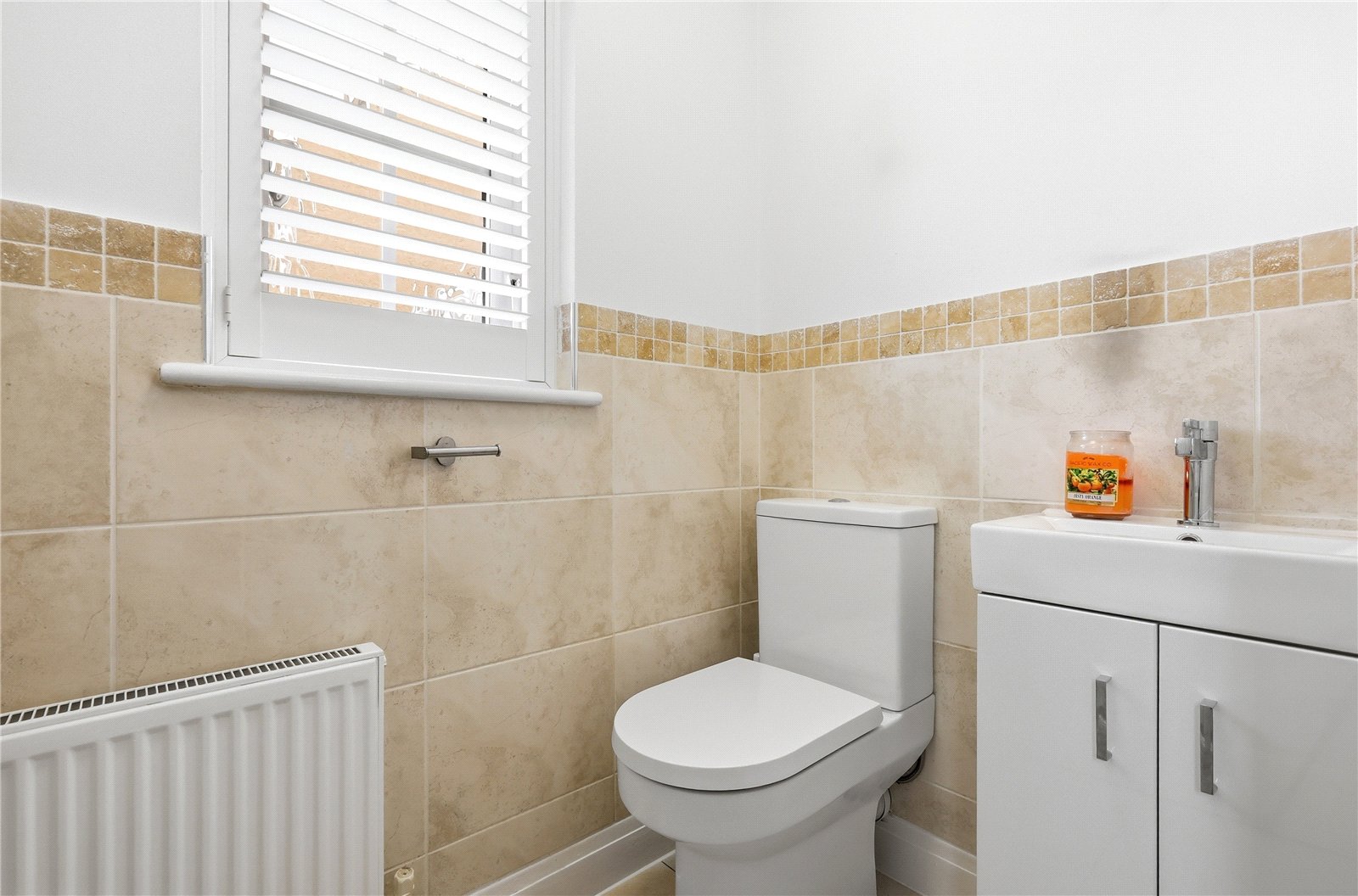 Obscure uPVC double glazed multi-pane window to side with bespoke fitted Plantation Shutter. Radiator. Tiling to half height with travertine mosaic tiled border. Fitted with a two piece suite comprising dual flush close coupled WC and vanity wash basin with designer mixer tap and gloss fronted storage cupboard. Tiled floor. Lipped skirting. Smooth plastered ceiling.