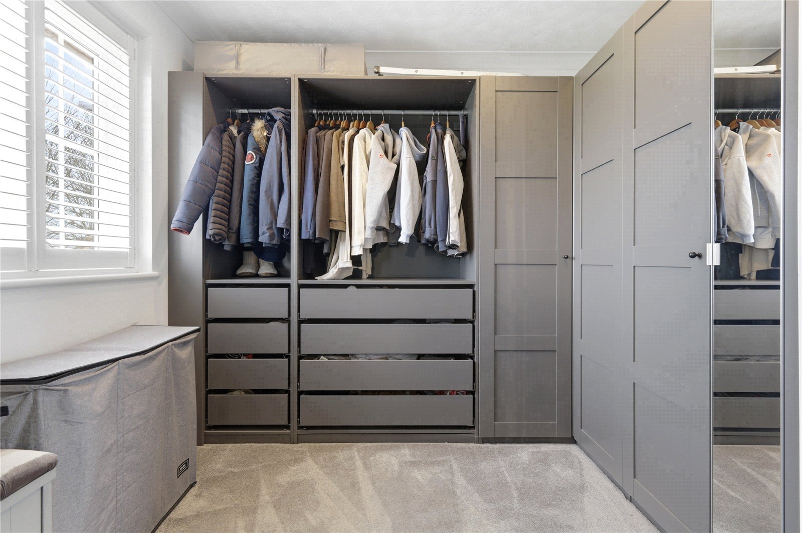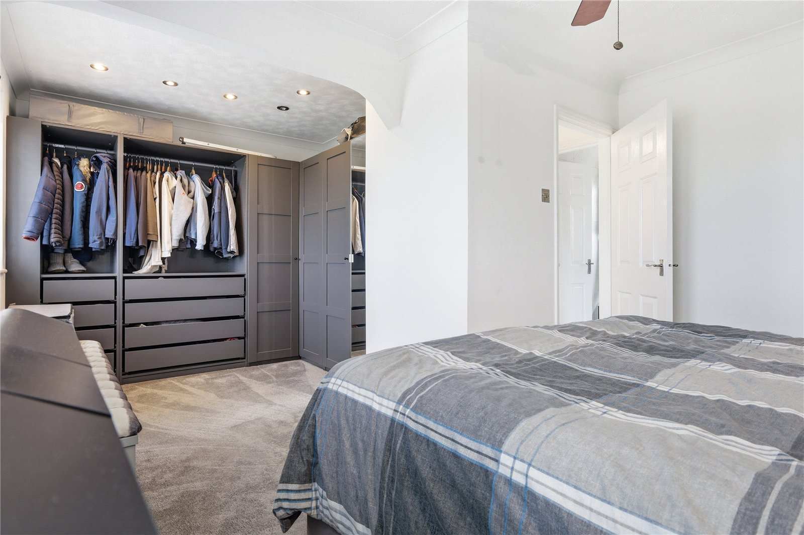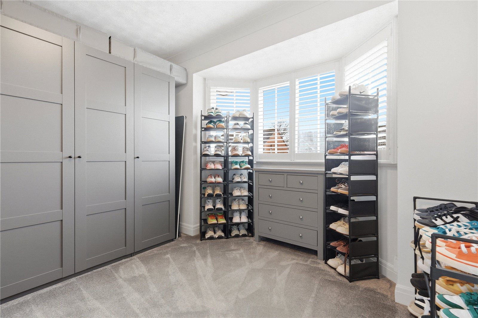 uPVC double glazed multi-pane bay window to front with bespoke fitted Plantation Shutters. Lipped skirting. Radiator. Fitted with a range of bedroom furniture comprising full-height wardrobe cupboards with corner extra-space unit, drawers and drawer stack. Coved cornice to ceiling.