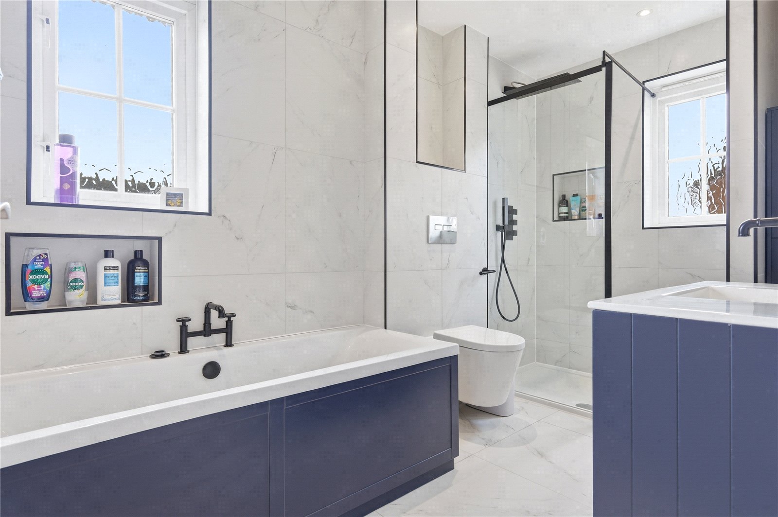 An exceptionally spacious spa-style family bathroom with obscure uPVC double glazed multi-pane windows to front and side. Recently refitted with a luxury four-piece suite comprising integrated cistern WC, panel enclosed executive bath with designer mixer tap and centre faucet, double width vanity wash basin with designer mixer tap, storage cupboards and drawer stack beneath with matching fitted recessed bathroom furniture, and frameless walk-in shower enclosure with rainwater and hand held fittings with recessed storage and display shelving. Heated towel rail. Full porcelain tiled floor and walls. Smooth plastered ceiling with recessed LED lighting and extractor fan. Drop light switch.