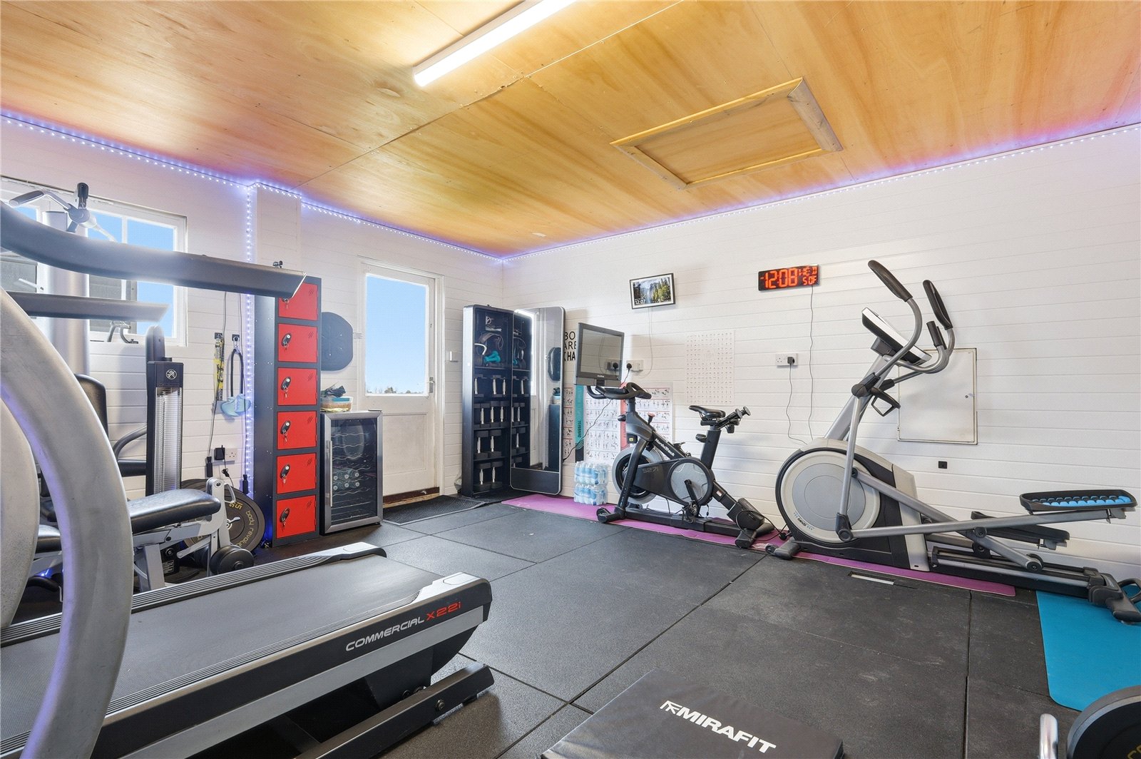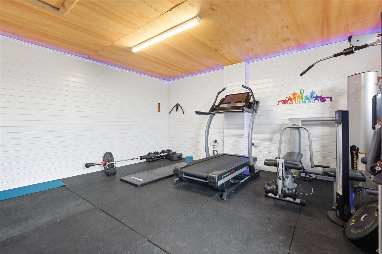 Currently arranged as a home gymnasium or leisure room, with power and light connected. Suitable for a variety of uses and could easily be reinstated as a garage. Access to loft storage area, with uPVC double glazed multi-pane window to rear.