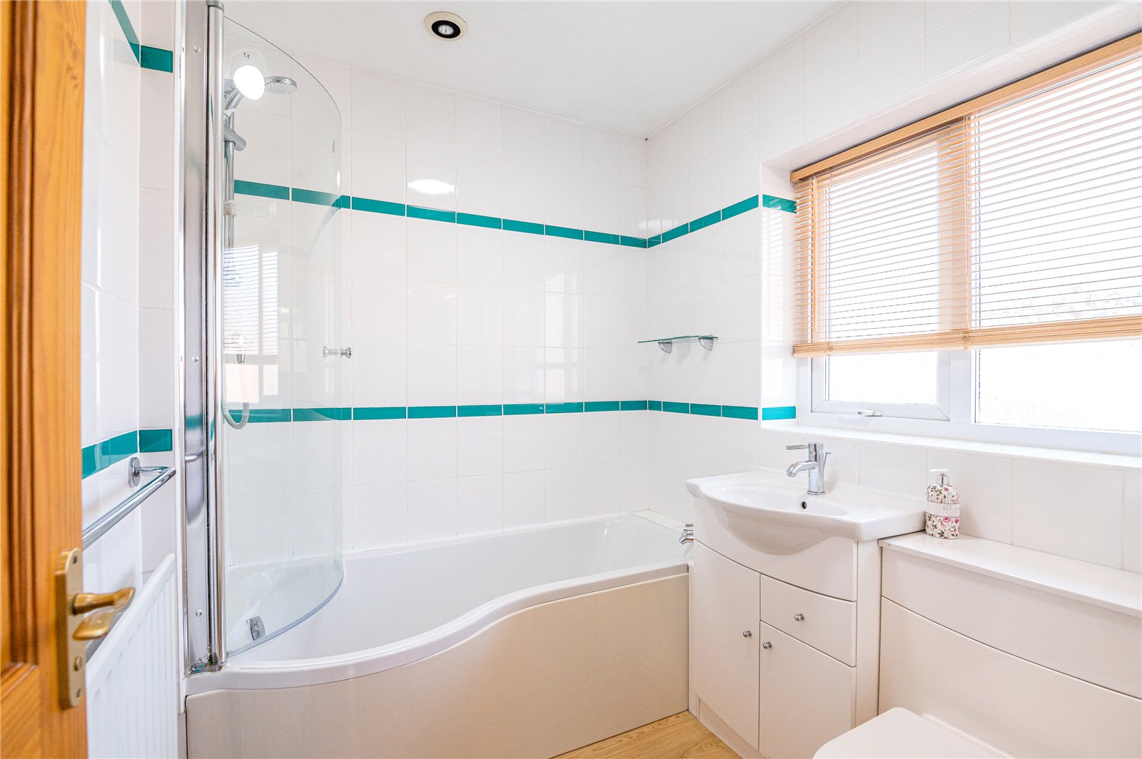 Obscure uPVC double glazed window to side. Fitted with a three piece suite comprising panel enclosed P-shaped bath with frameless glass shower screen and independent power shower above, and fitted bathroom furniture comprising vanity wash handbasin with designer mixer tap and cupboard and storage drawer, and integrated cistern dual-flush WC. Radiator. Full ceramic tiling to all walls, with inset feature glass tiled borders. Wall light point. Drop light switch.