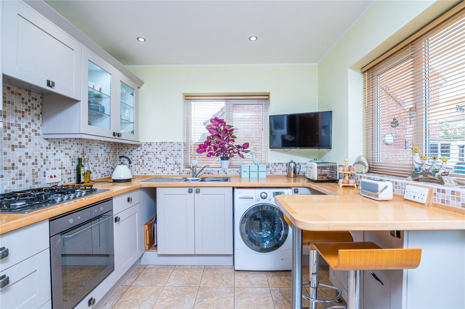 A dual aspect room, with uPVC double glazed door giving access to the landscaped rear garden, and uPVC double glazed windows to side and rear. The kitchen has been professionally planned and fitted with a bespoke range of shaker style cabinets in French grey with bespoke steamed beech polished working surfaces with upstand and mosaic tiled splashbacks to all surface areas. Inset one and a quarter bowl stainless steel sink unit with designer mixer tap. A peninsular breakfast bar. Space, plumbing and drainage for automatic washing machine. Space for upright fridge/freezer. The integrated appliances include split-level fan-assisted electric oven with five-ring centre wok burner gas hob and concealed extractor canopy above. One double and one single glazed display cupboard illuminated, and under unit lighting. Cupboard giving access to 'Worcester' gas combination boiler serving domestic hot water and central heating system (installed 2019). Smooth plastered ceiling with recessed LED lighting.