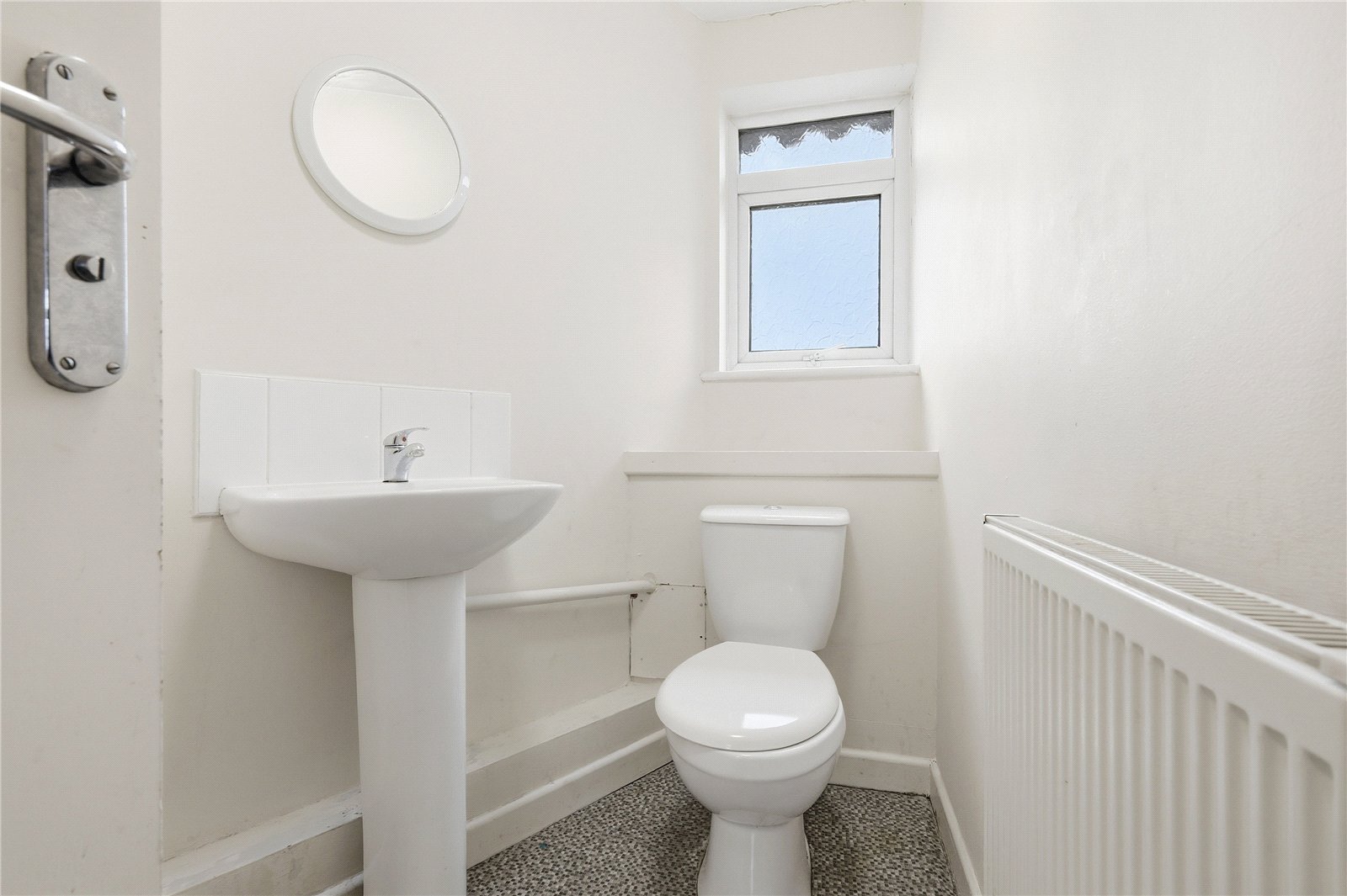 UPVC double obscured glazed window to front. Two piece suite comprising low flush WC and pedestal wash basin with mixer tap. Wall mounted radiator. Tiled flooring. High level skirting. Smooth plastered ceiling.
