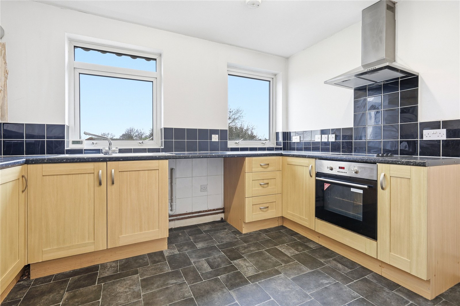 Two UPVC double glazed windows to front. Kitchen is fitted with a range of base level Shaker style cabinets incorporating a rolled edge working surface. Inset stainless steel sink with mixer tap and drainer unit. Inset four burner ceramic hob with canopied extractor hood above. Integrated electric fan assist oven. Space and plumbing for washing machine. Space for free standing fridge/freezer. Wall mounted combination gas fired boiler. Tiled splashbacks. Tiled effect vinyl flooring. High level skirting. Smooth plastered ceiling.
