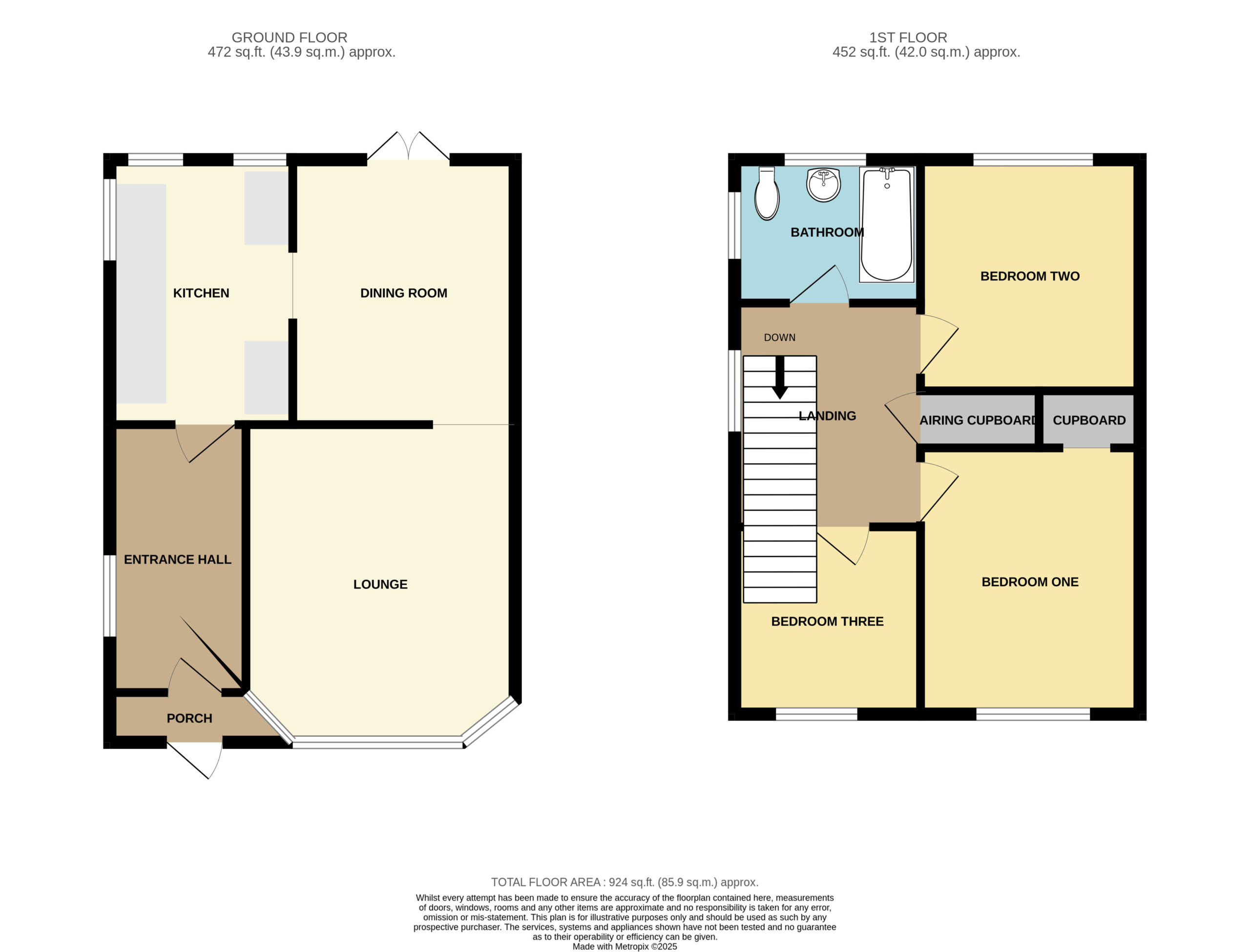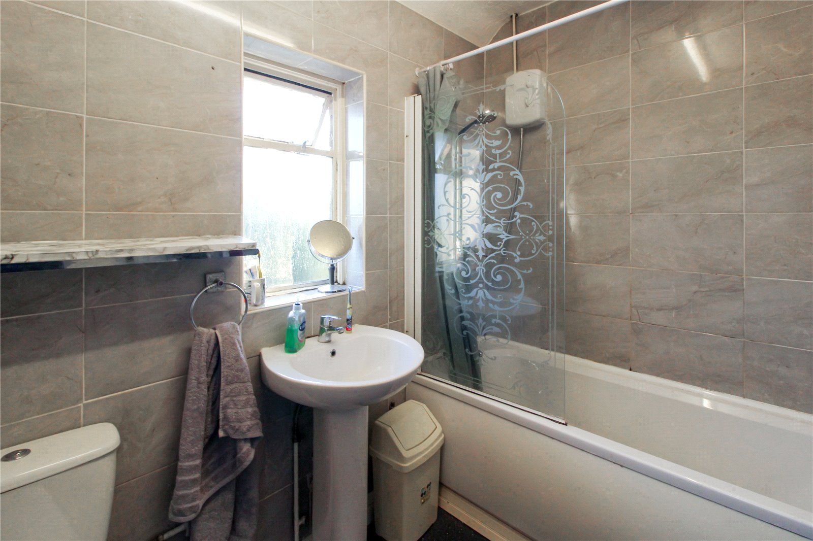 Three piece suite comprising, bath with shower over, sink and WC, lino to floor, tiled walls, extractor, ceiling light, radiator, windows to side and rear.