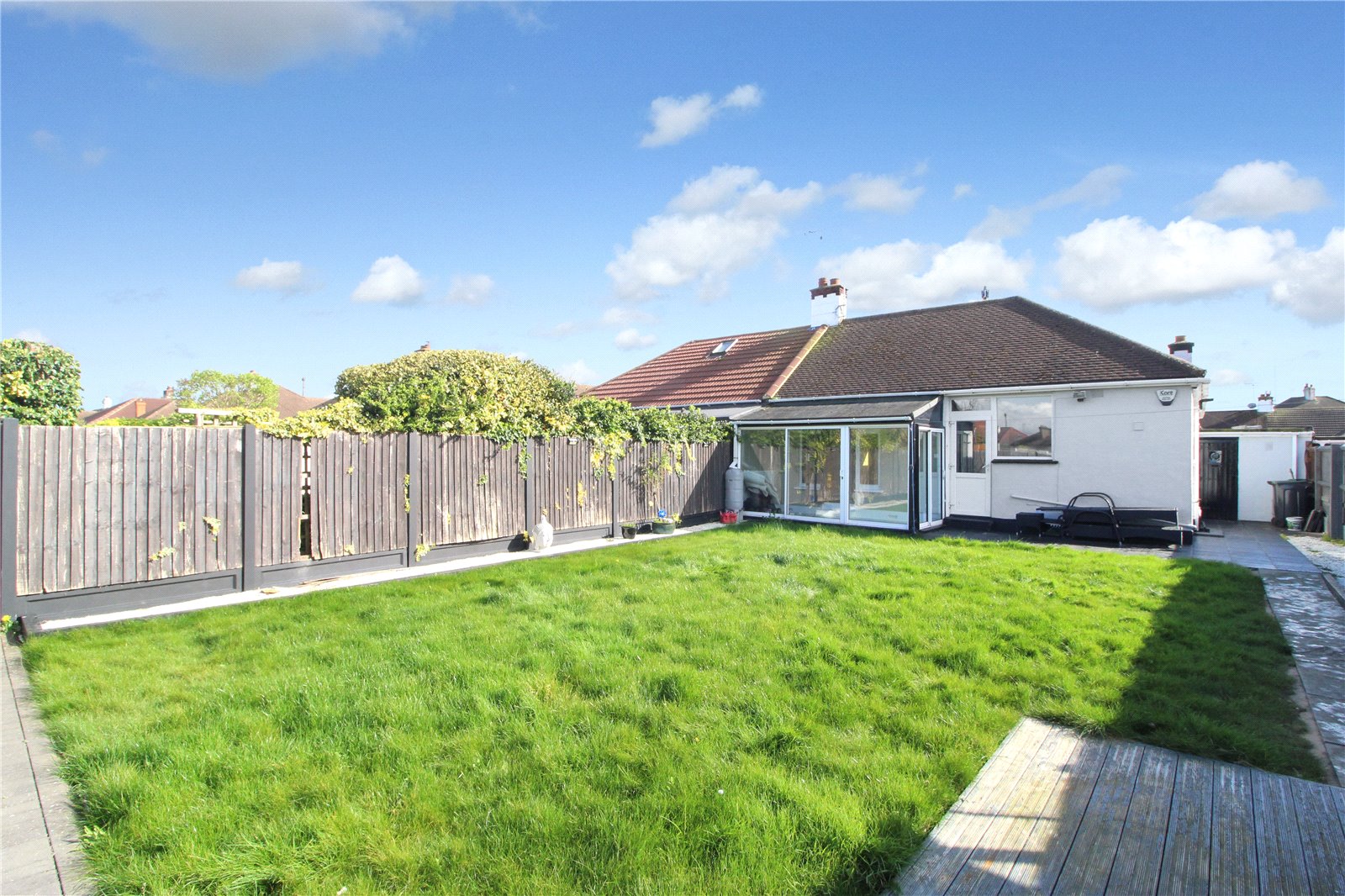 Commencing from the kitchen and conservatory, the rear wedge-shaped garden measures approximately 80ft in depth and provides areas of lawn, patio, decking and hardstanding.