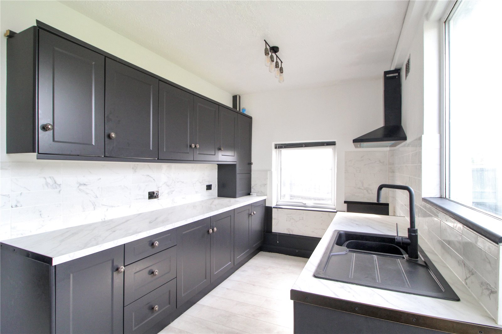 Cupboard housing wall-mounted Vaillant boiler. Space for cooker. Extractor hood. Space for fridge. Space and power for appliance under worktop. Laminate wood-effect flooring. Two ceiling lights.