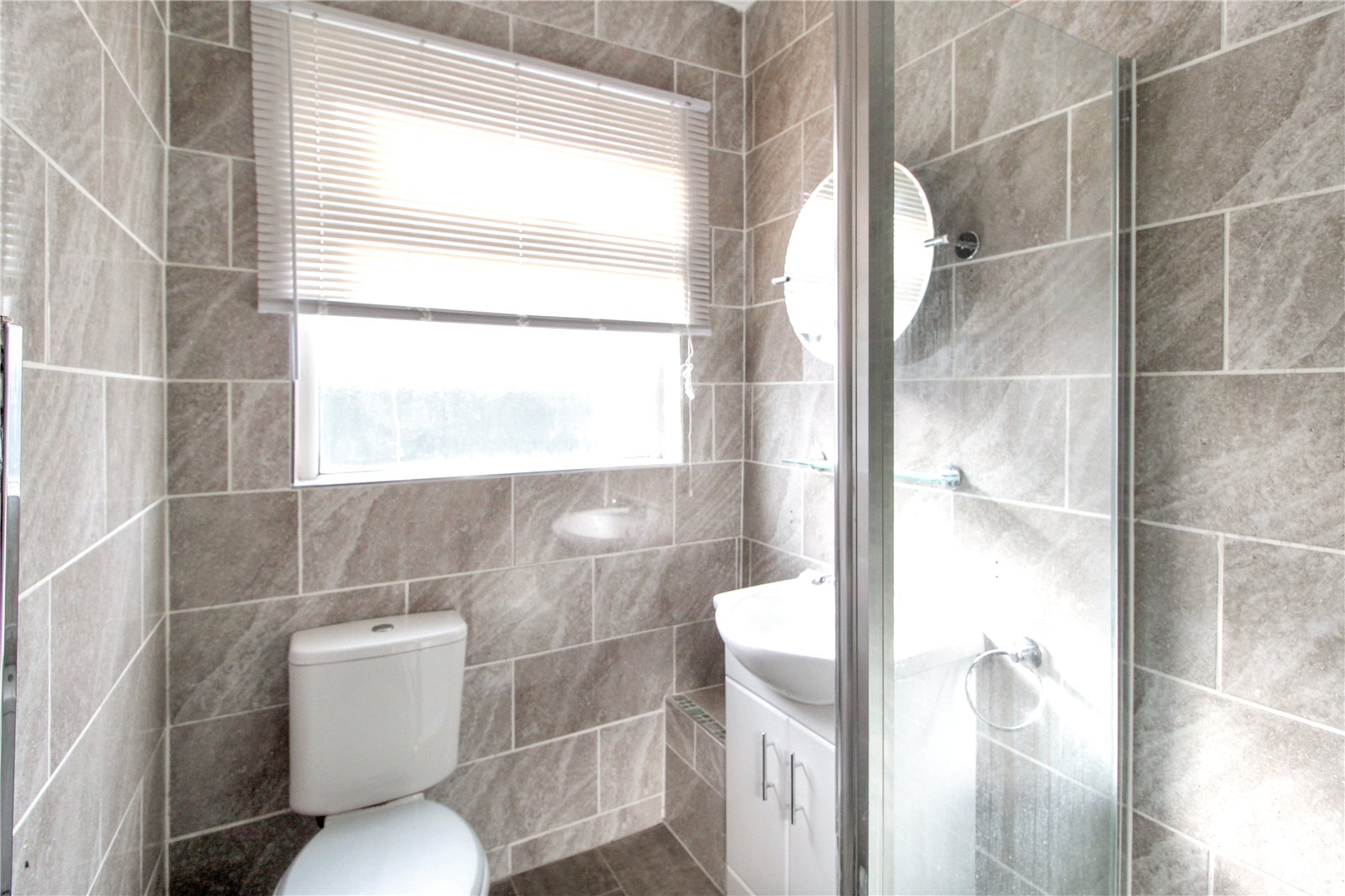 uPVC obscured double glazed window to side. Fully tiled three-piece suite comprising low level wc, wash basin with mixer tap and cupboards underneath, large shower unit with mixer tap. Vinyl flooring. Heated towel rail. Spotlights.