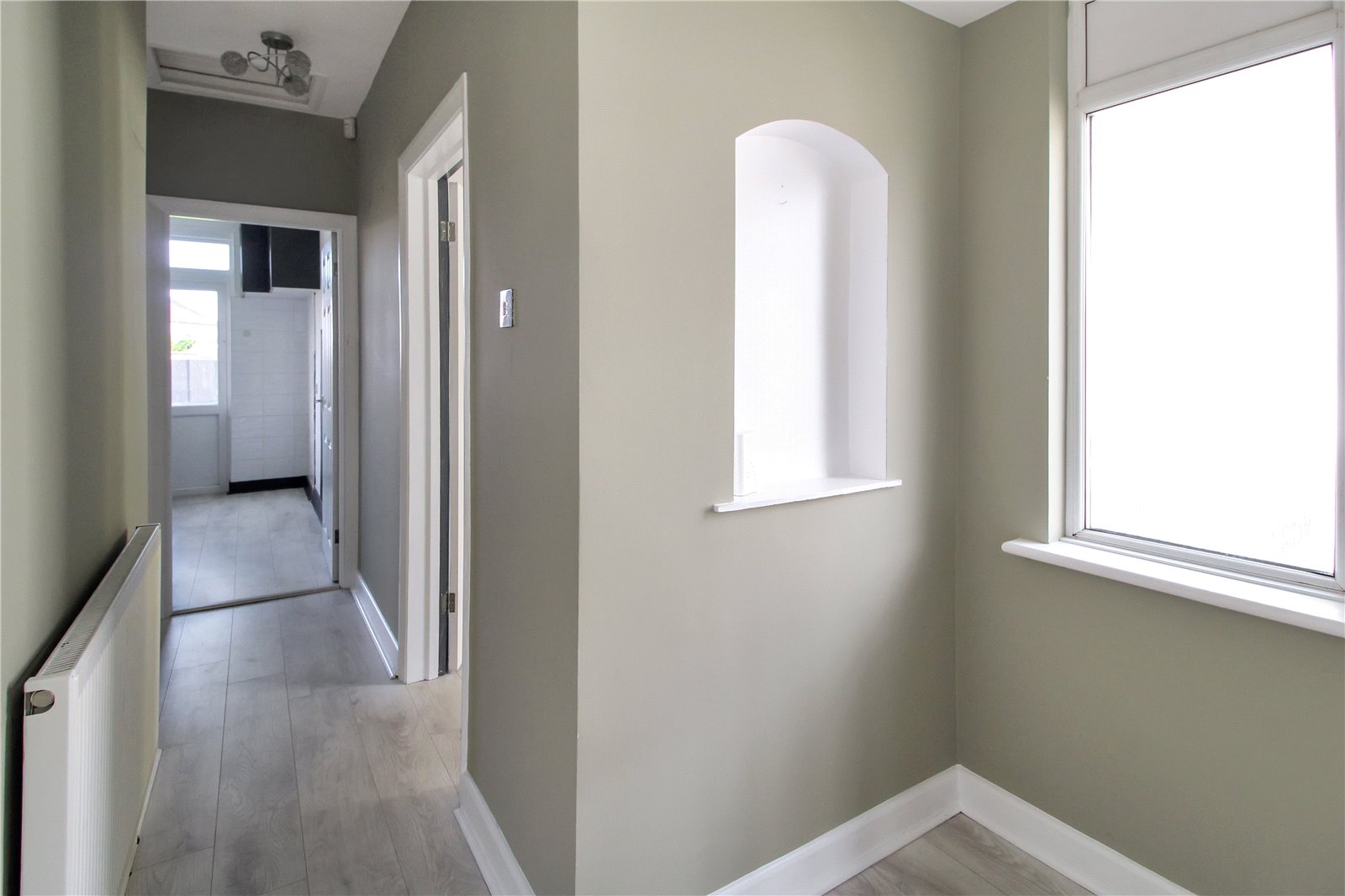 Laminate wood-effect flooring. Skirting. Radiator. Storage cupboard housing electric meter, gas meter and alarm. Separate full-height storage cupboard. Two ceiling lights. Loft access.