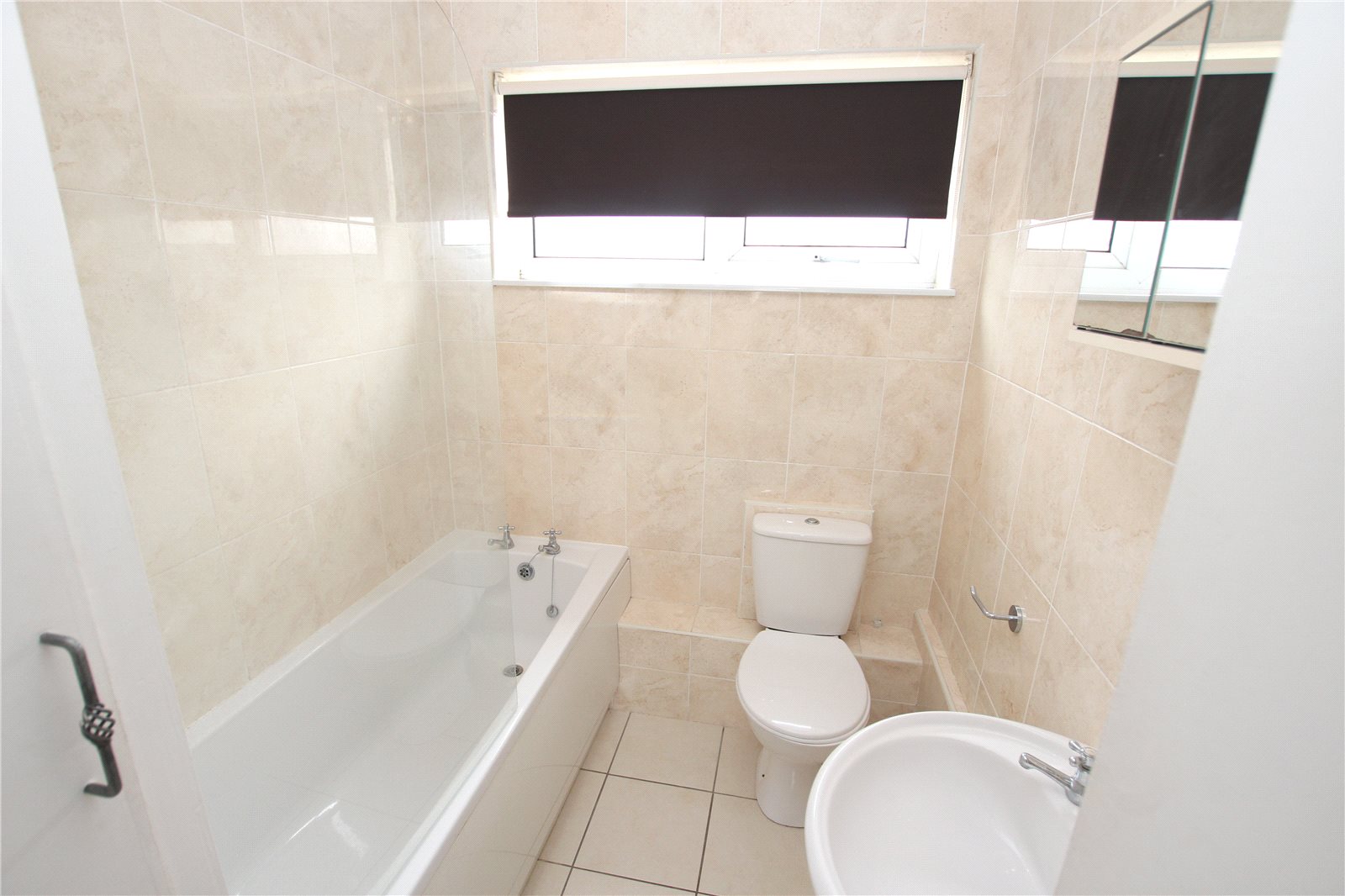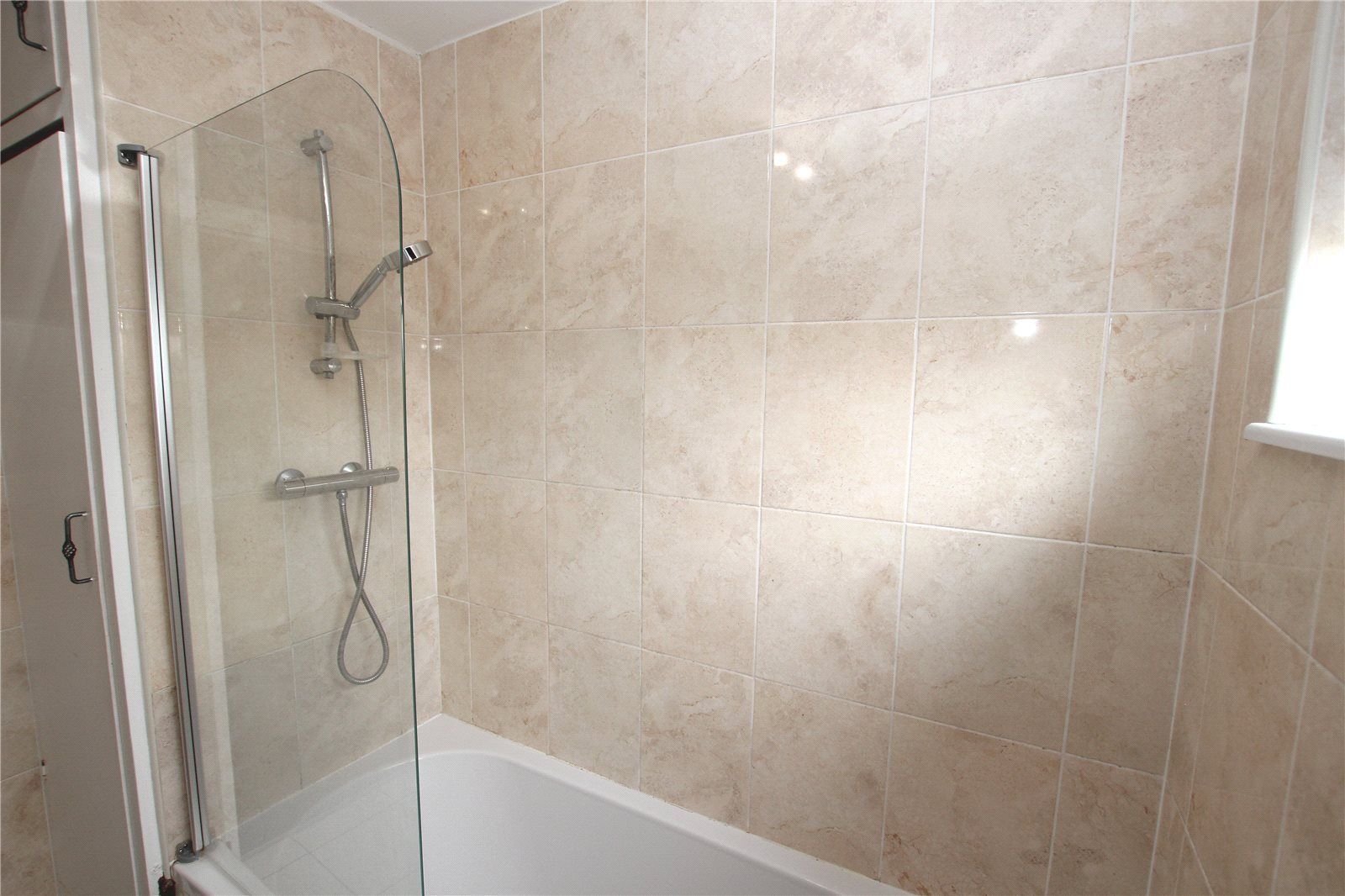 A modern fully tiled room with shower above bath.