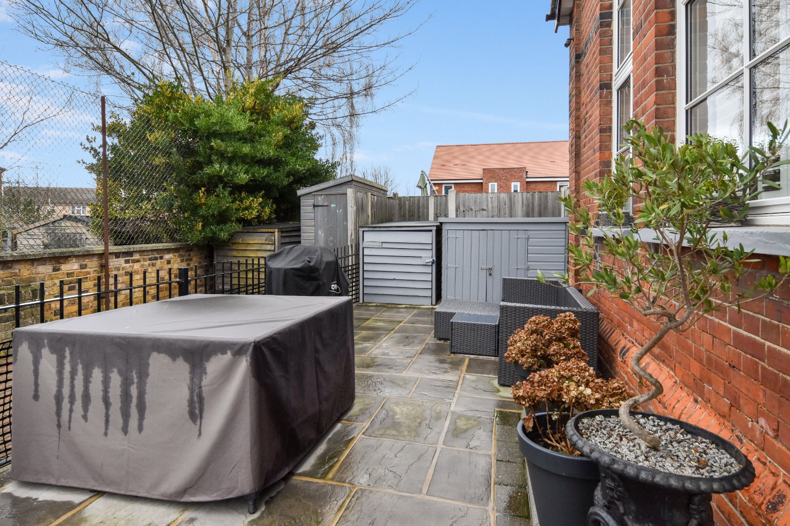 Black railings with corresponding gate providing access to the Garden/Patio area which has established shrubs to borders and attractive laid patio seating area. Ideally offering a West facing outside space which enjoys the best the of the days sun! There are two Exterior Storage Units with one offering power supply.