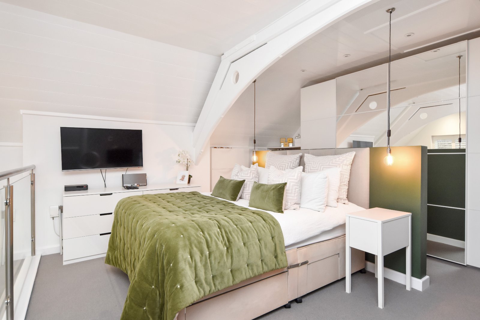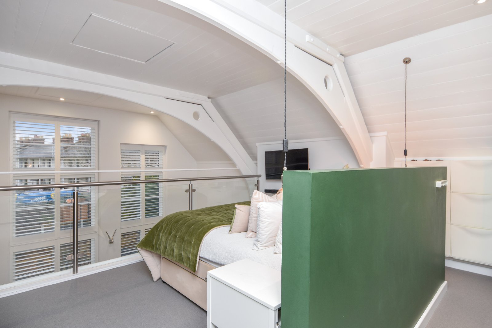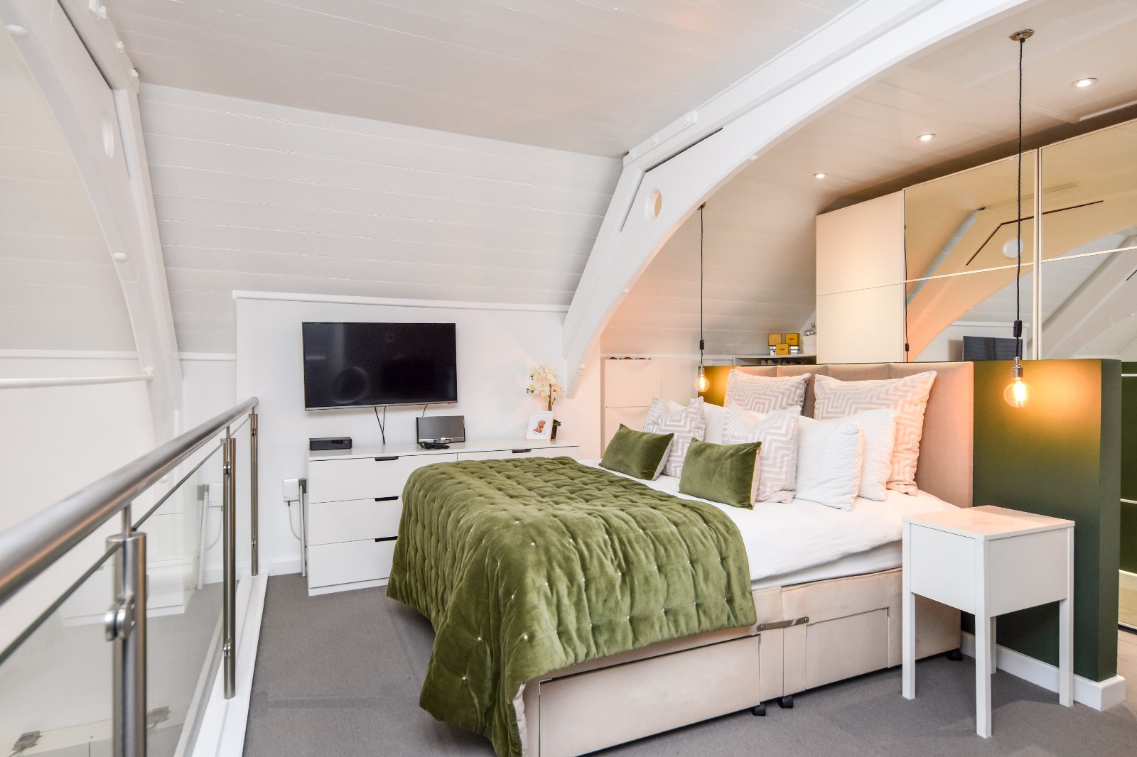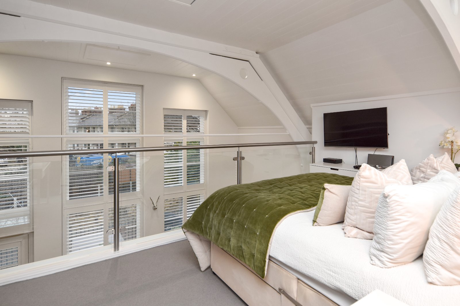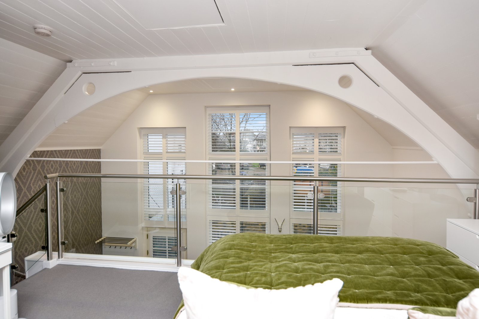 Beautiful full width glass and steel balustrade that extends across the bedroom overlooking the Living Room area.