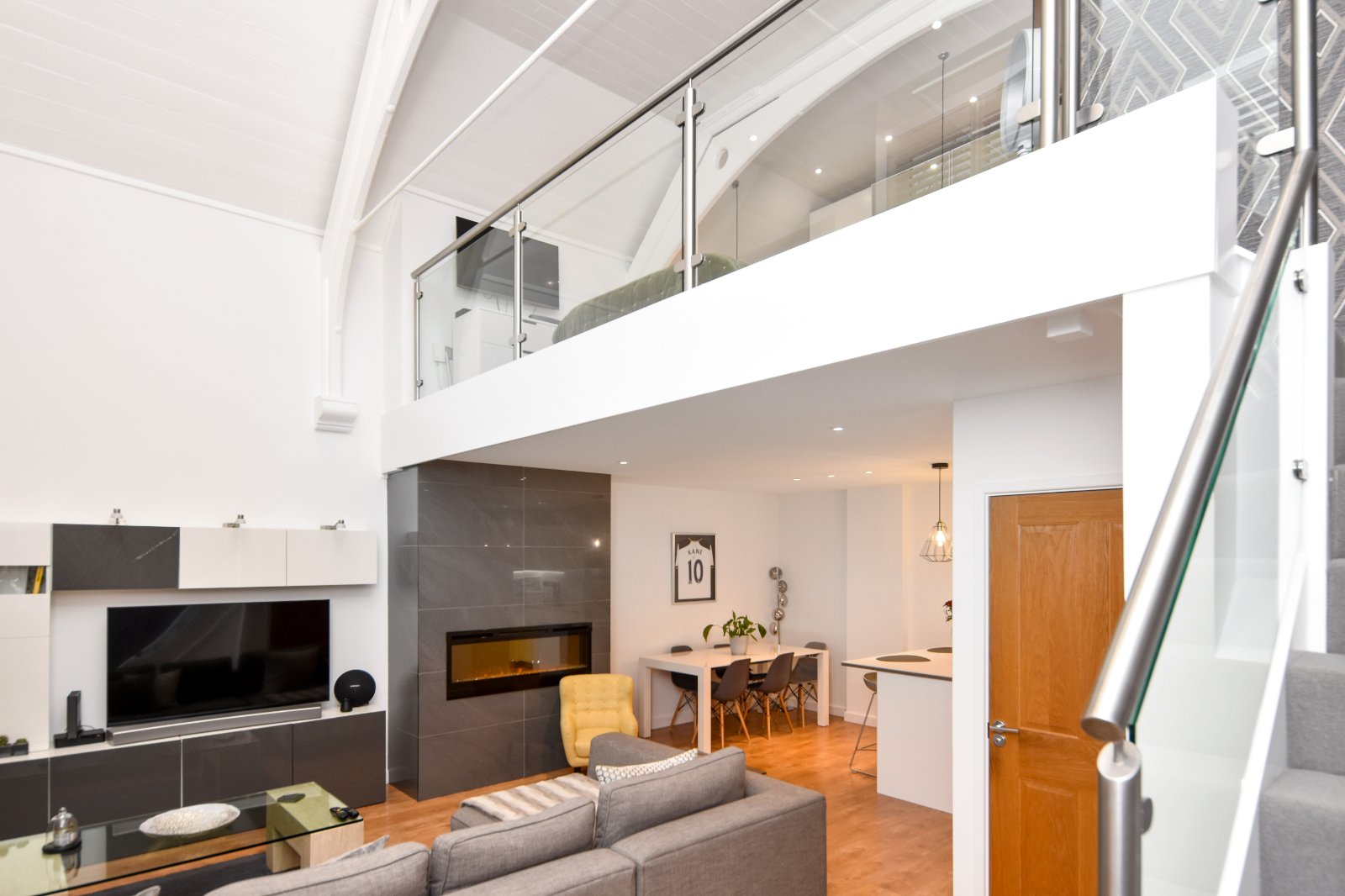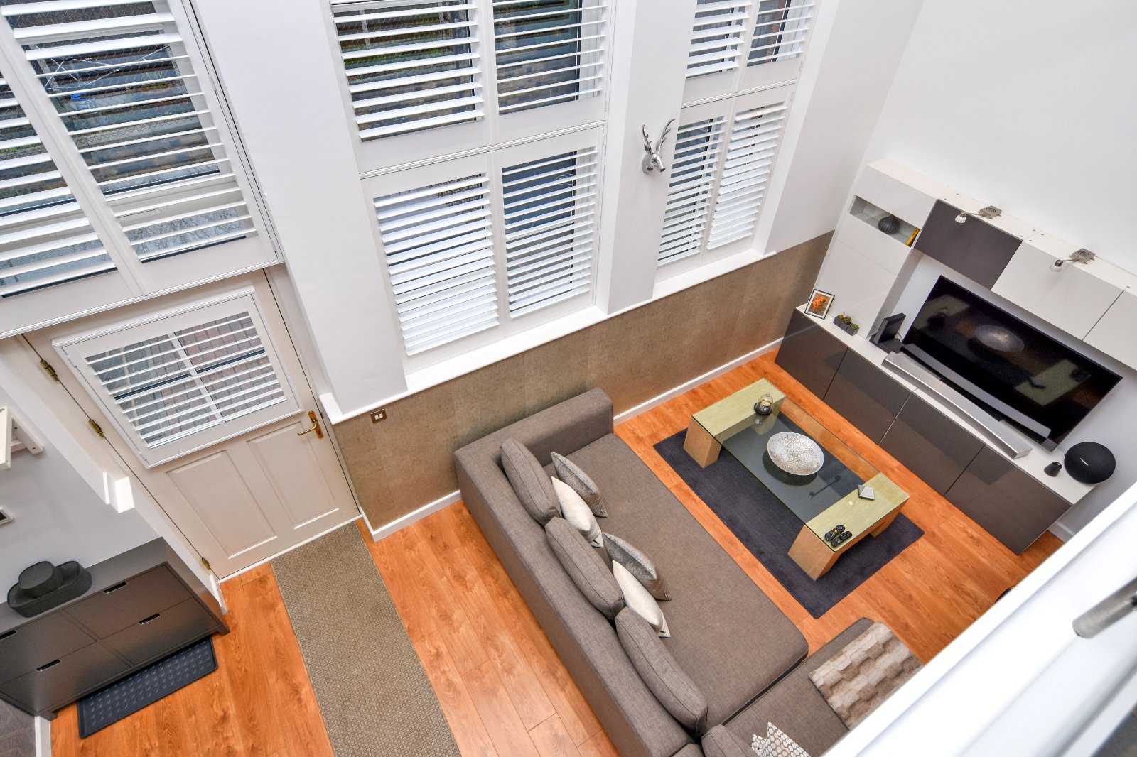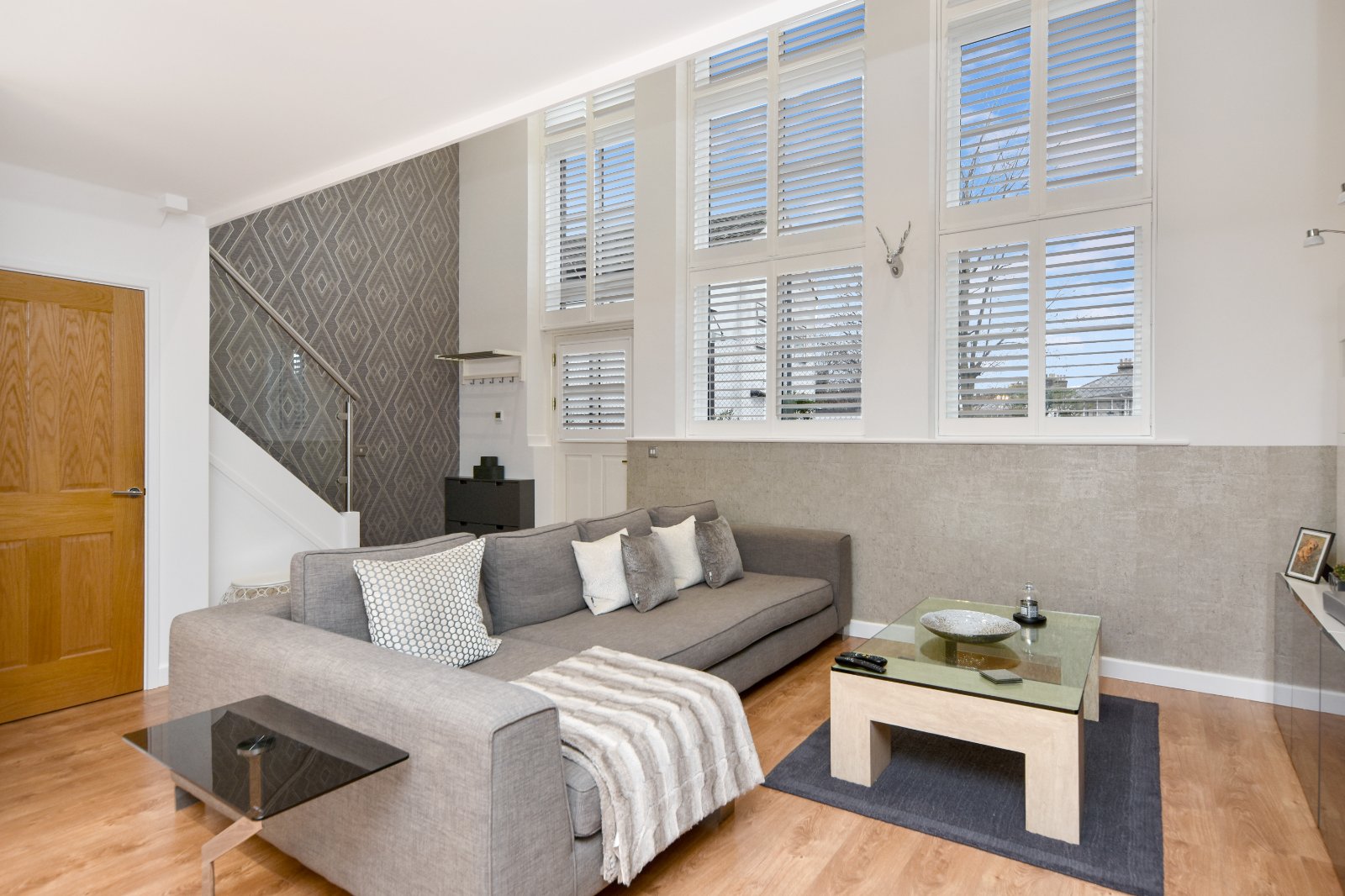 The First Floor is a distinctive highlight, accessible via a turned staircase with an elegant glass and steel balustrade. This feature extends across the full width of the first-floor mezzanine level, offering views from the front full-height windows. These windows are fitted with high-quality made-to-measure shutter blinds.