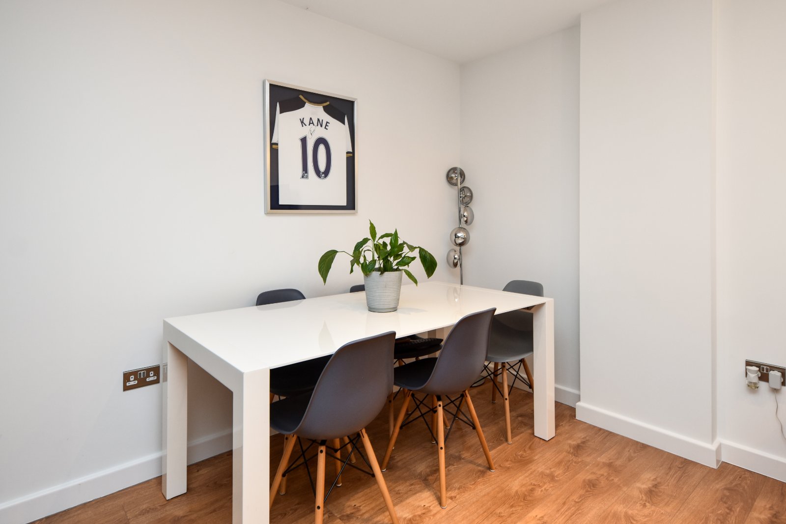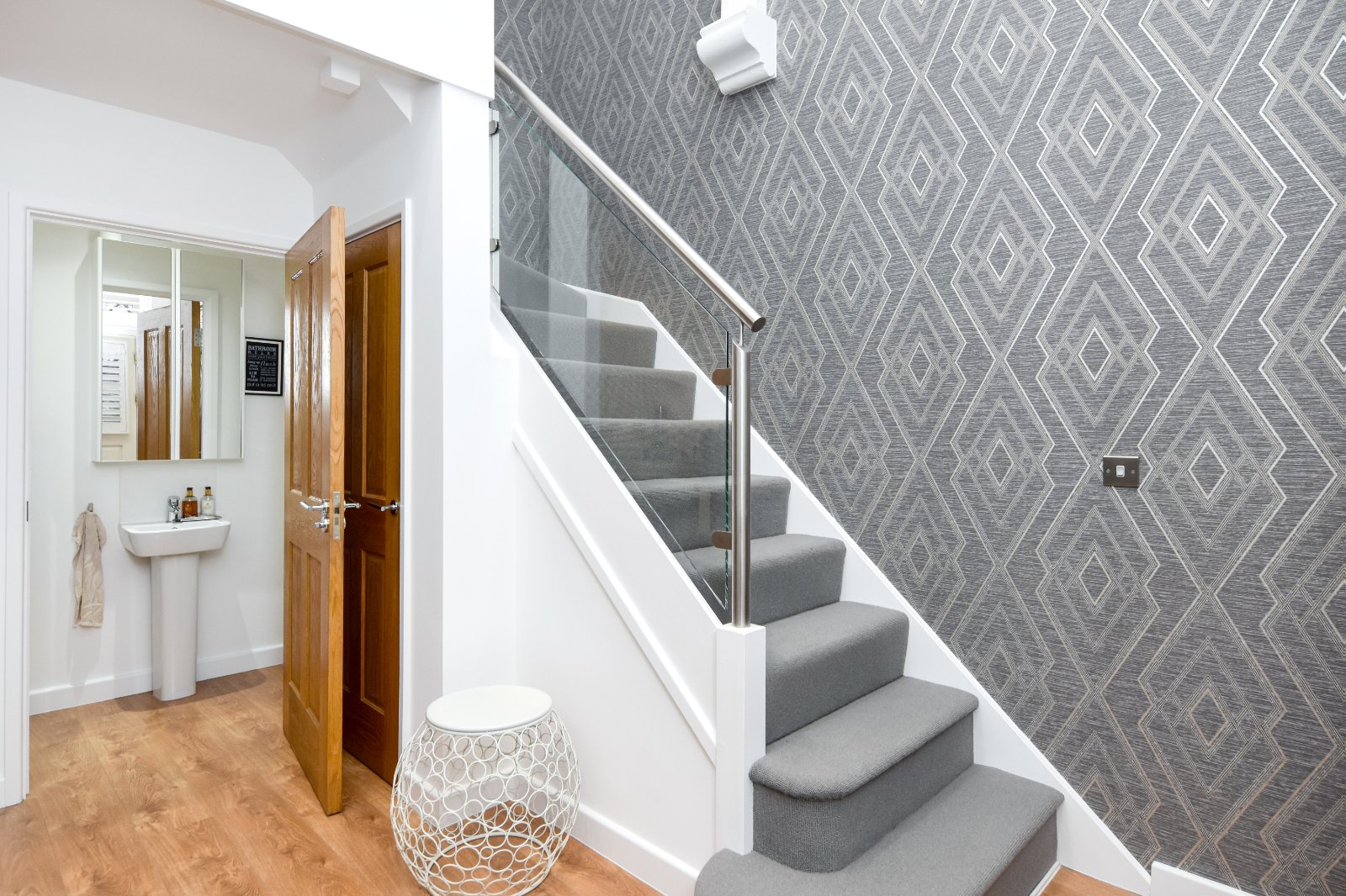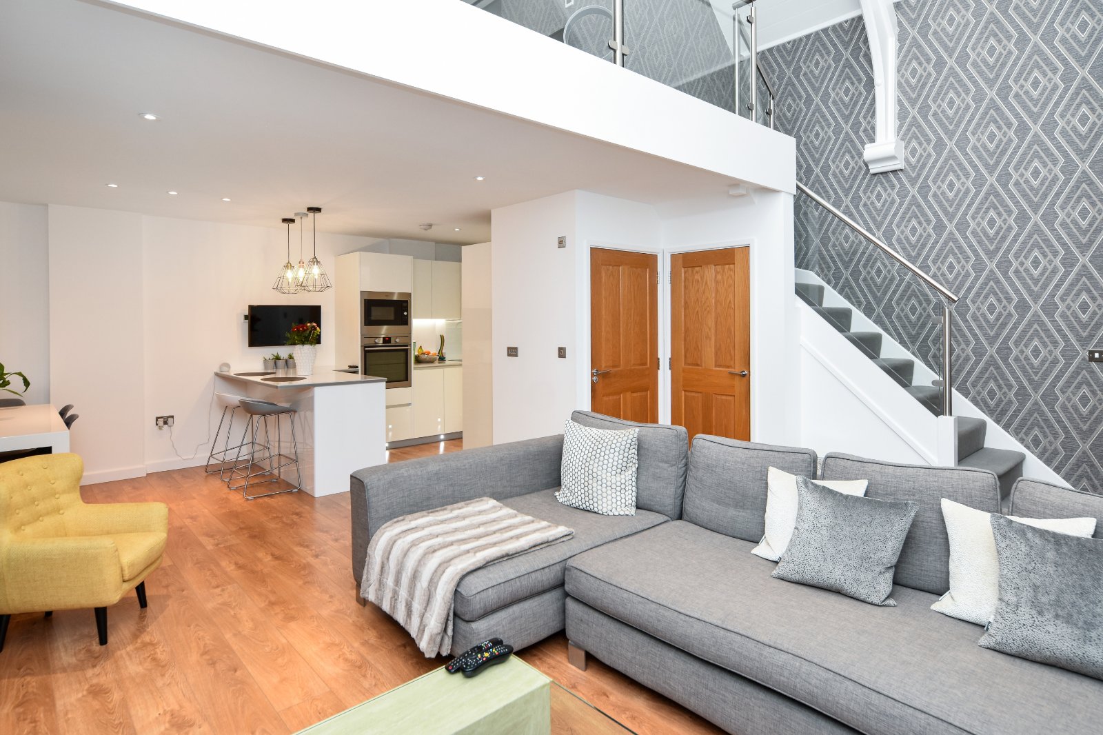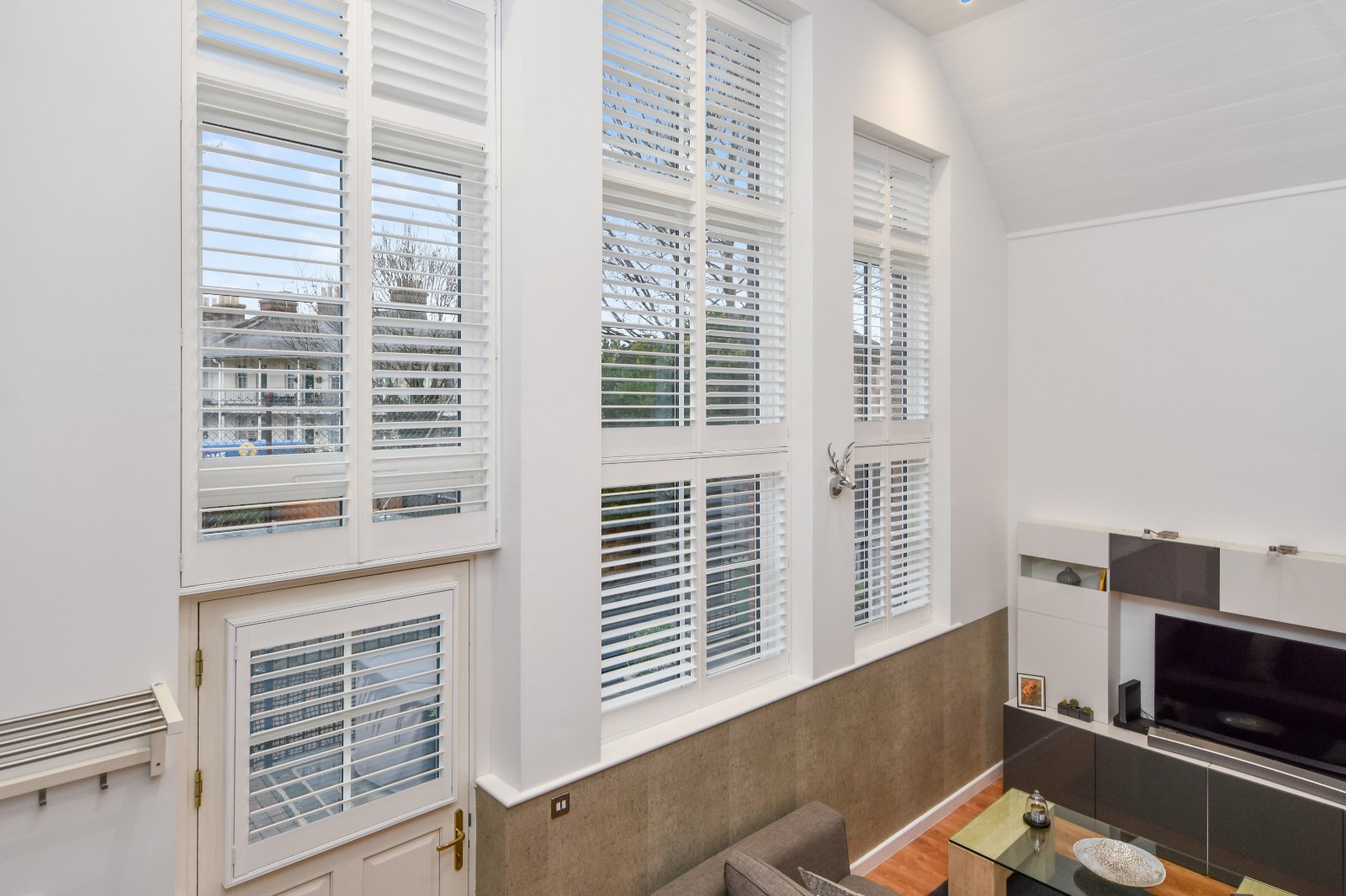 The First Floor is a distinctive highlight, accessible via a turned staircase with an elegant glass and steel balustrade. This feature extends across the full width of the first-floor mezzanine level, offering views from the front full-height windows. These windows are fitted with high-quality made-to-measure shutter blinds.