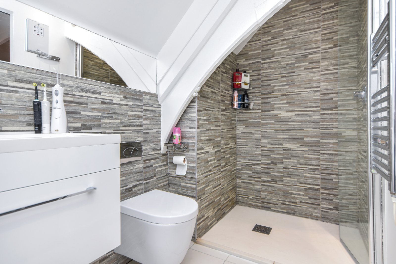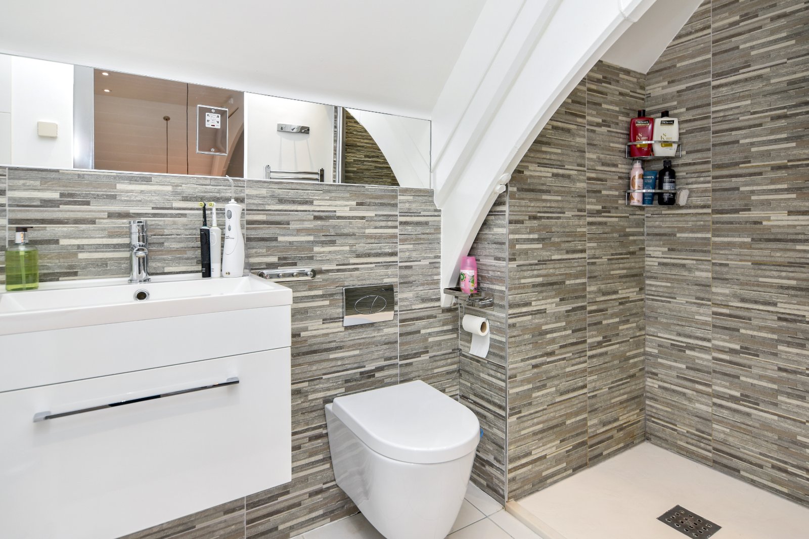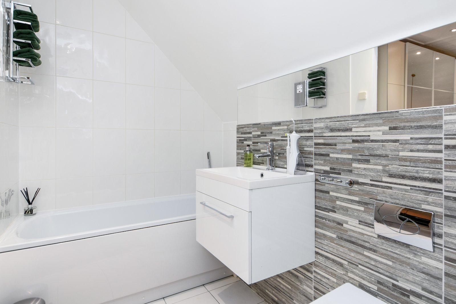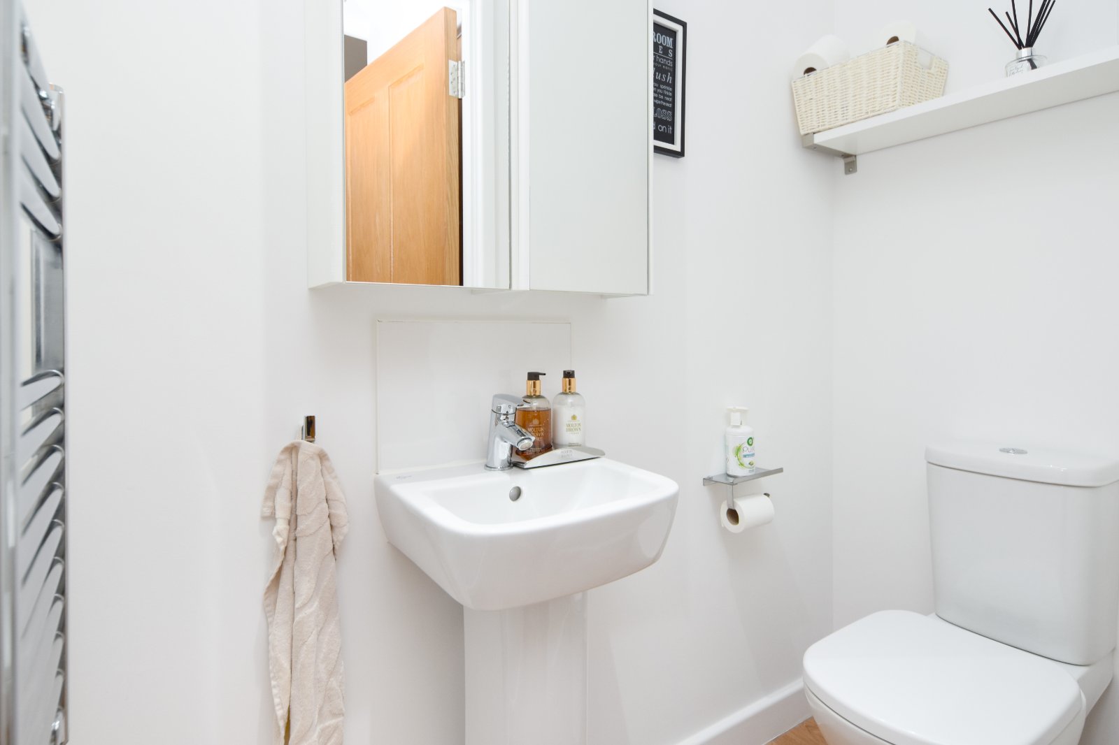 The modern white two piece white suite comprises dual flush WC and pedestal wash hand basin with mixer tap over and splashback tiling. Wall mounted mirror fronted bathroom cabinet. Tiled flooring. Electric heated towel rail. Smooth plastered ceiling inset with and recessed lighting.