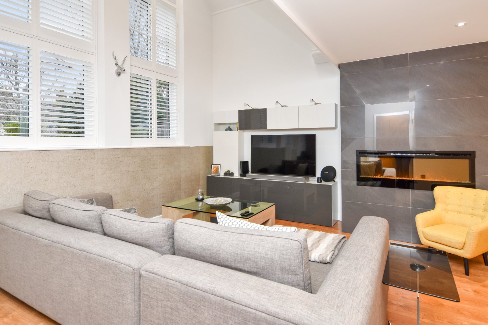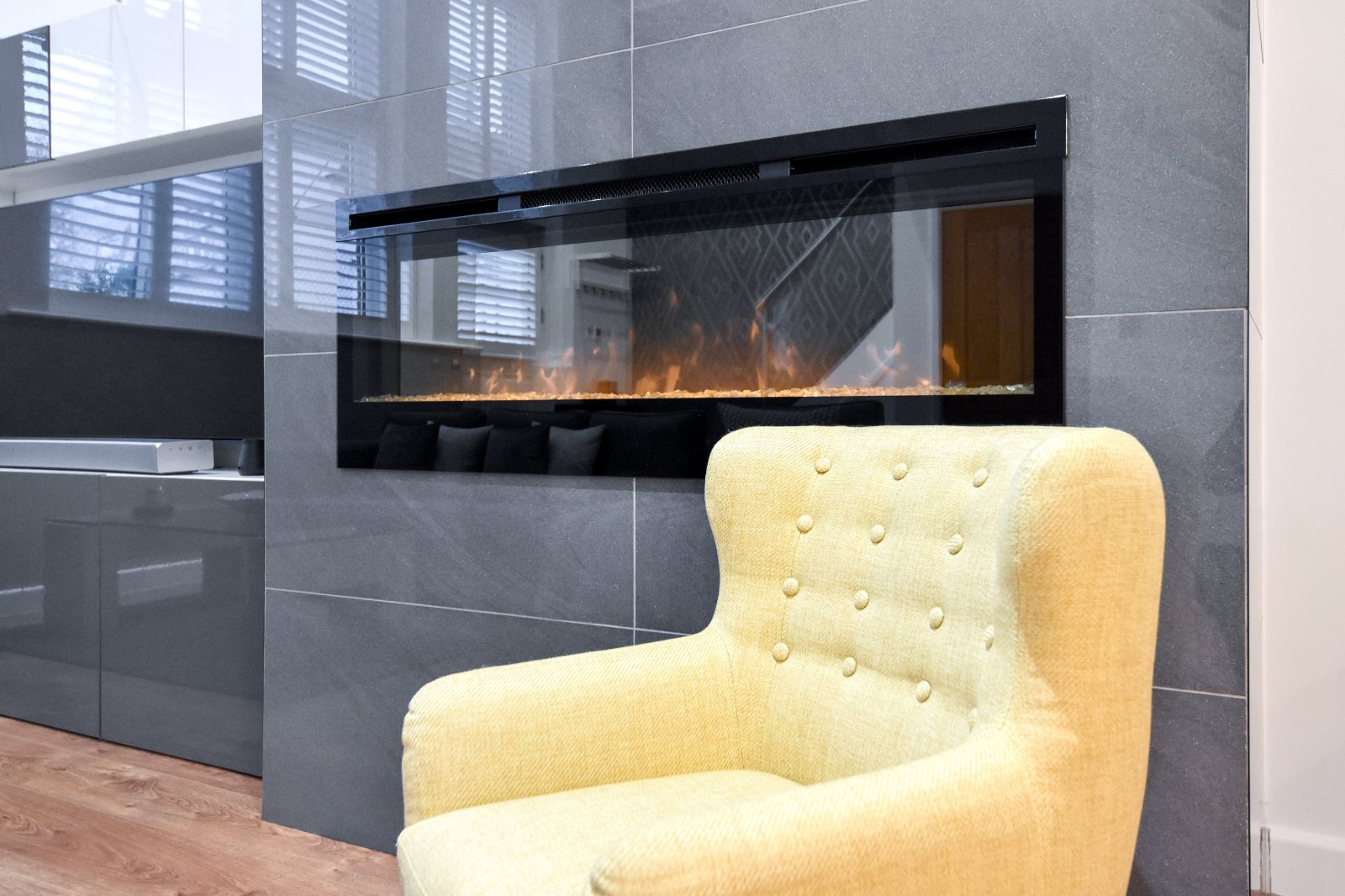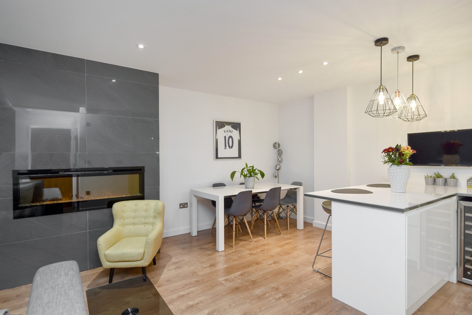 At the forefront, the Living Room boasts an impressive chimney breast adorned with high gloss porcelain tiling inset with a contemporary electric fireplace with tempered glass frontage, LED flame and crystal bed.