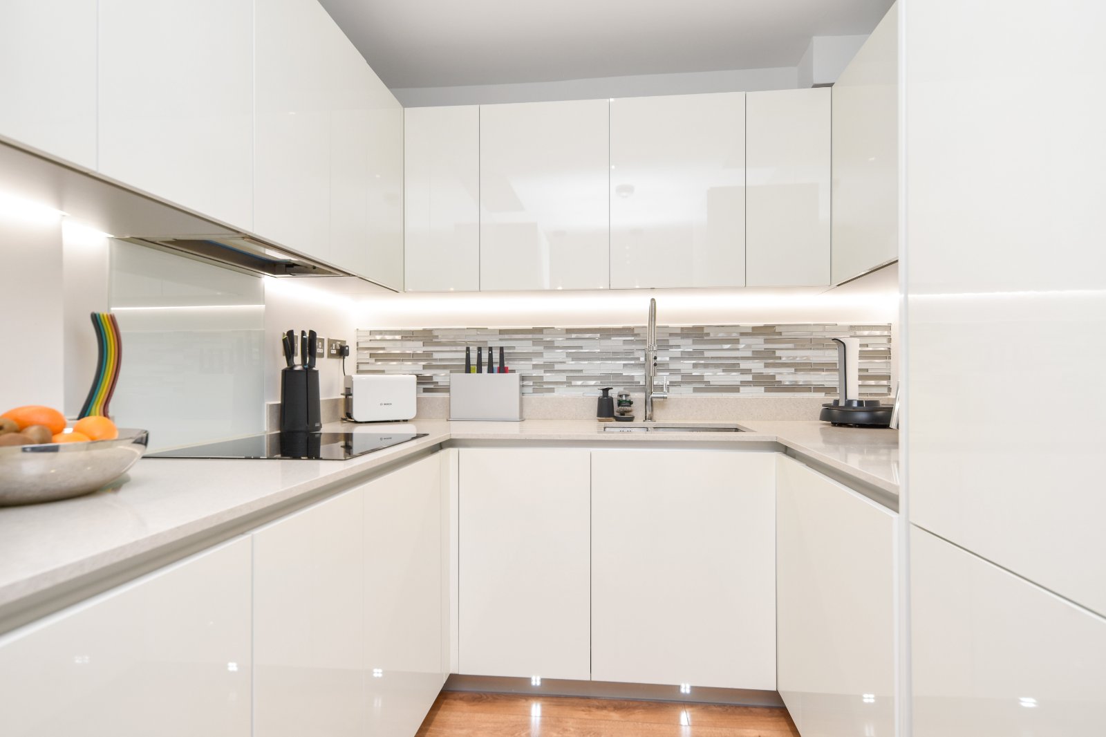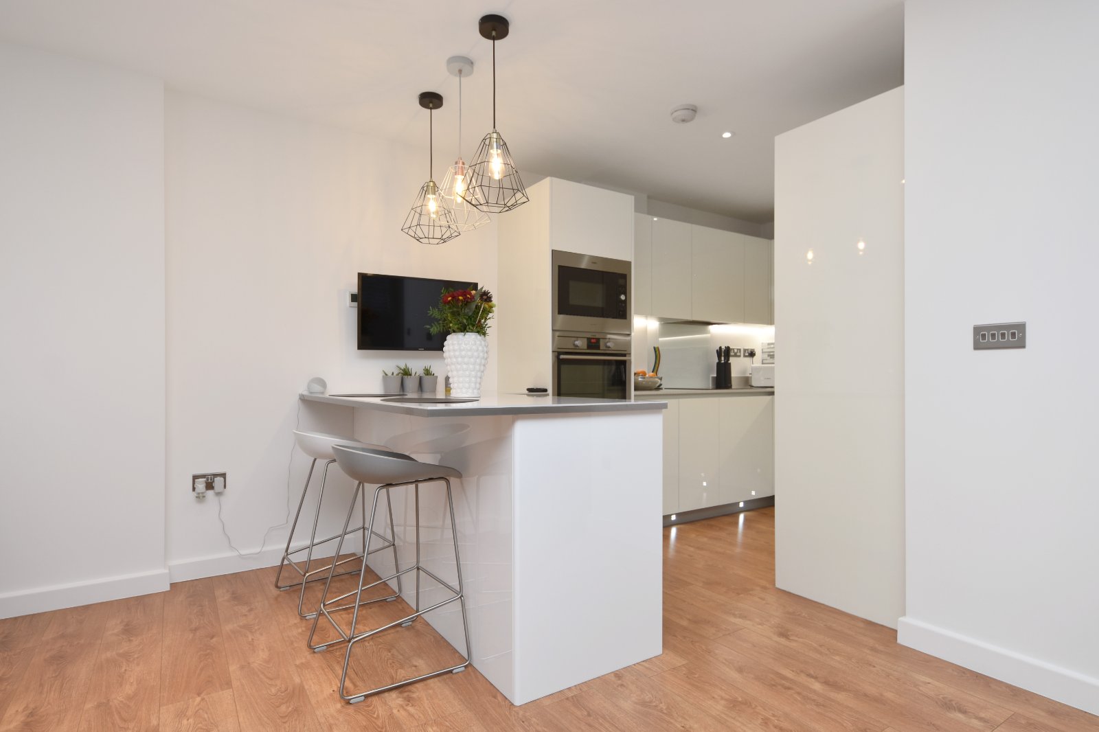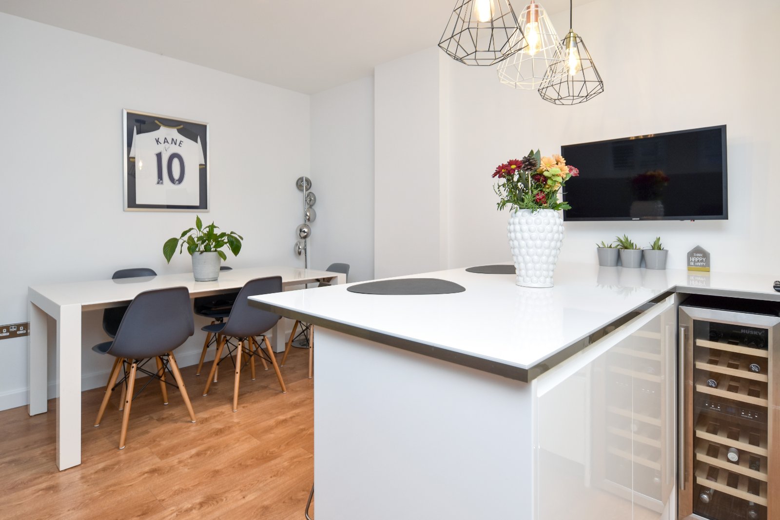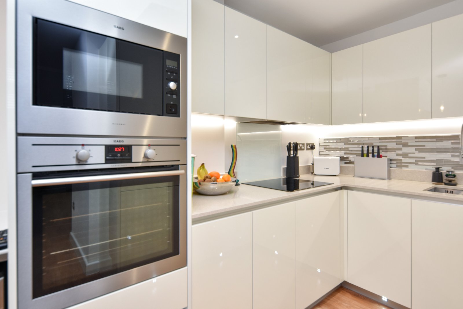 The Kitchen area comprises an impressive range of high gloss eye and base level units with 'Silestone' working surfaces over, with matching upstands, inset with one and a half stainless steel sink unit with grooved drainer and 'designer style' mixer tap over. Attractive splashback tiling. The range of integrated appliances include; 'AEG' electric oven with eye level 'AEG' Microwave over, 'AEG' four ring ceramic hob with concealed extractor canopy above and glass splashback, upright concealed fridge/freezer, under counter dishwasher. Under counter space for concealed washing machine. Concealed under unit lighting with further kickplate LED lighting. Built in slimline wine cooler (to remain). The Kitchen area extended to provide a breakfast bar seating area with further cabinetry under and attractive ceiling mounted pendant lighting over. High quality laminate wood flooring with underfloor heating. Smooth plastered ceiling inset with and recessed lighting.