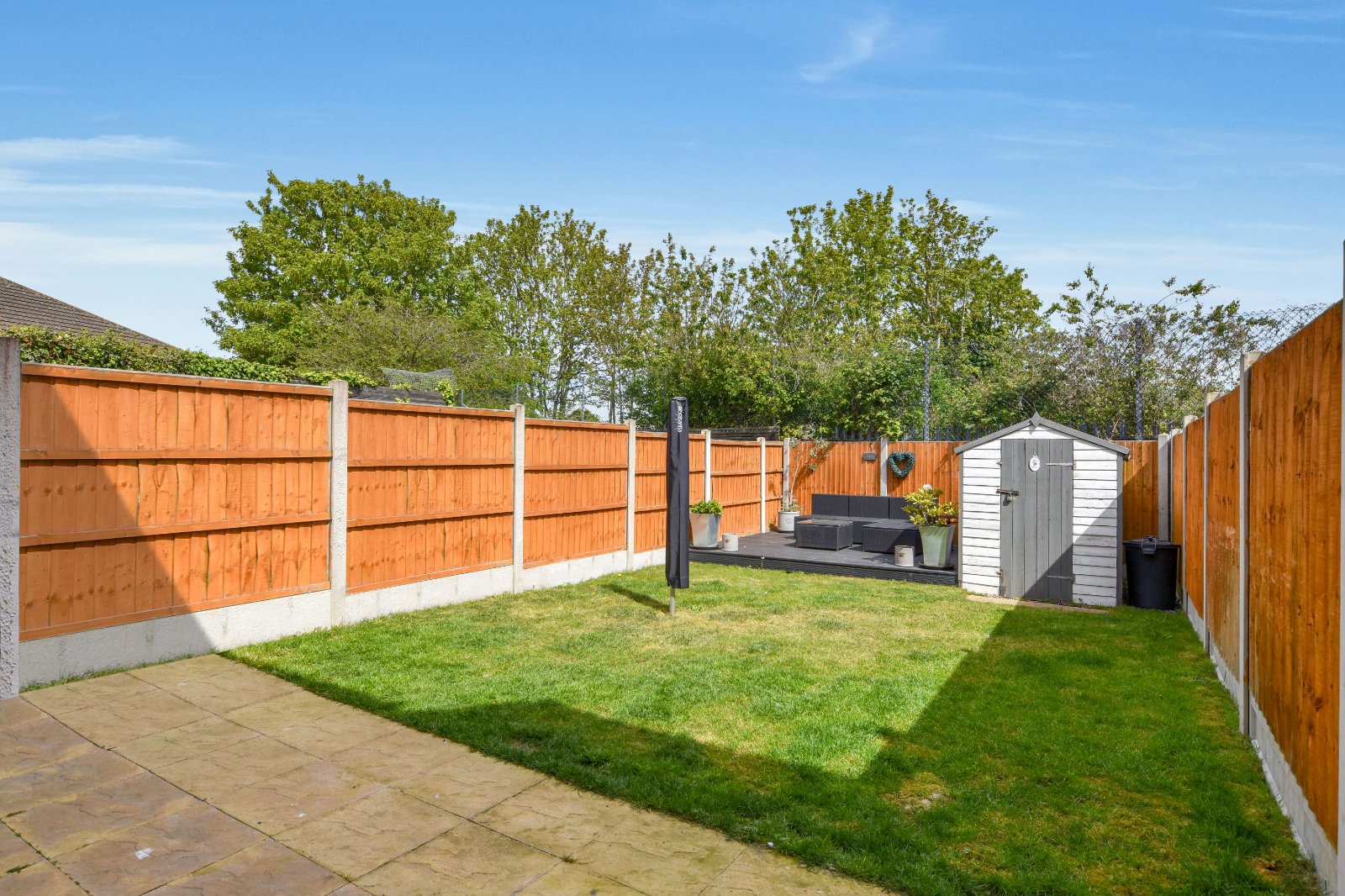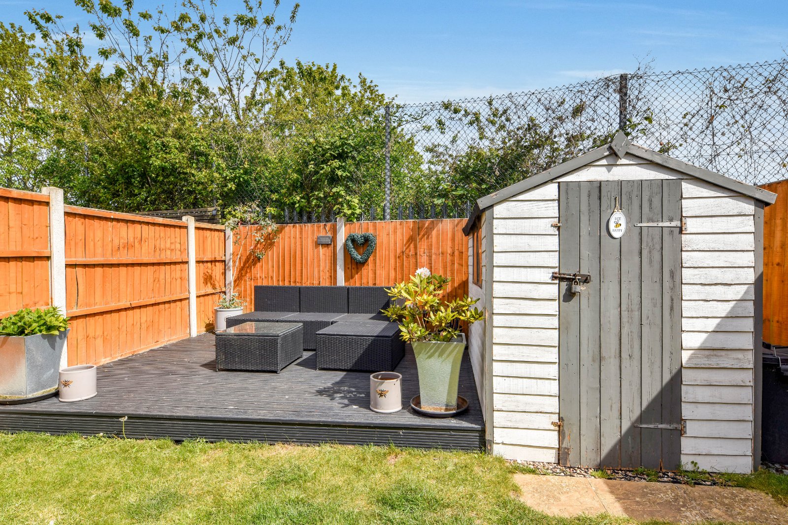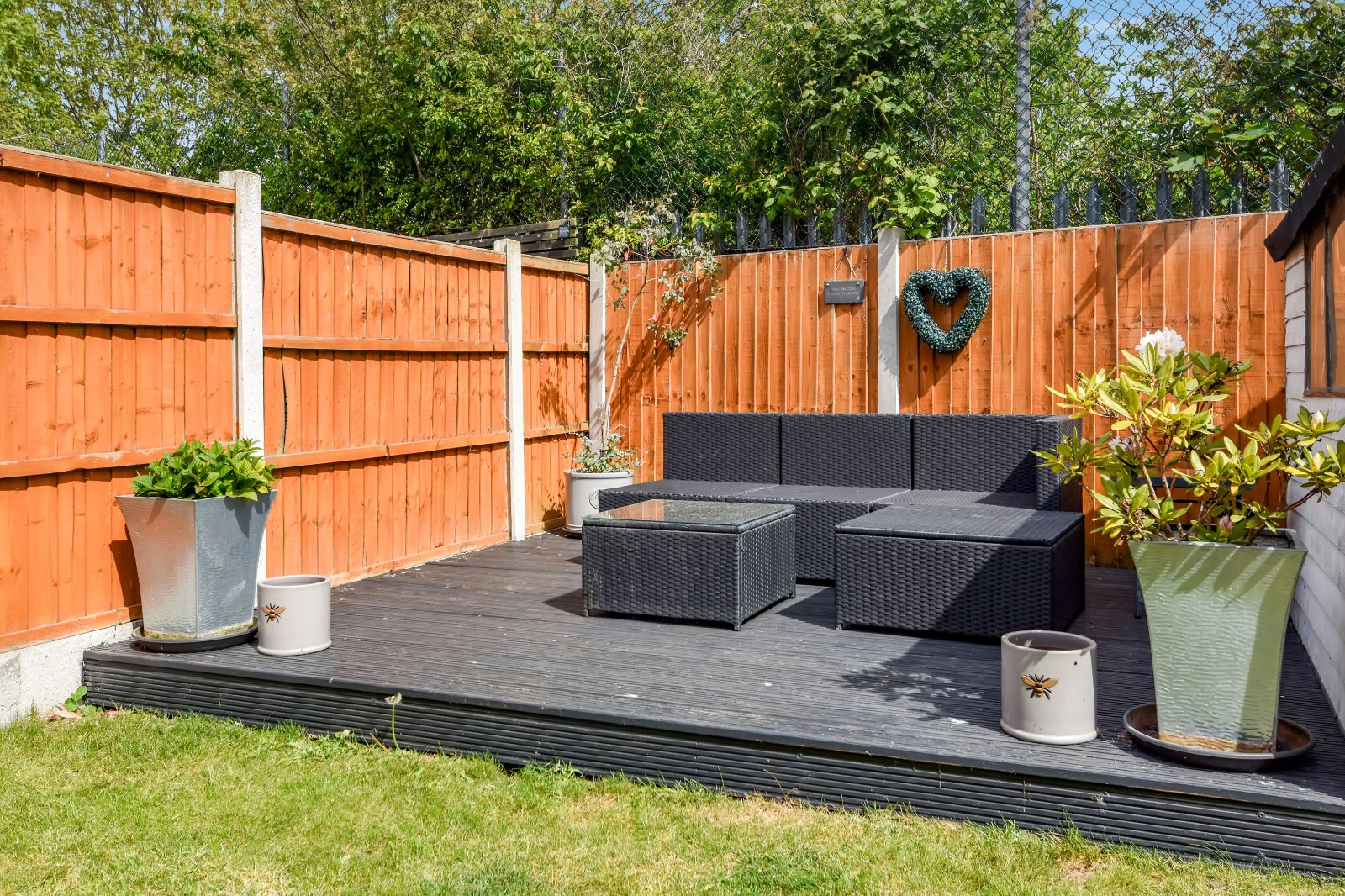 To the rear, there is a raised decked seating area, ideal for al fresco dining, alongside a timber garden shed offering useful storage. The garden is fully enclosed by panel fencing to all boundaries, providing a good degree of privacy.