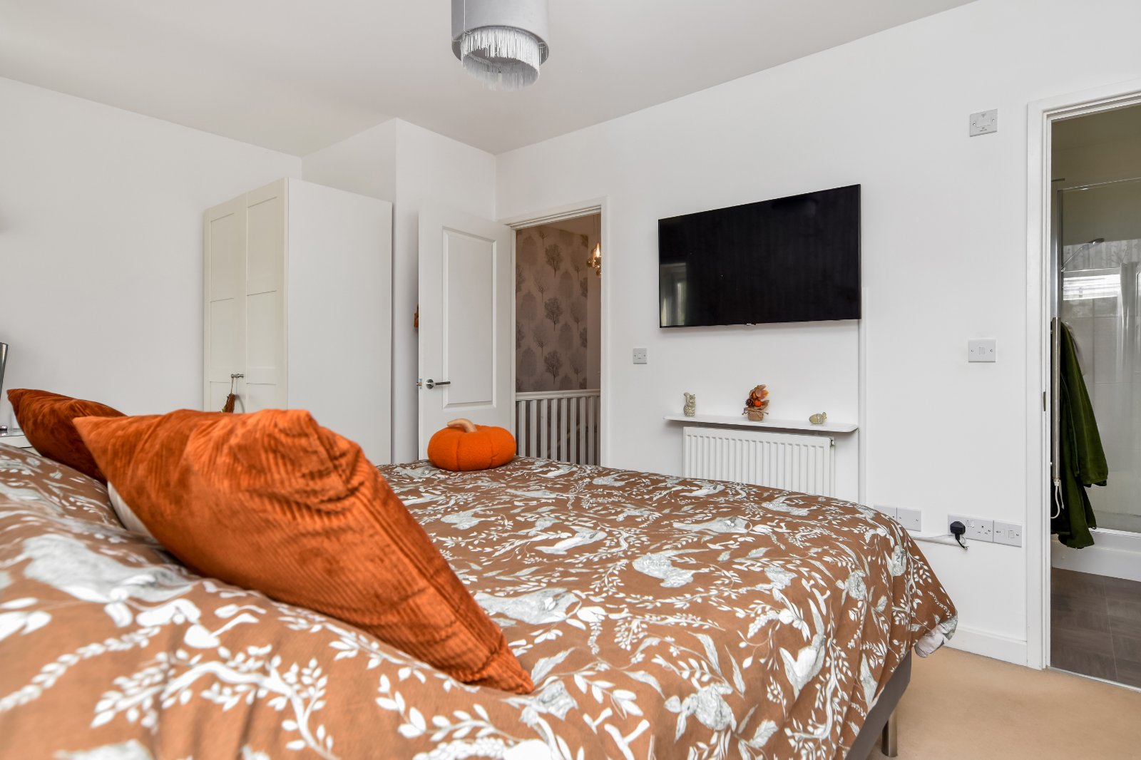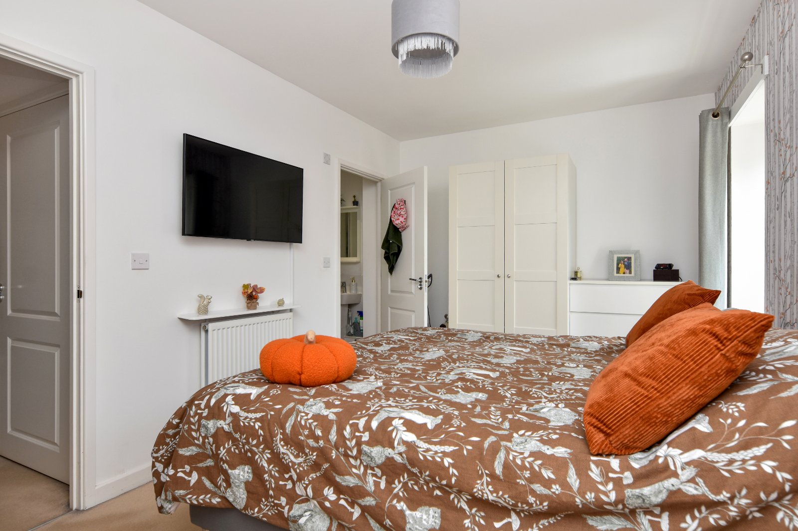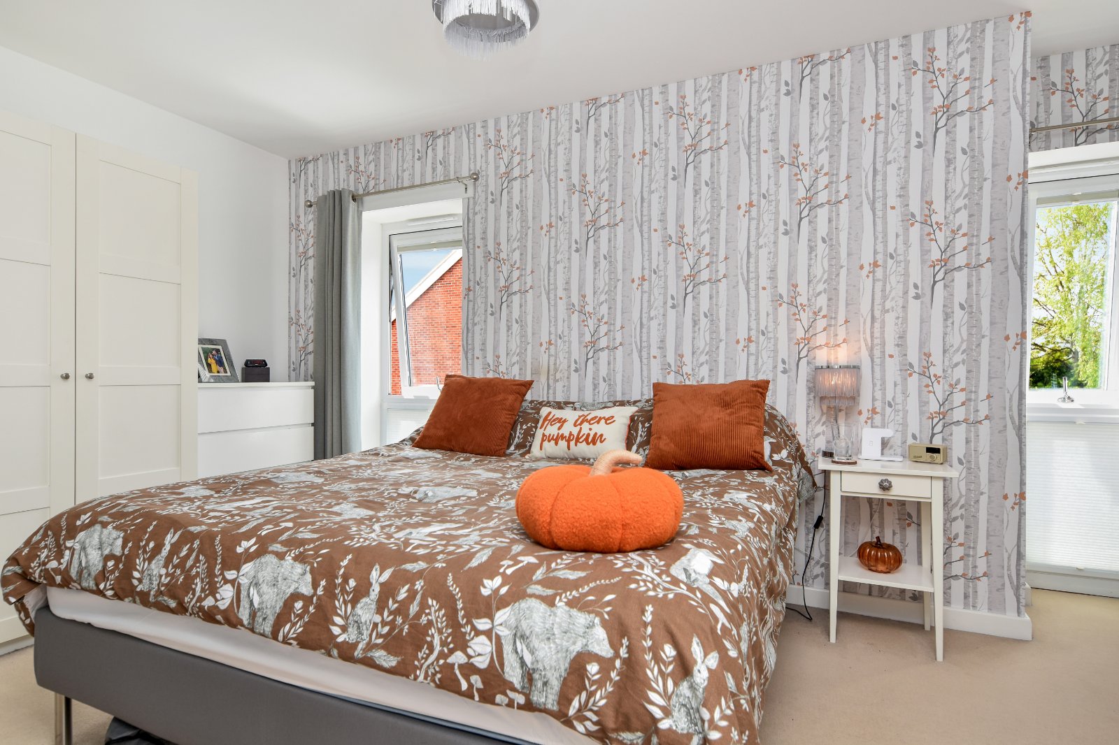 A well-proportioned principal bedroom featuring a pair of near full-height uPVC double-glazed windows to the front aspect, fitted with privacy blinds to the lower sections. Radiator. Smooth plastered ceiling with a contemporary light fitting. Panelled door leading to:
